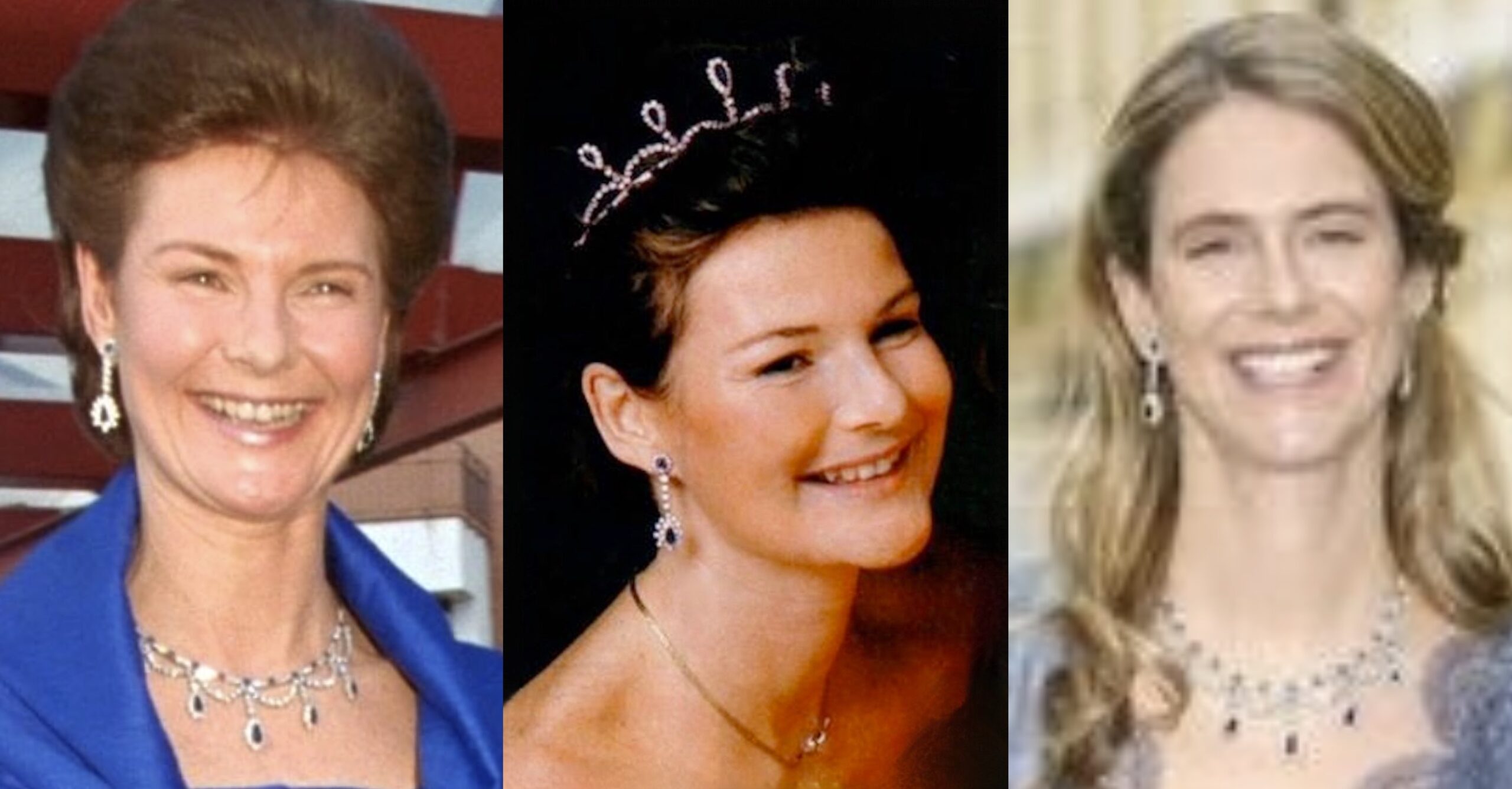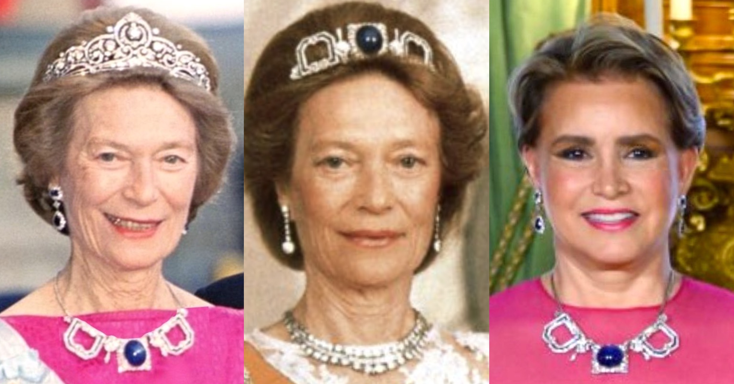 The striking Art Deco Sapphire Necklace Tiara acquired by or for Grand Duchess Joséphine Charlotte at some point in the 1980s and has been worn as a necklace quite frequently by Hereditary Grand Duchess Maria Teresa in recent years.