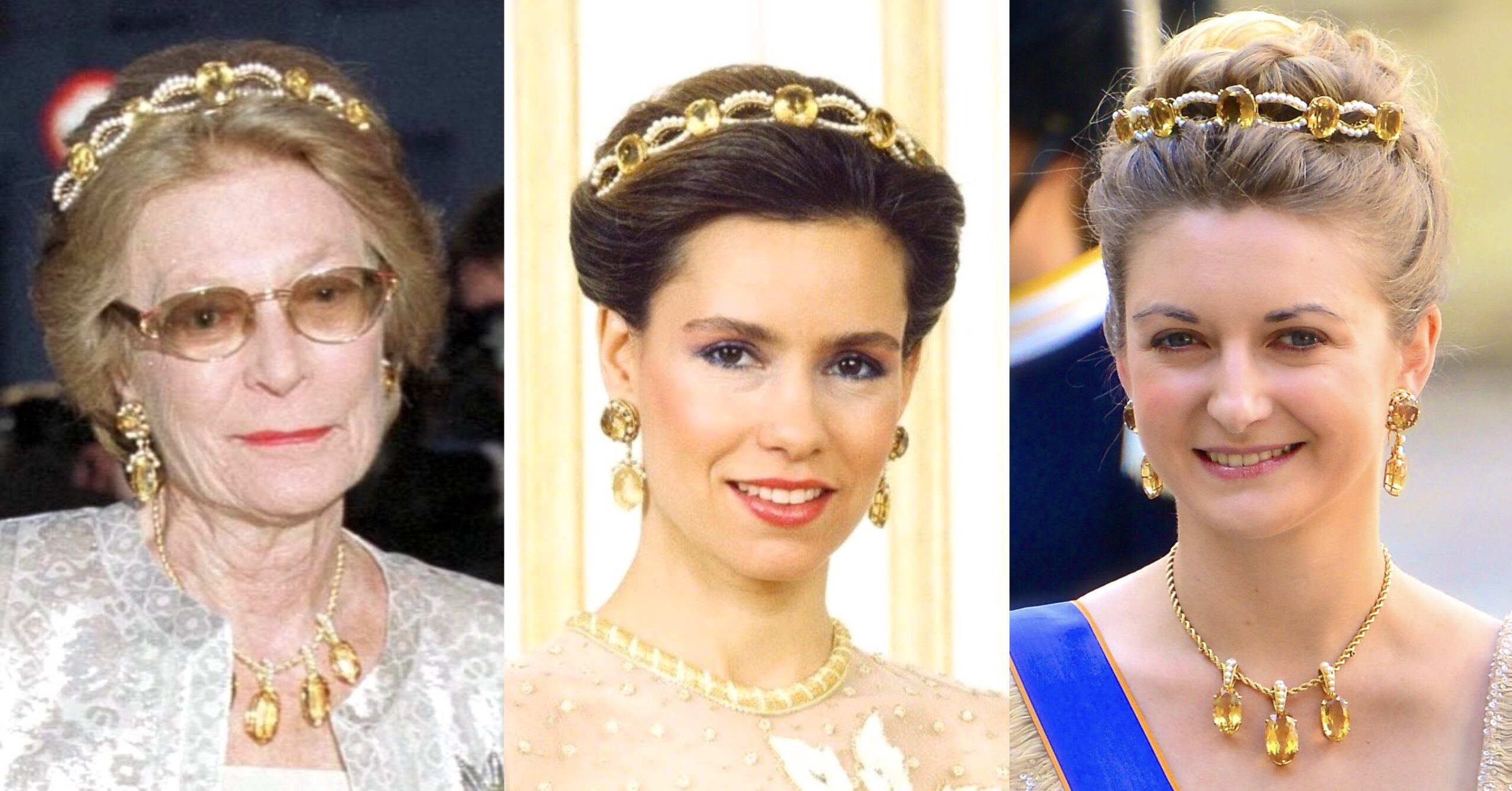 The striking Citrine and Pearl Tiara is another converted Bracelet worn as a Tiara along with a striking Citrine or Topaz Parure, which was a favourite of Grand Duchess Maria Teresa in the early years of her marriage and has now been often worn by Hereditary Grand Duchess Stéphanie in recent years.