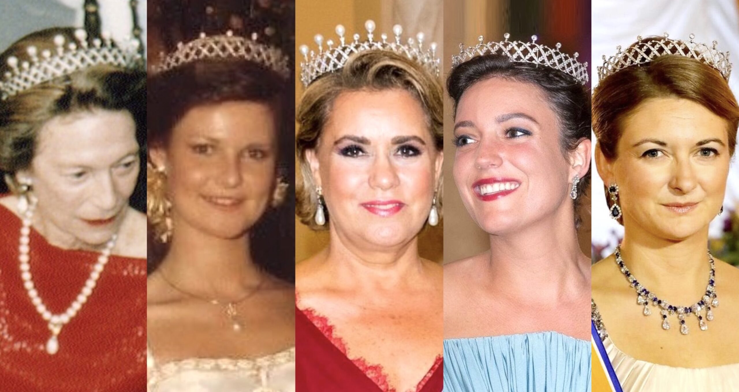 Made by Chaumet, this Pearl and Diamond Choker Tiara was acquired by Grand Duchess Joséphine Charlotte, and has been another favourite of Grand Duchess Maria Teresa, while the smaller version of the Tiara without any pearls has often been worn by Hereditary Grand Duchess Stéphanie and Princess Alexandra, who even wore it for her Wedding to Nicolas Bagory.