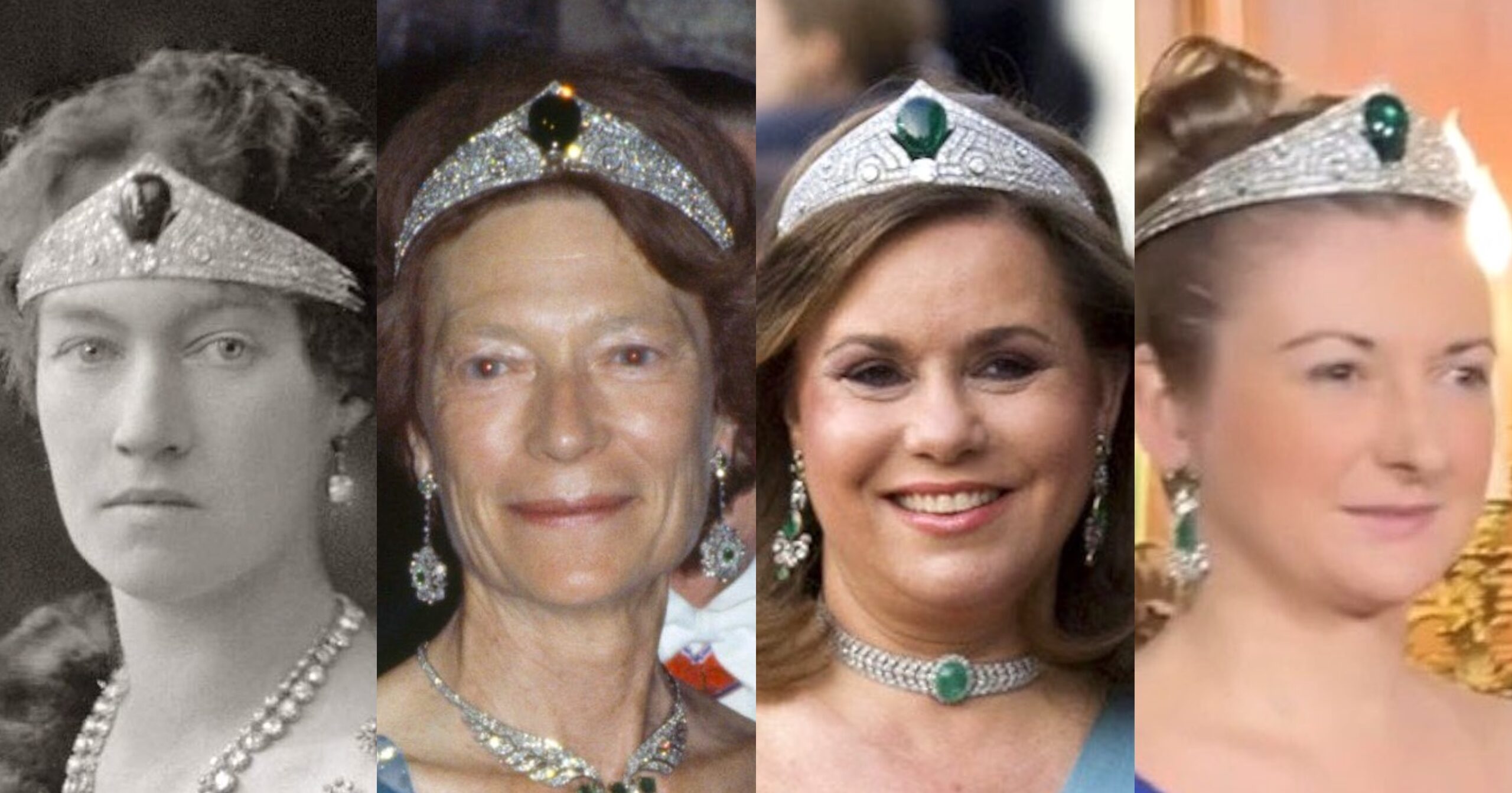 Made by Chaumet from a variety of old jewels, the Chaumet Emerald Tiara was a Christmas gift from Prince Felix of Luxembourg to Grand Duchess Charlotte in 1926, which became an iconic part of her public image and is said to have inspired the famous Wonder Woman Tiara. The Tiara was infrequently worn by Grand Duchess Joséphine Charlotte, but was a favourite of Grand Duchess Maria Teresa in the early 2000s, though it has been mostly worn by Hereditary Grand Duchess Stéphanie and Princess Alexandra in recent years.
