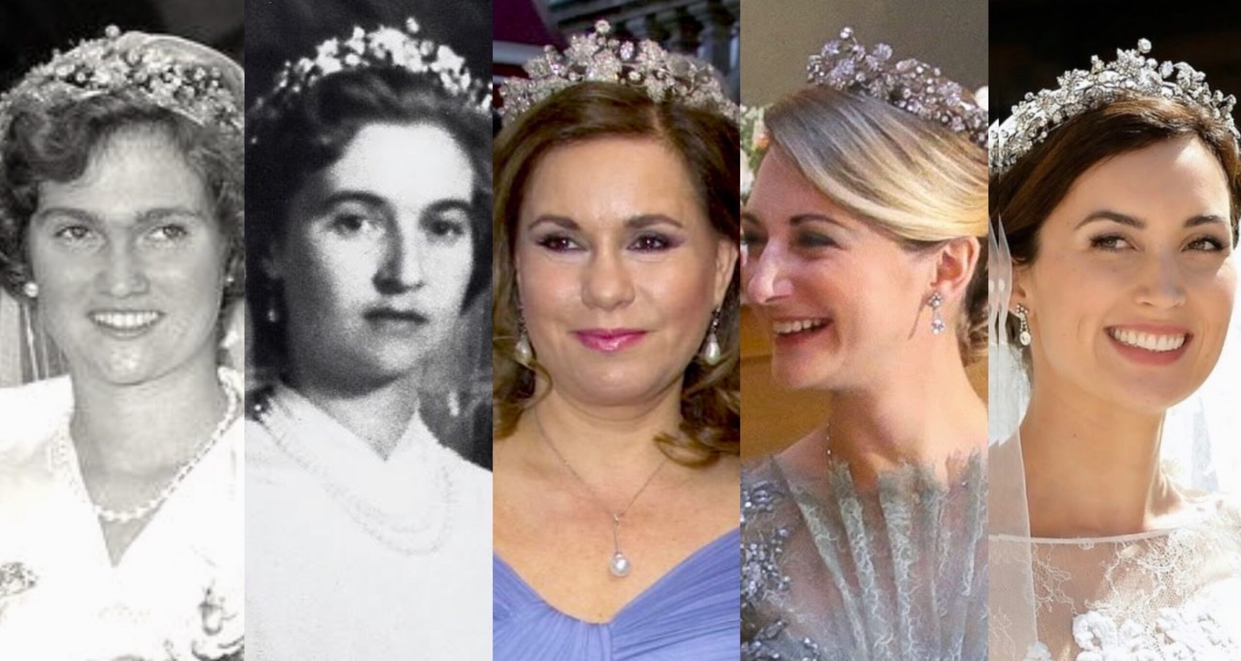 A so-called ‘wedding tiara’ of the Grand Ducal family, the Vine Leaves Tiara was worn by the four daughters of Grand Duchess Charlotte at their weddings, Hereditary Grand Duchess Stephanie at her Wedding Gala, and Princess Claire at her Wedding. Grand Duchess Maria Theresa has worn the Tiara a few times, most recently for an interview she did with ELLE Luxembourg.