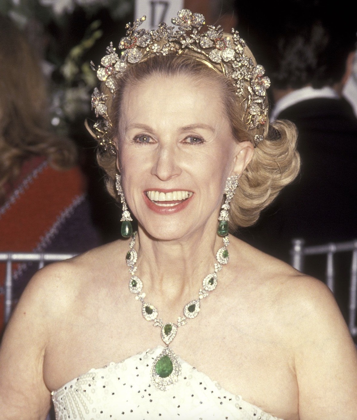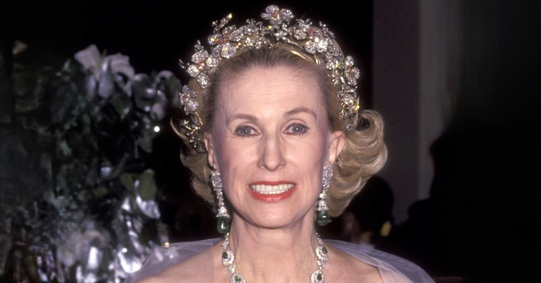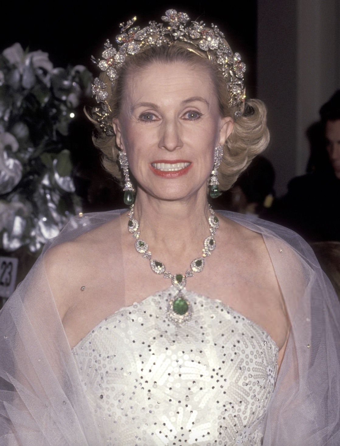 In her later years, Marylou Whitney wore the Diamond Wildflower Tiara for the Opening Night Performance of the Metropolitan Opera House in New York City in 1991, the year before her husband’s death when she inherited a $100 million estate and dedicated the rest of her life to equine sports and extensive philanthropy, particularly in performing arts and women’s health, until her passing in 2019.