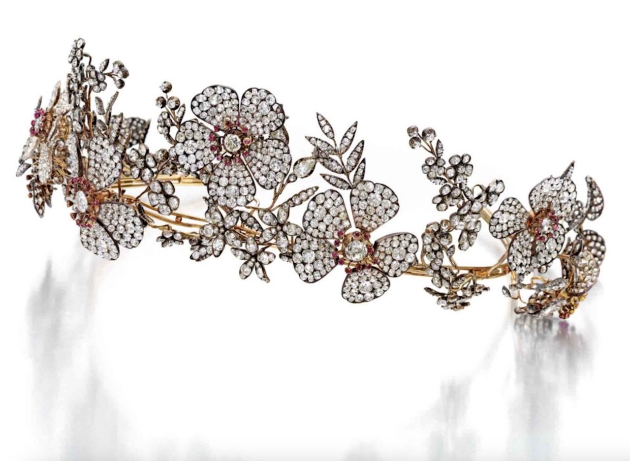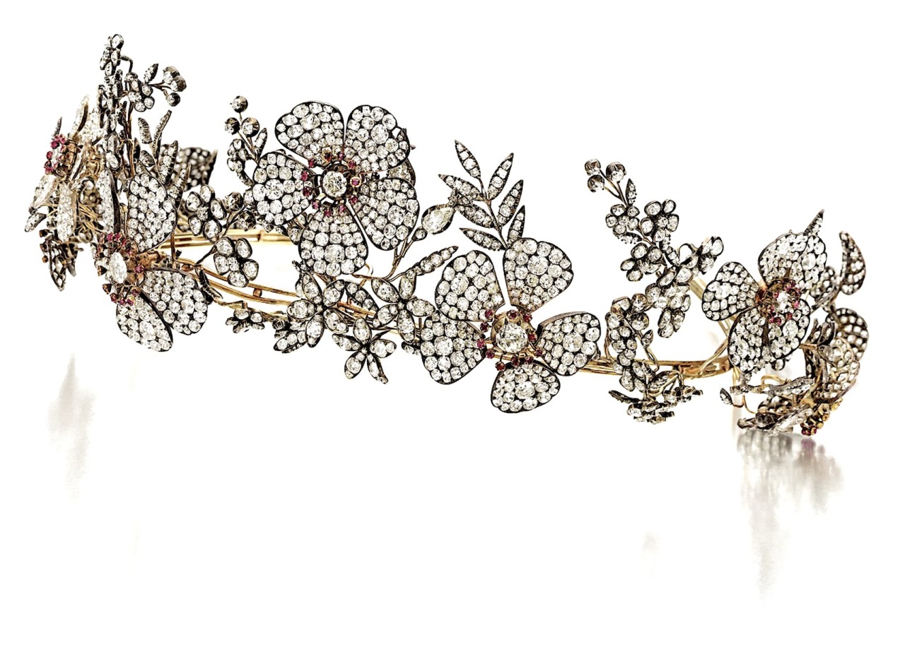 A magnificent 19th century Tiara of garland design, featuring floral and foliate motifs pavé-set with old mine, old European, pear, single and rose-cut diamonds, accented with cushion-cut and round rubies, it features 75 rubies and 1,900 diamonds, which are set in silver and gold in the motif of wild roses and dew drops en tremblant.