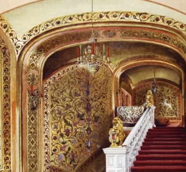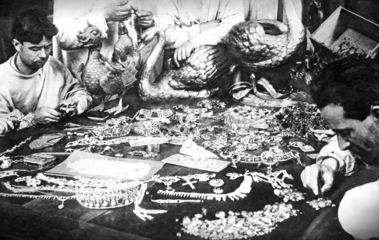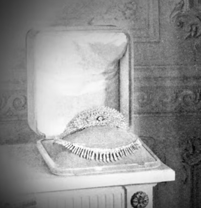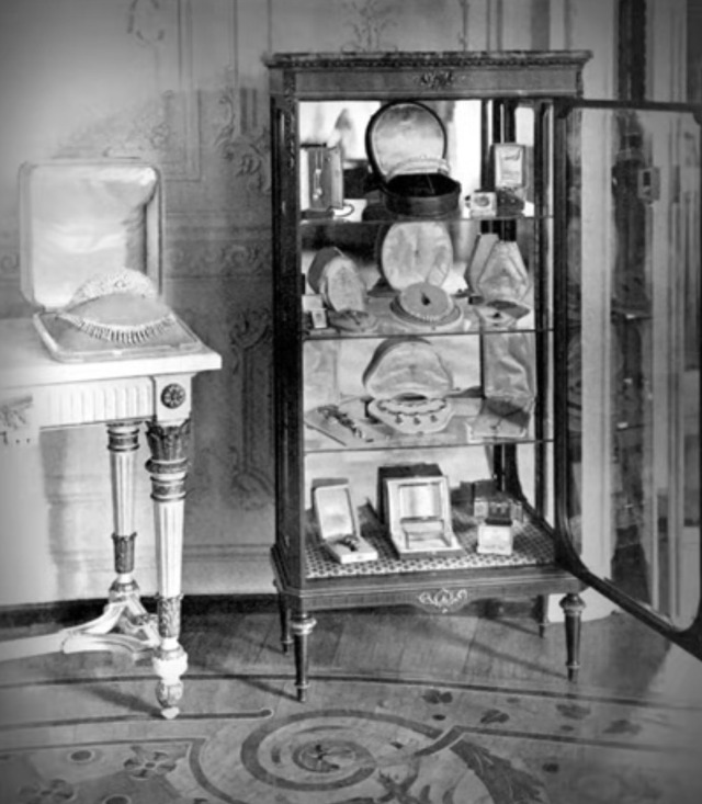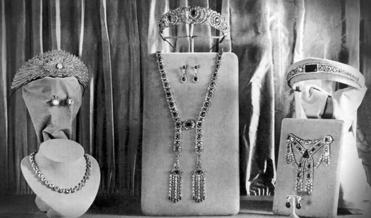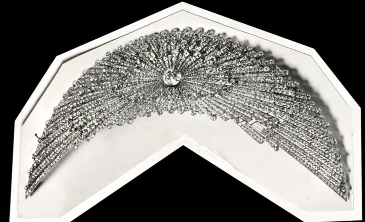 The treasure remained hidden until 1925, when workmen repairing the Palace discovered the Jewels underneath the staircase, which consisted of 13 tiaras, 25 necklaces and 250 brooches, all of which were filmed and photographed when being dismantled by the Bolsheviks, with the metals melted down while the stones were sold abroad. The Chaumet Sunburst Tiara was also pictured and is thus lost to history.