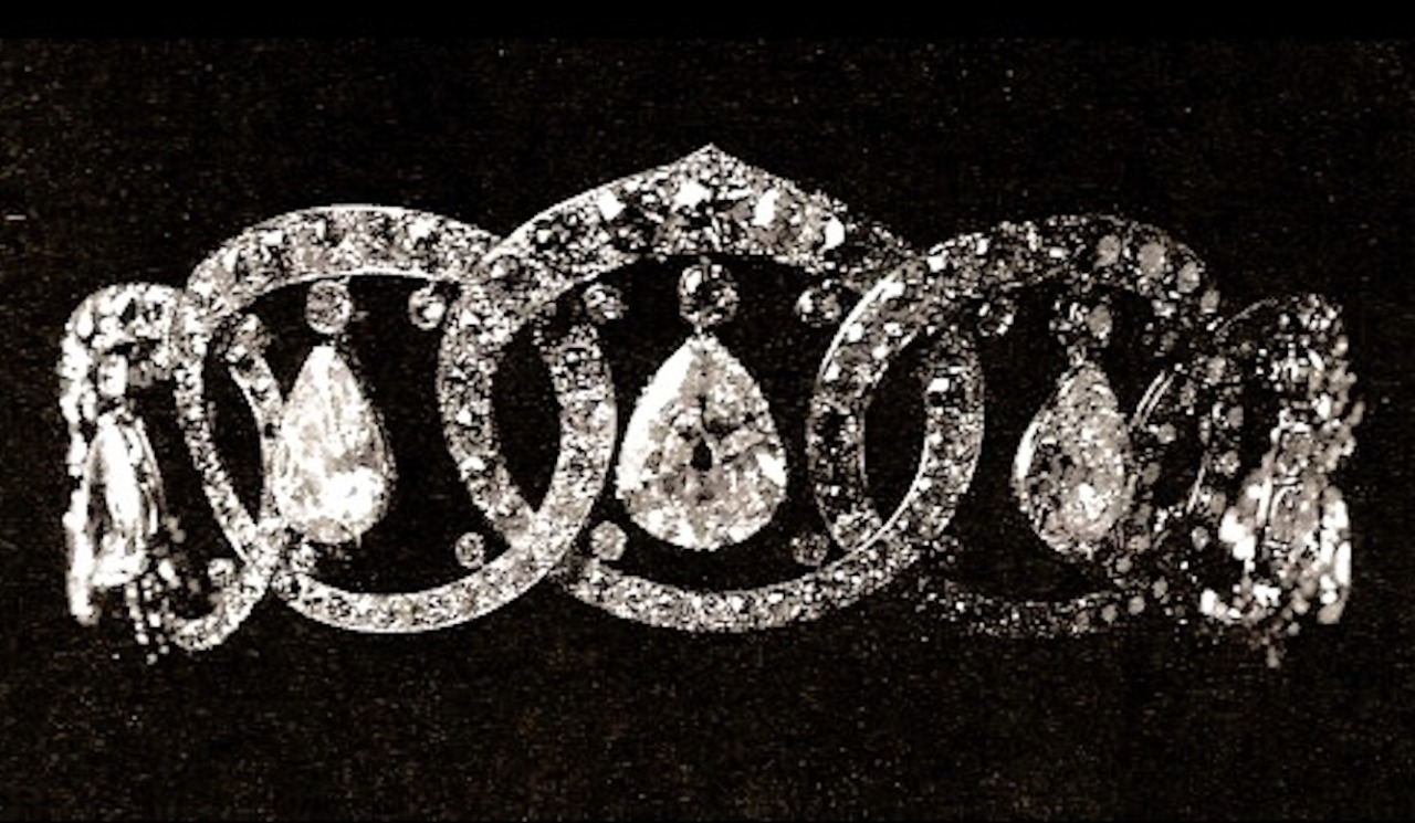 In 1911, this magnificent Damond Drop Tiara was created by Cartier from an existing Tiara that had been made in 1908. It featured seven pear-shaped Diamonds set within interlinked circular-cut diamond hoops.