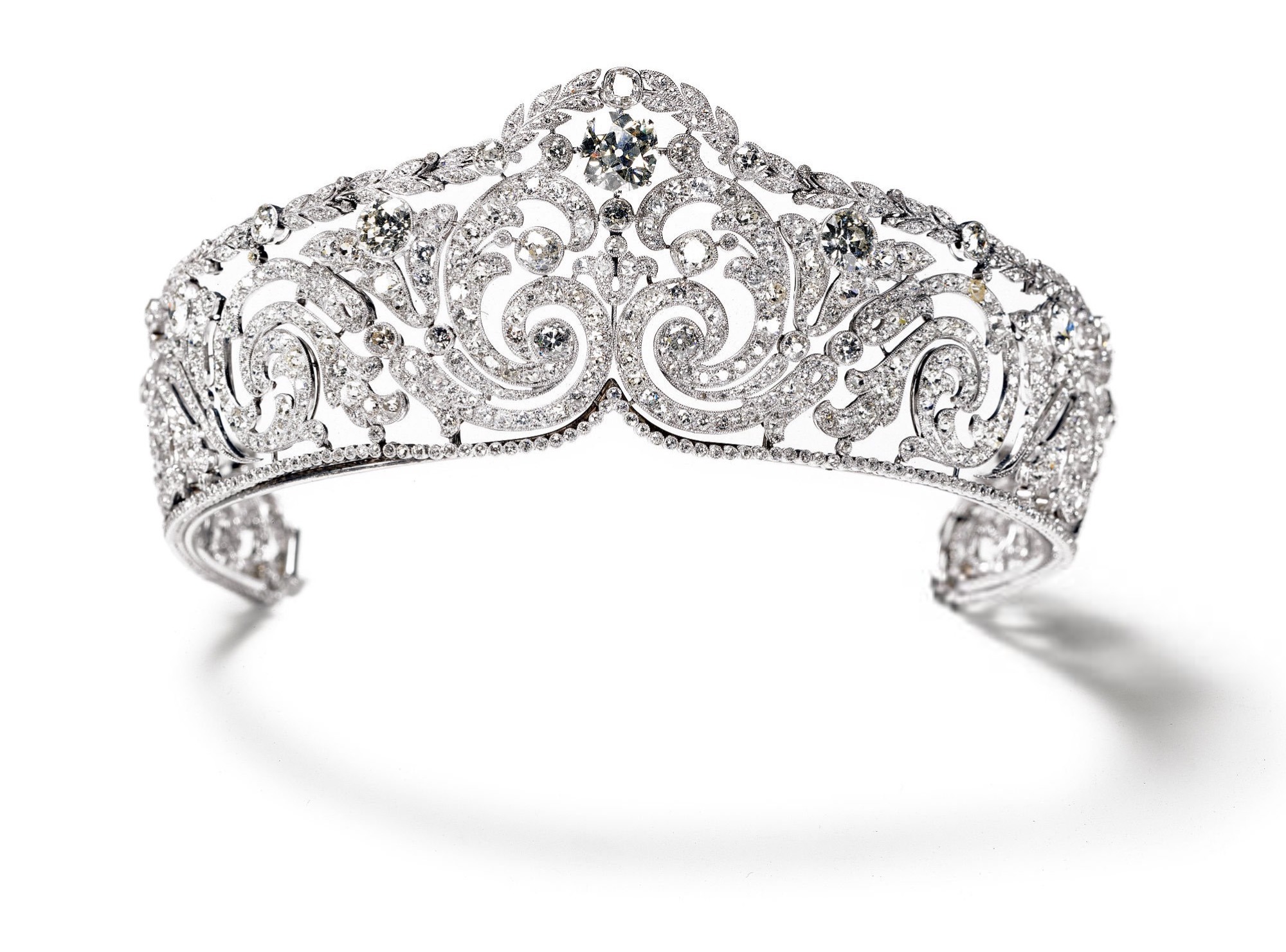 A ‘garland style’ diamond scroll tiara, composed of diamond in millegrain setting which features scrolls, foliates, and a large central cushion-shaped diamond, the Tiara was created by Cartier around 1910.