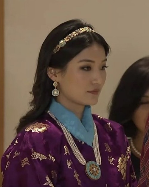 While Grand Duchess Maria Teresa of Luxembourg wore the Emerald Peacock Tiara as a Necklace, Queen Jetsun Pema was the only royal lady to wear a head ornament at the Coronation Reception, perhaps to make up for the disappointment felt not only by Royal Watchers but also many of the Royal Guests in attendance at the Coronation over the lack of Tiaras.