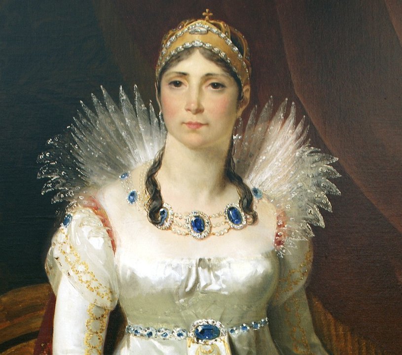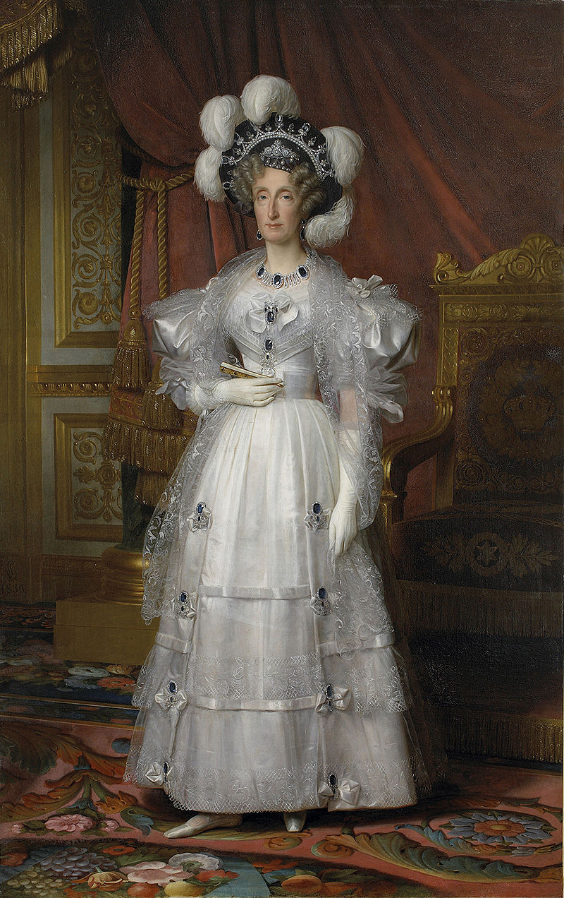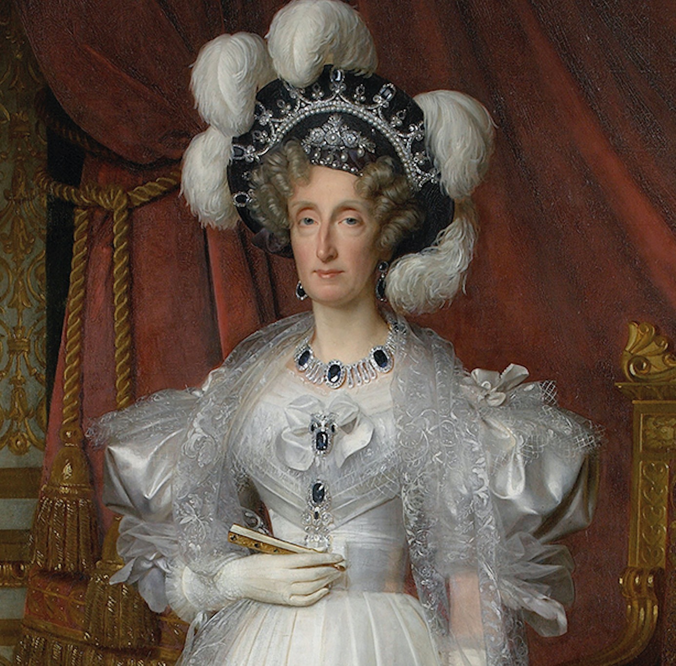 As she never considered herself the legitimate Queen of France,  Queen Marie-Amélie only wore her personal jewels throughout her husband’s reign, and was depicted wearing the entire parure with a Pearl and Sapphire Tiara from Bapst that she also owned for a portrait in the 1830s, attaching the many brooches to her skirt. The Sapphire Parure was taken with her into exile in England in 1849.