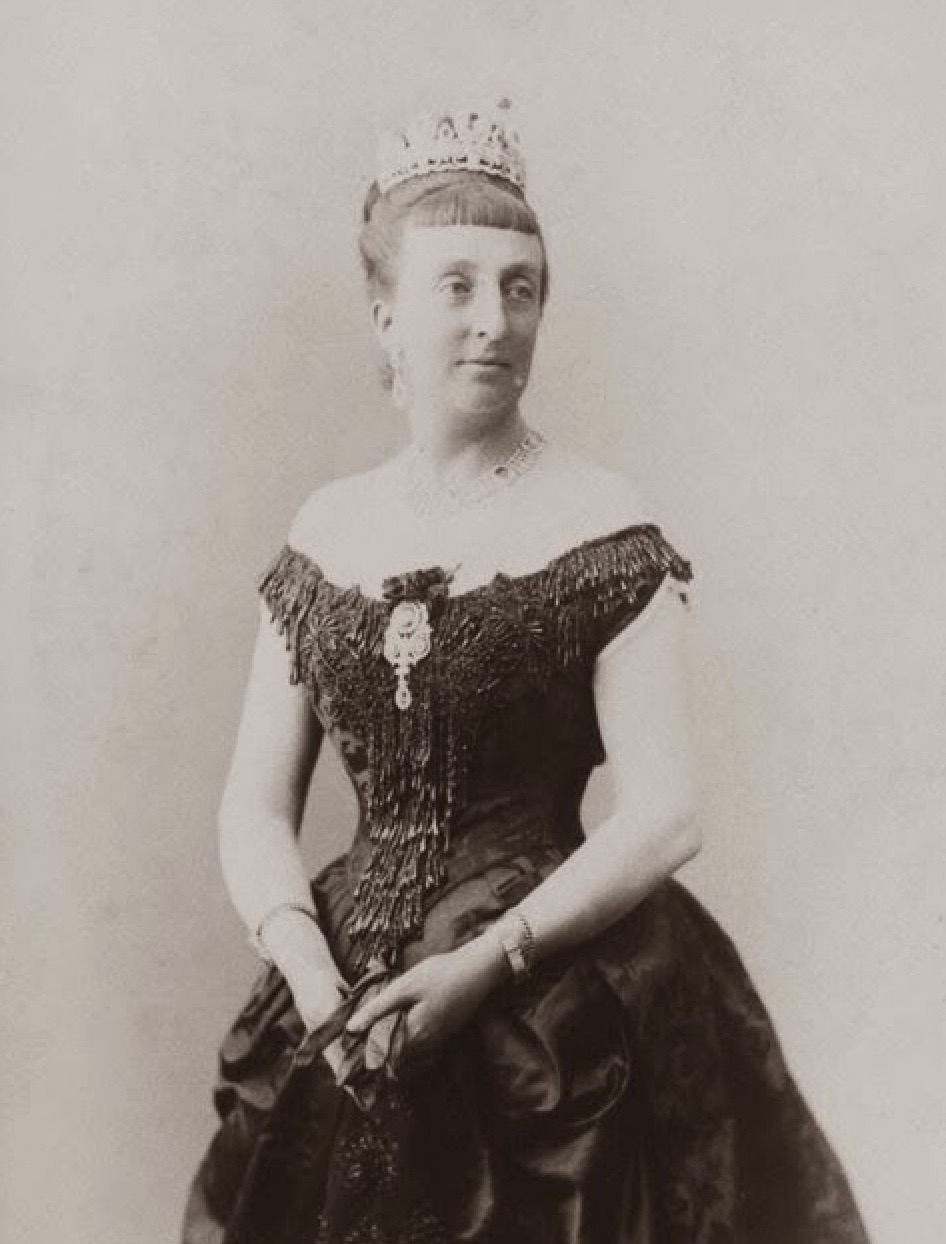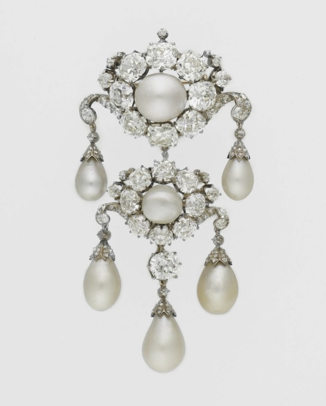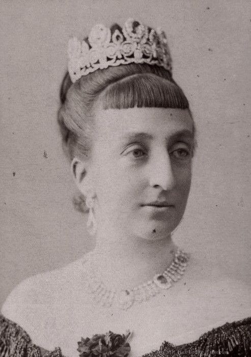 In 1864, Queen Marie-Amélie’s grandson, the Count of Paris, the Head of the House of Orléans, was marrying his cousin and her granddaughter, Princess Marie Isabelle d’Orléans, and Queen Marie-Amélie had the Diadem modified, removing four out of the nine original elements, before giving the parure as a wedding gift to the new Countess of Paris. While one of the removed elements was made into the large corsage brooch , the other three were added to her Pearl and Sapphire Parure by Bapst and left to her youngest son, the Duke of Montpensier, who was the father of Princess Marie Isabelle and she eventually also inherited the Pearl and Sapphire Parure in 1890, reuniting them in one collection.
