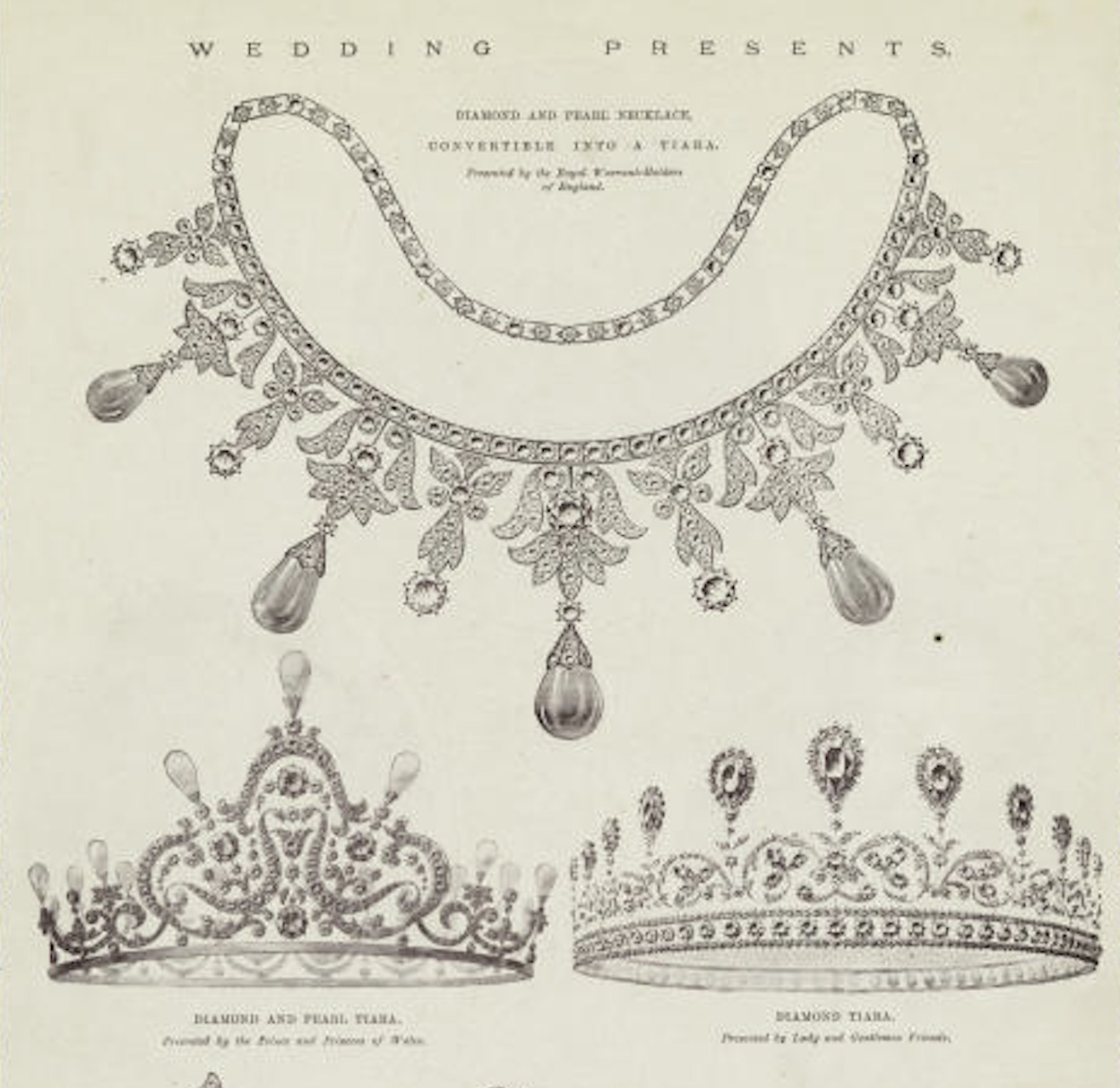 This diamond tiara with a pattern of shamrocks, topped by 18 or 20 (sources differ) large and very valuable diamonds framed by smaller diamonds, was a wedding present to the future Queen Maud in 1896 from a group of 33 friends, among them the Marchionesses of Salisbury and Londonderry.