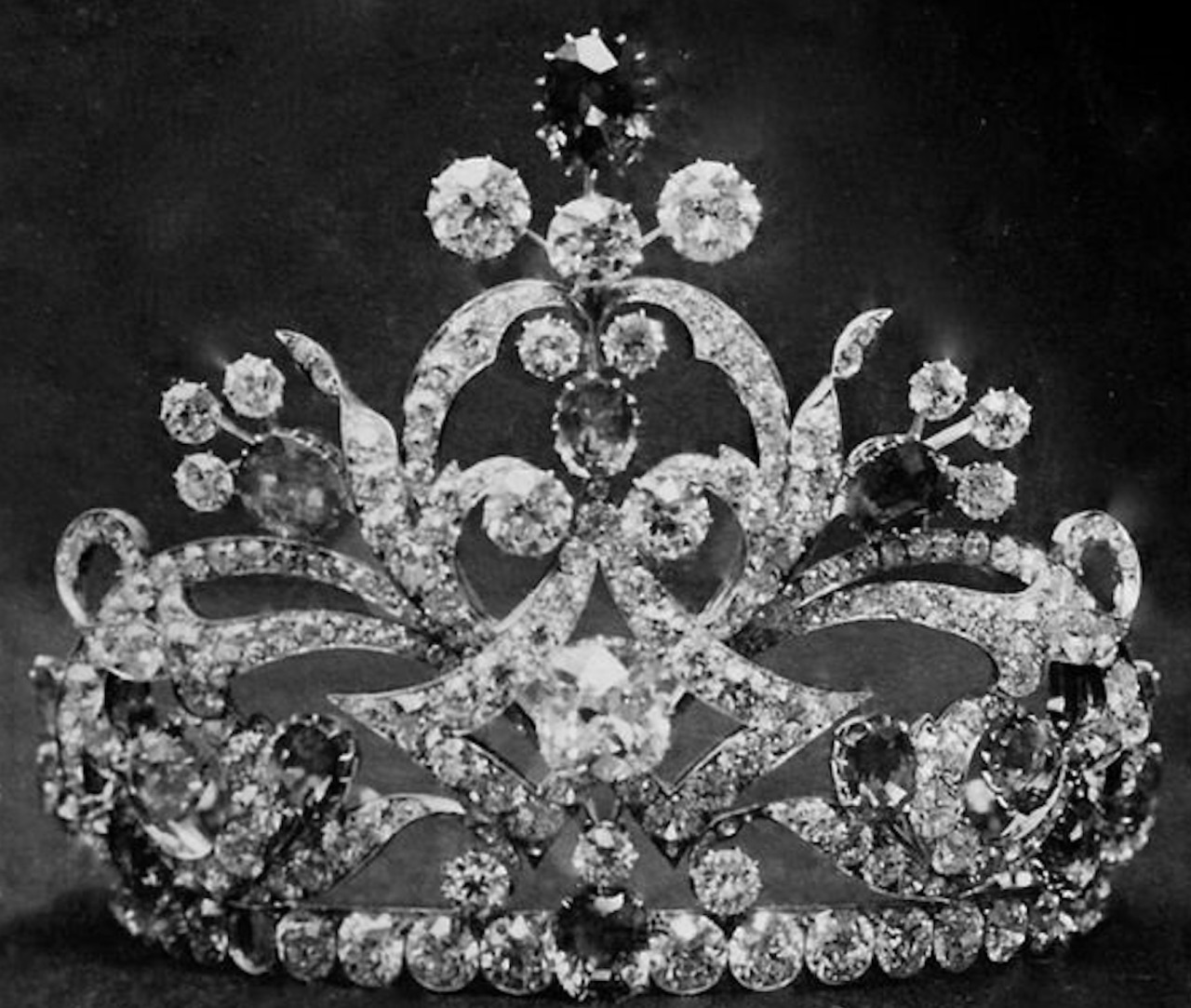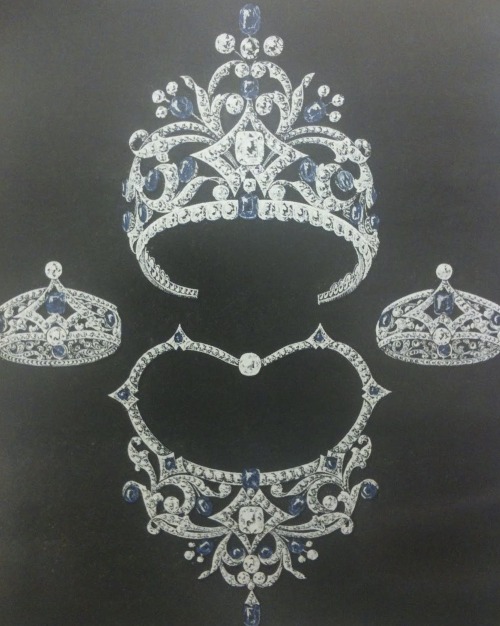 When Queen Wilhelmina of The Netherlands married Duke Heinrich of Mecklenburg-Schwerin in 1901, she received this magnificent Sapphire and Diamond Parure as a wedding gift from the Dutch People, containing more than 800 diamonds and sapphires. Created by by J.A. Hoeting with Diamonds and Sapphires supplied by Vita Israël, the Parure was composed of a Tiara, a mirrored Necklace and and a pair of Bracelets.
