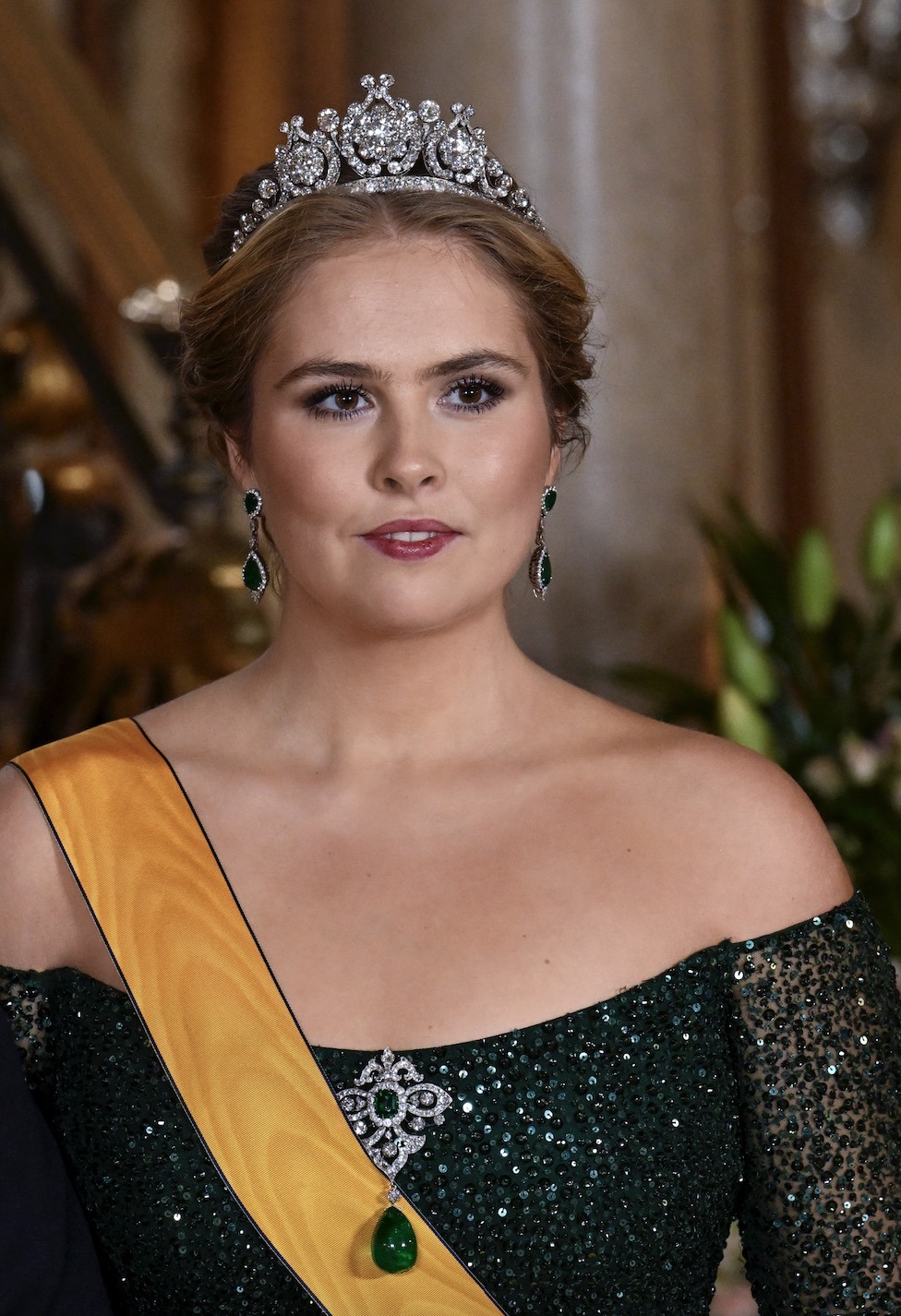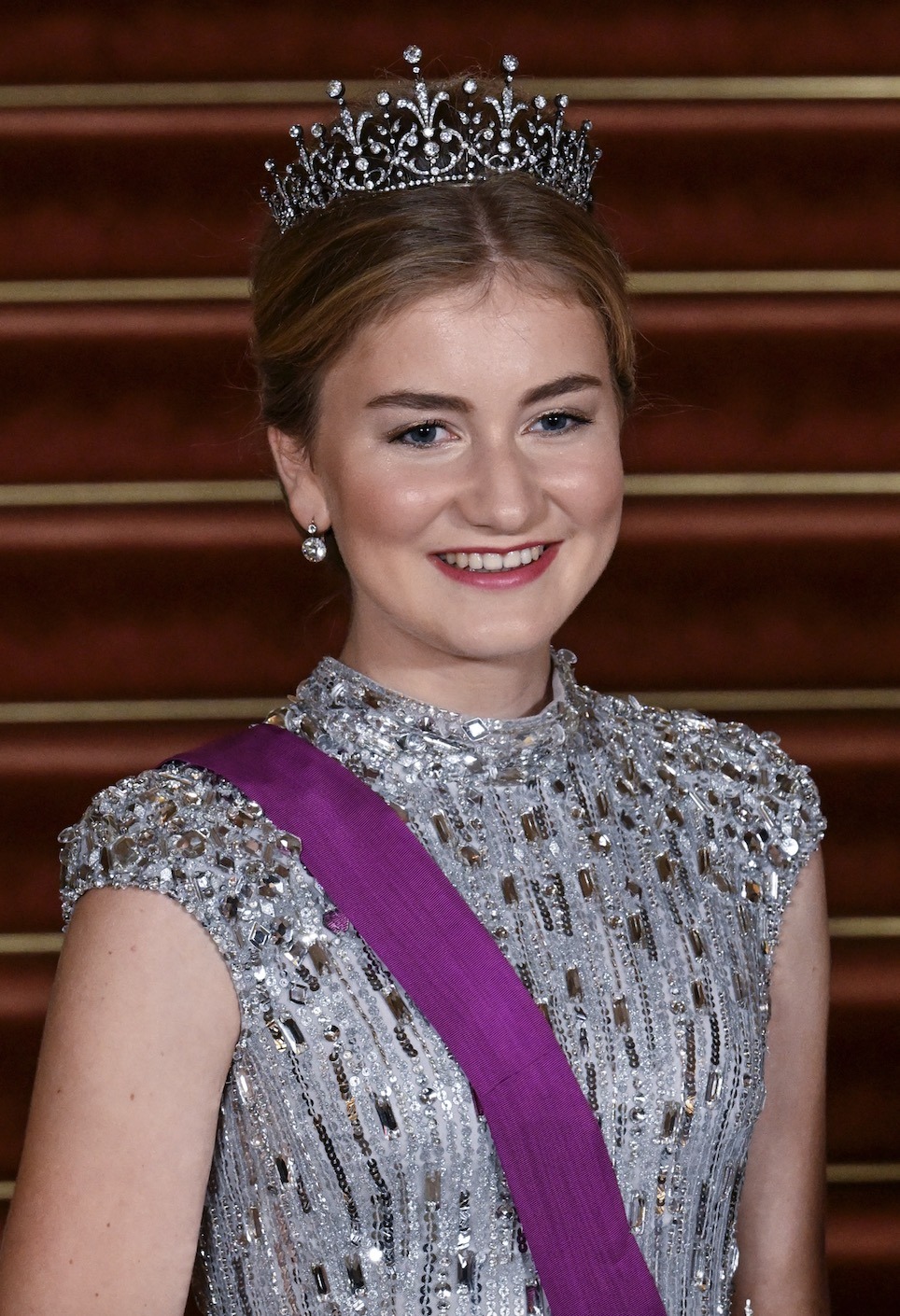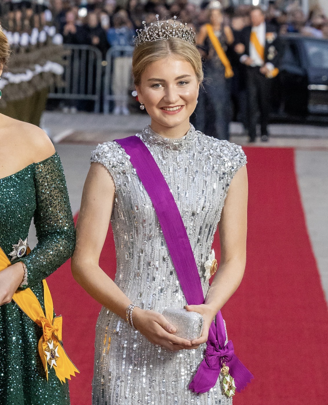 The Duchess of Brabant wore the Vestey Tiara with Diamond Earrings and the Order of Leopold.