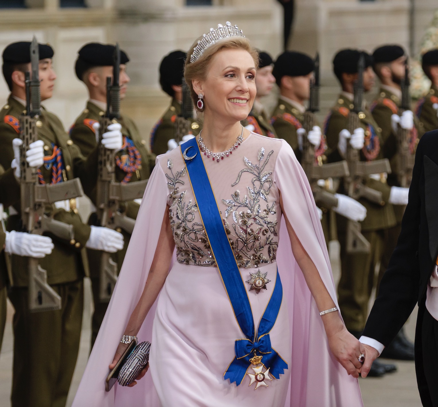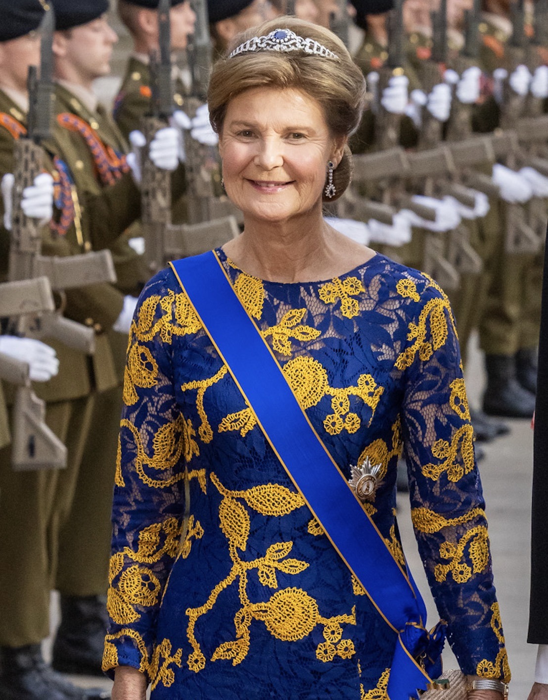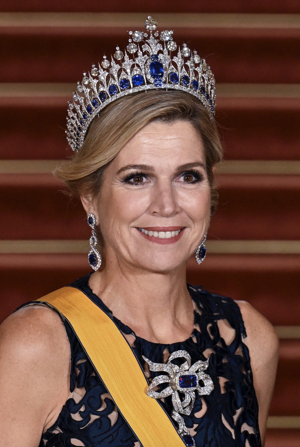 Queen Máxima of the Netherlands was wearing the Dutch Sapphire Tiara with Sapphire and Diamond Earrings, Queen Wilhelmina’s Sapphire Bow Brooch and the Order of the Gold Lion of the House of Nassau.