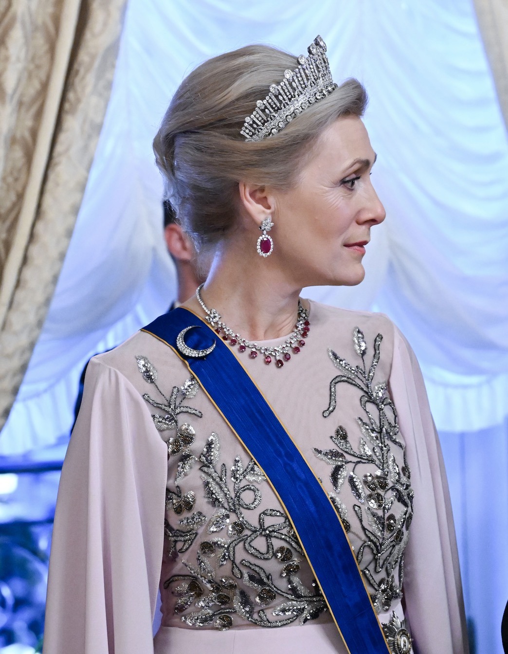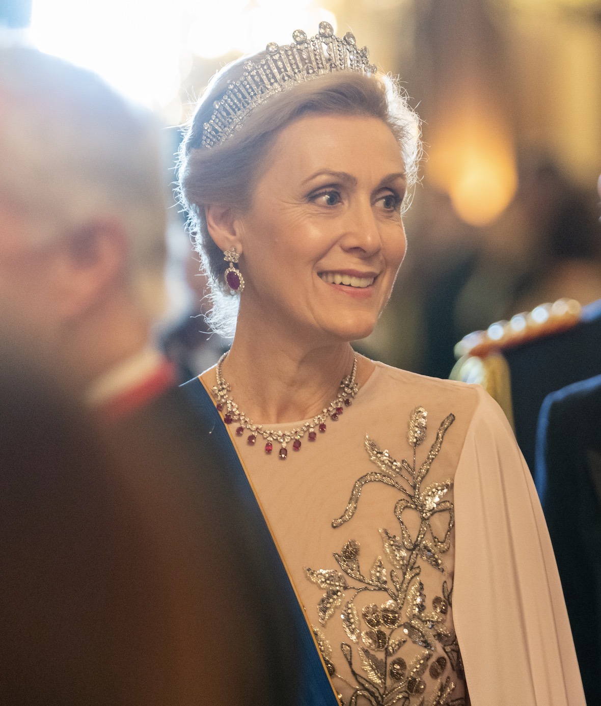 Princess Sibilla of Luxembourg wore her Art Deco Diamond Tiara and Ruby Necklace with Ruby Earrings, a Diamond Crescent Brooch and the Order of Adolphe of Nassau.