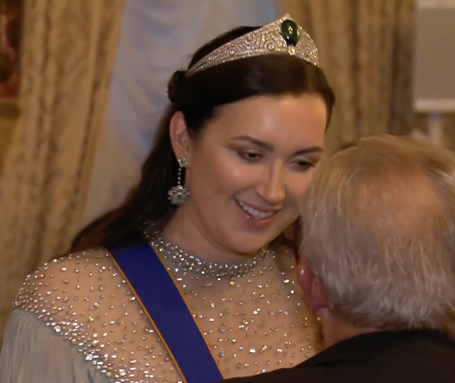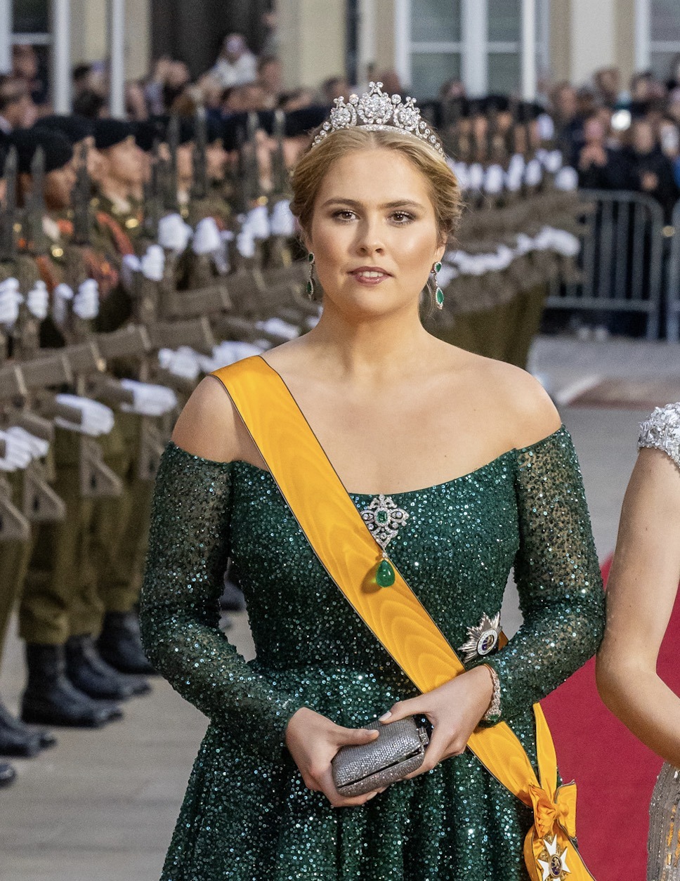 The Princess of Orange was wearing Queen Emma’s Diamond Tiara with the Dutch Emerald Pendant suspended from an Emerald Brooch, Queen Maxima’s Emerald Earrings and the Order of the Gold Lion of the House of Nassau for the first time.