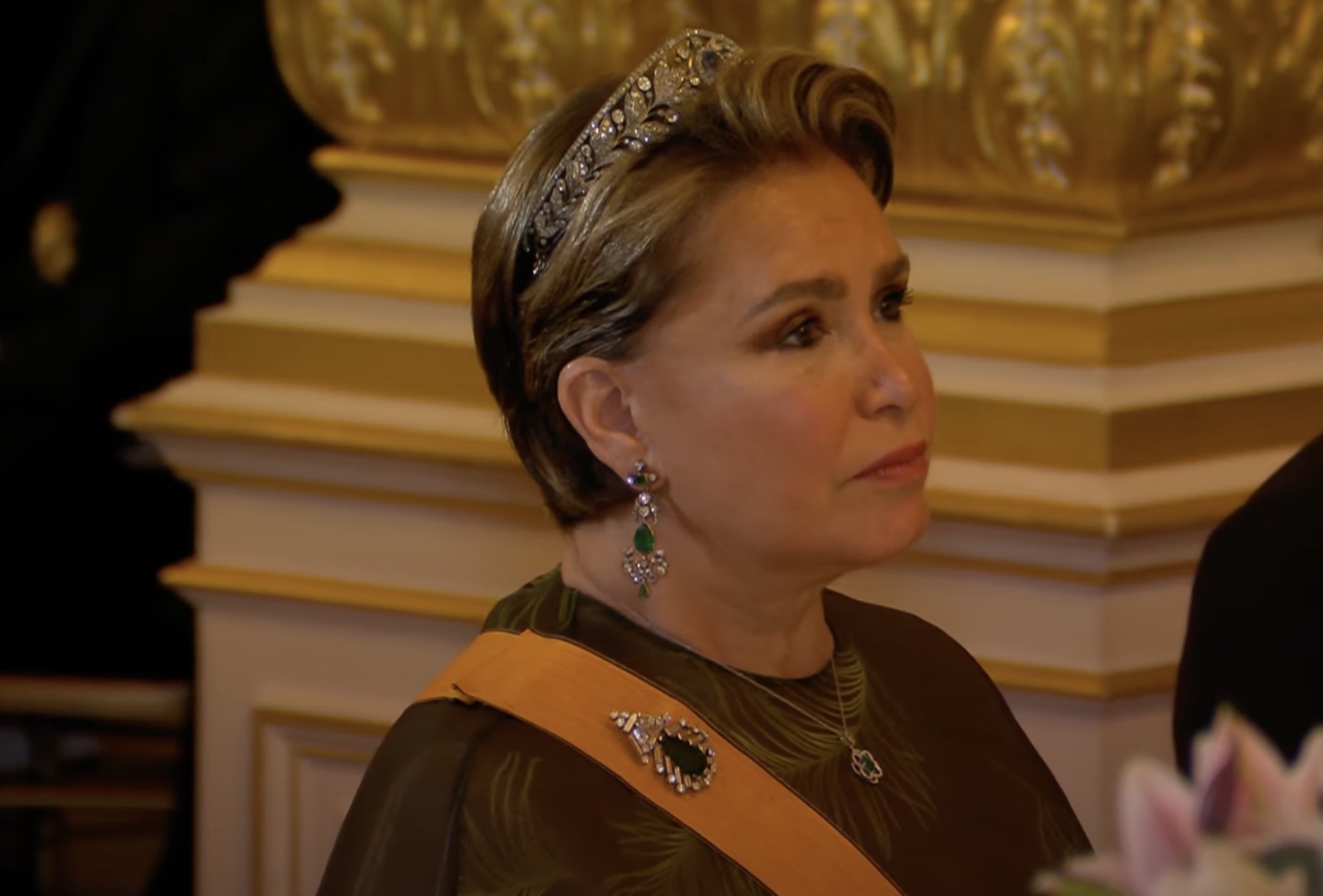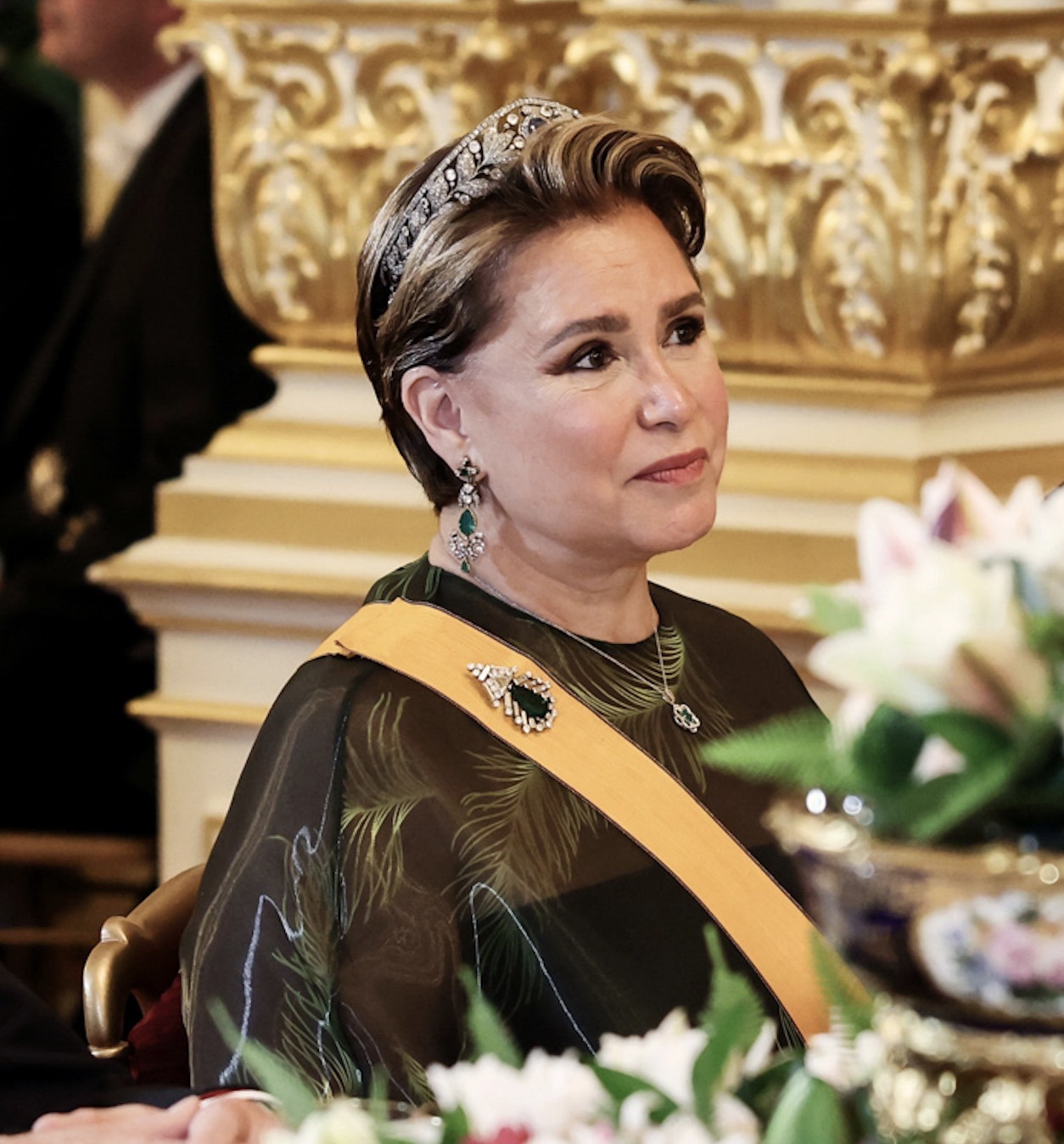 Grand Duchess Maria Teresa wore the Grand Duchess Adélaïde Tiara with Antique Emerald Earrings, an Emerald Art Deco Brooch and the Order of the Gold Lion of the House of Nassau.