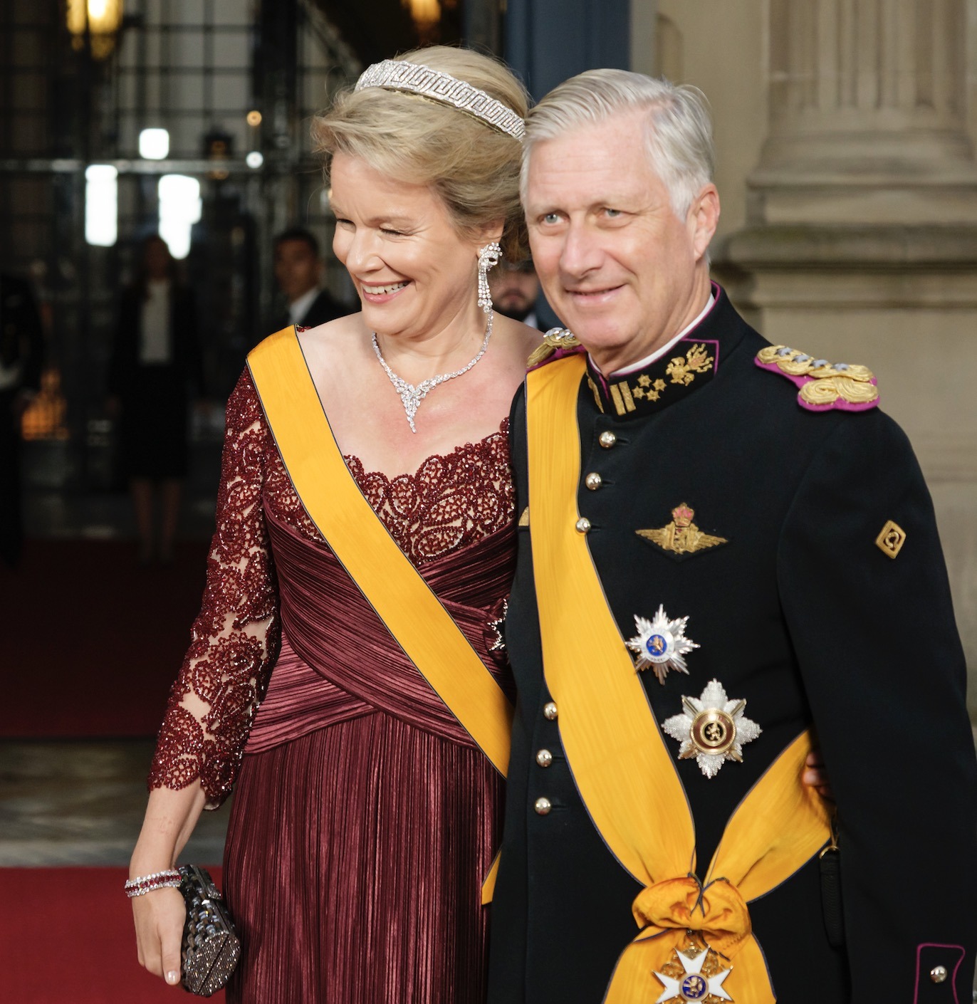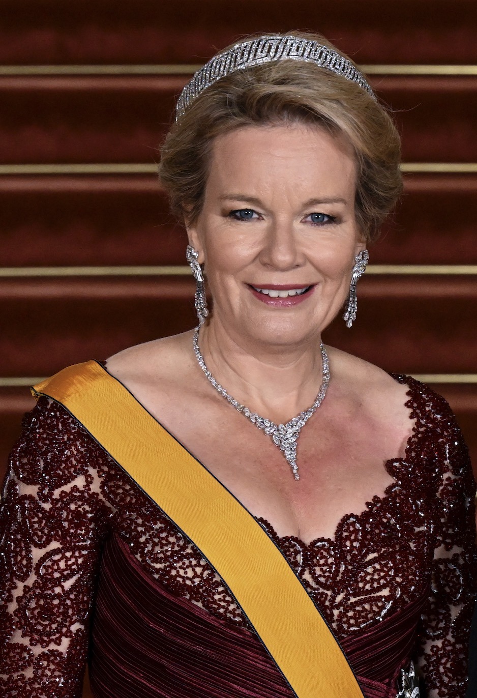 Queen Mathilde of Belgium was wearing the Nine Provinces Tiara with her Graff Diamond Necklace, Diamond Fringe Earrings, Queen Fabiola’s Ruby Bracelet and the Order of the Gold Lion of the House of Nassau.