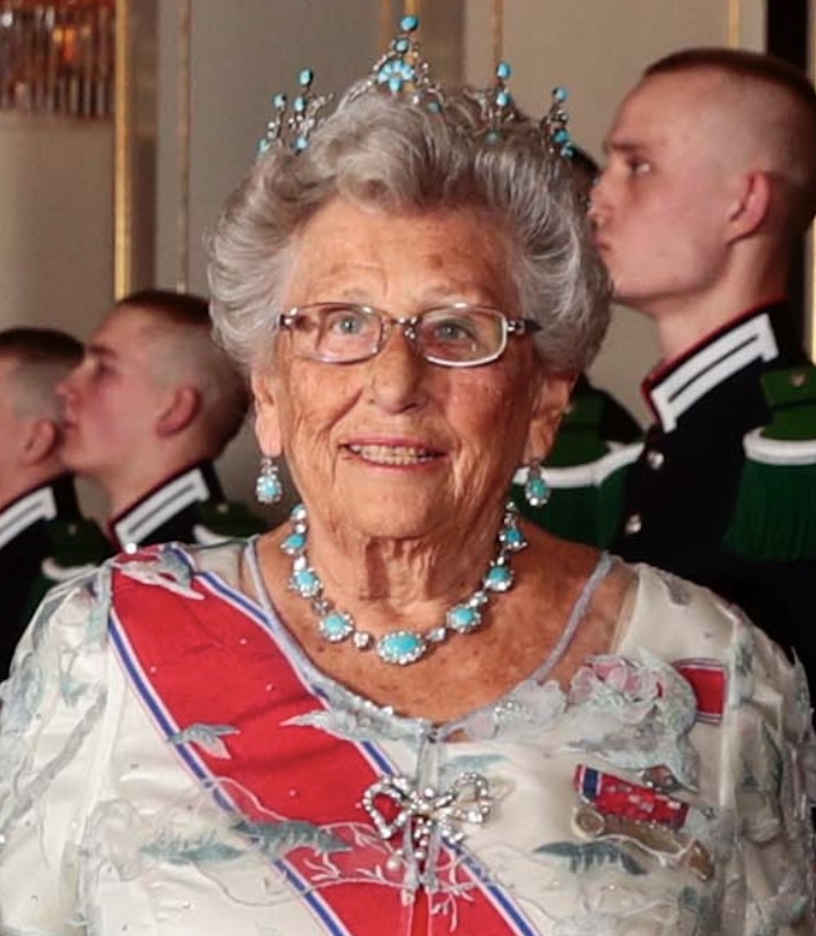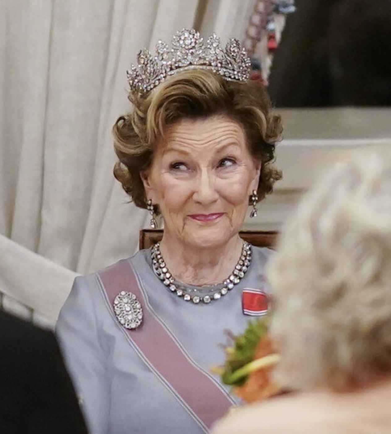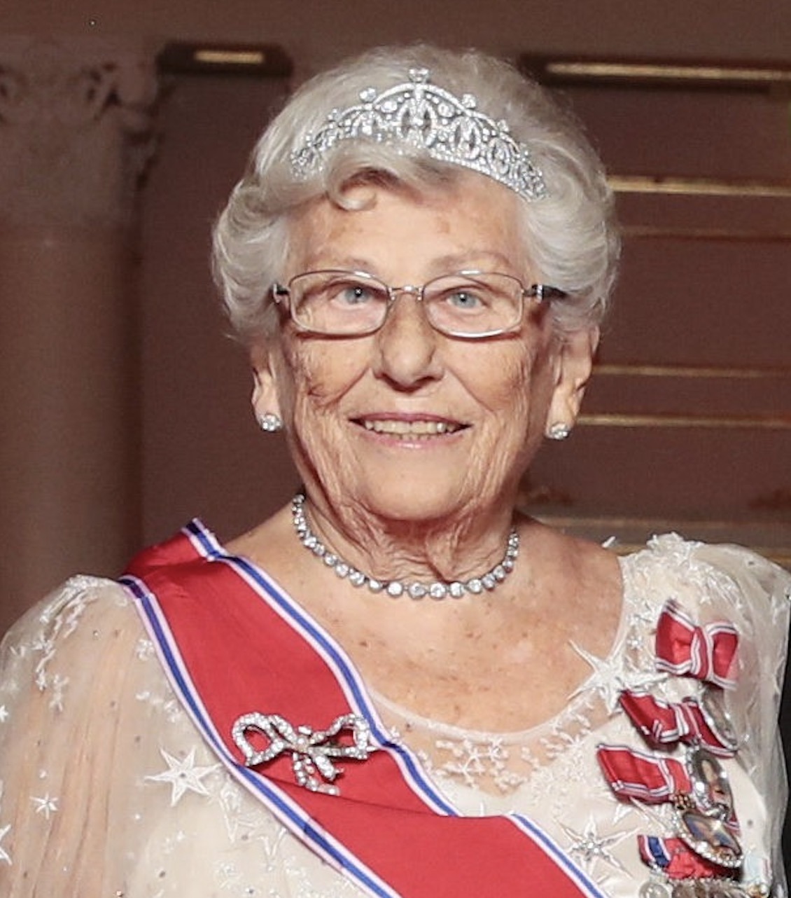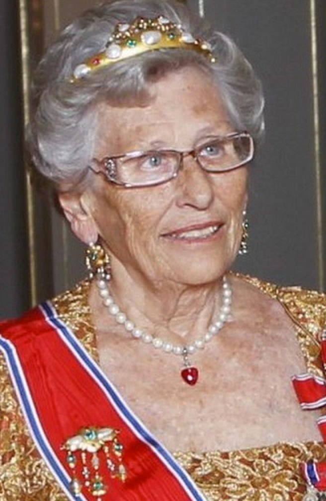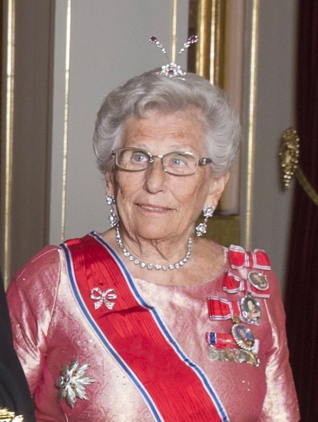 Princess Astrid wore her Ruby Aigrette Tiara and the Sash & Star of the Order of St. Olav with Family Orders of King Haakon, King Olav, and King Harald.