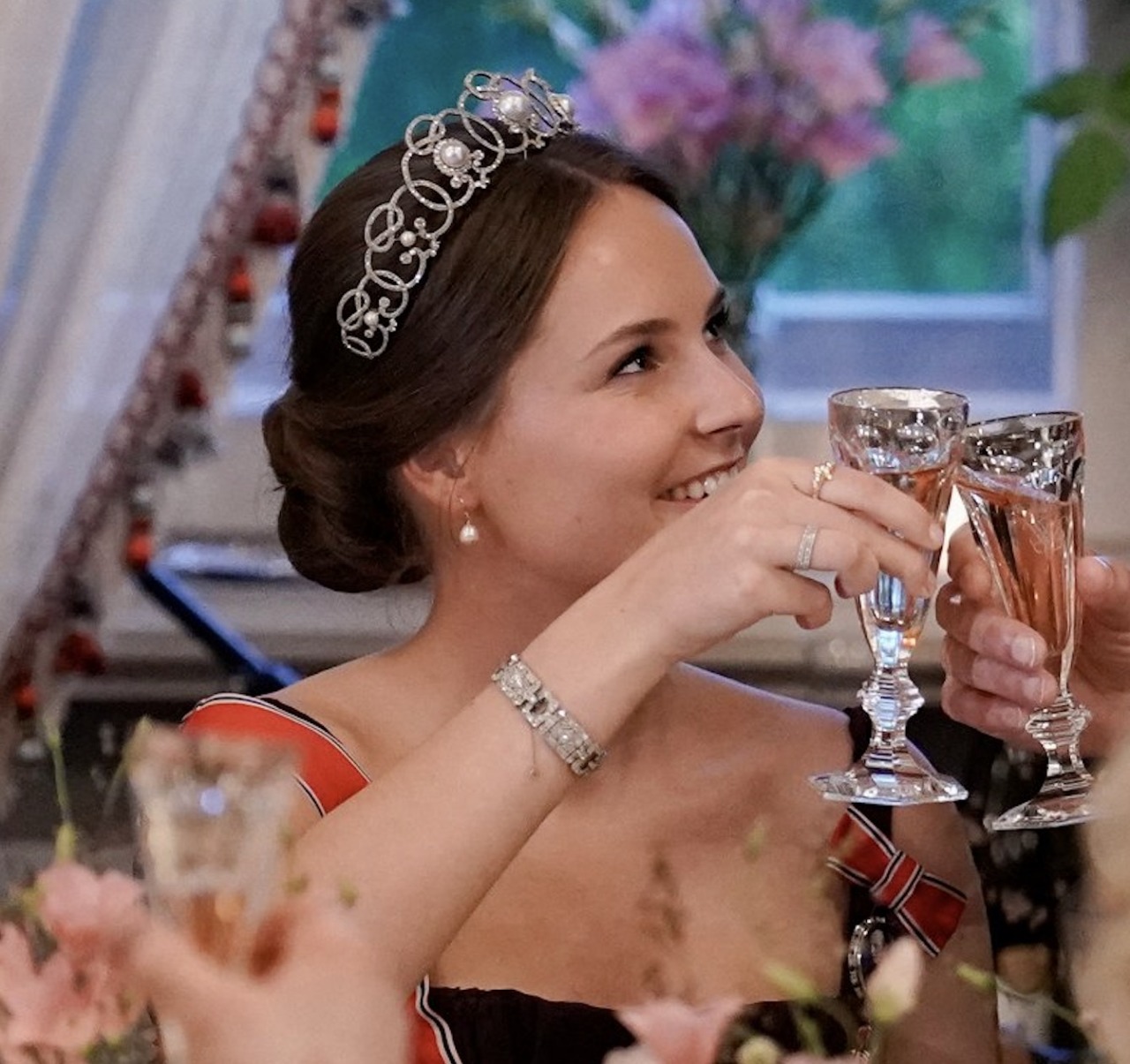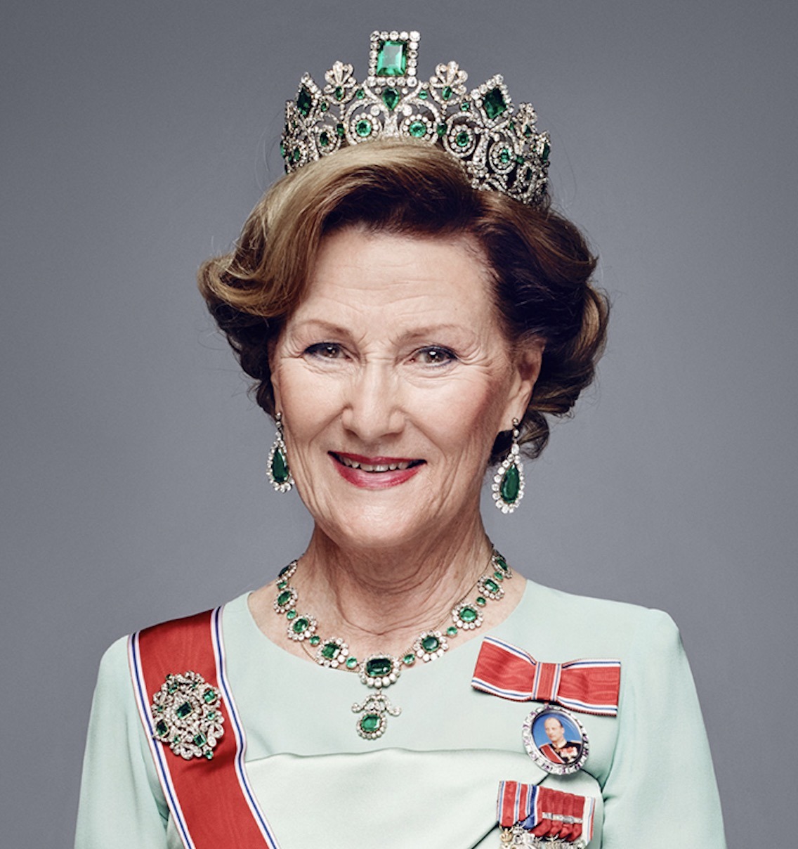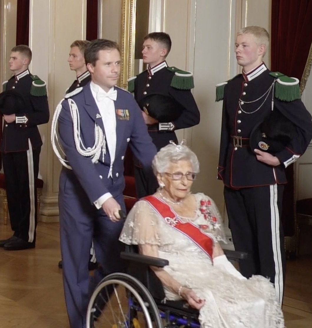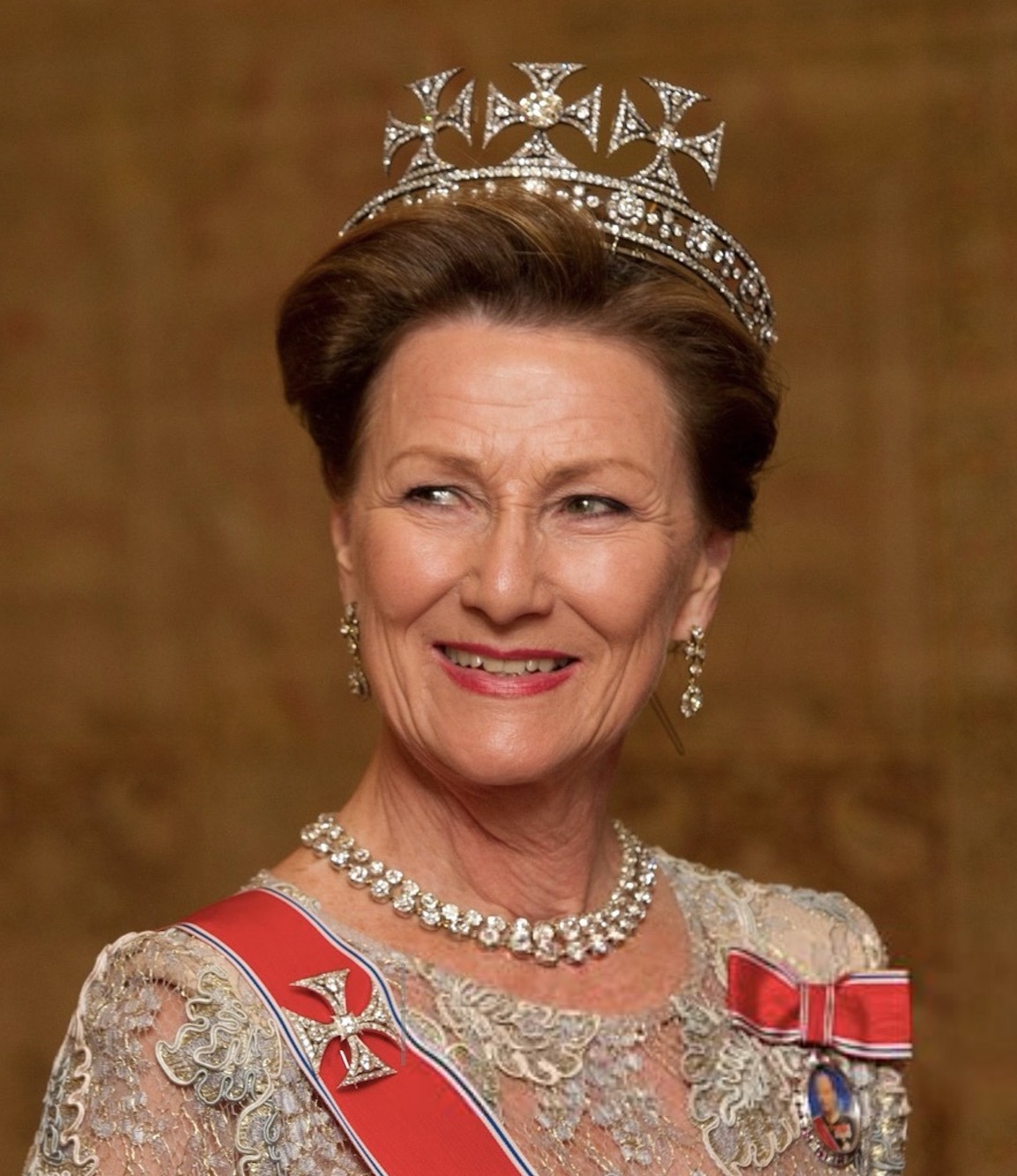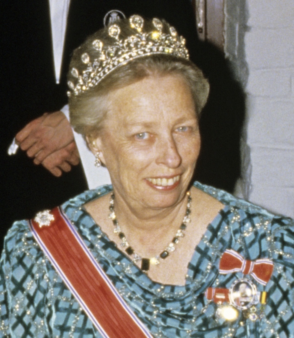 Princess Astrid wore her Ruby Aigrette Tiara and the Sash & Star of the Order of St. Olav with Family Orders of King Haakon, King Olav, and King Harald.