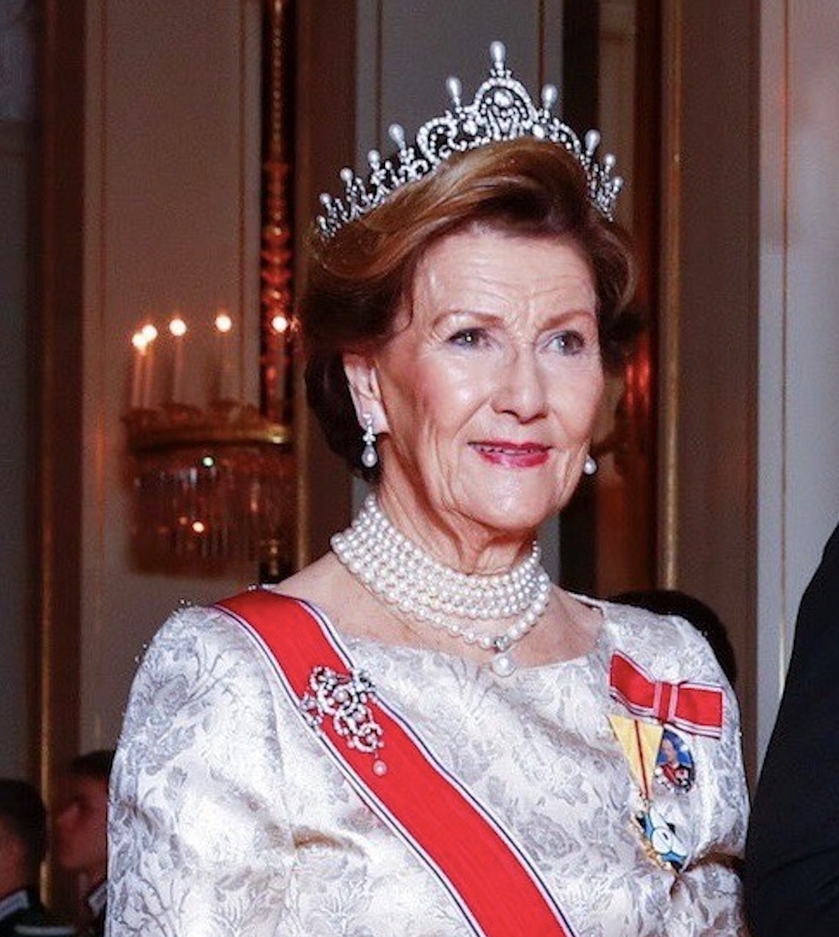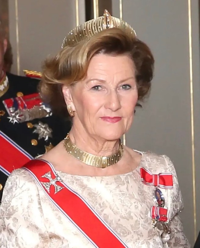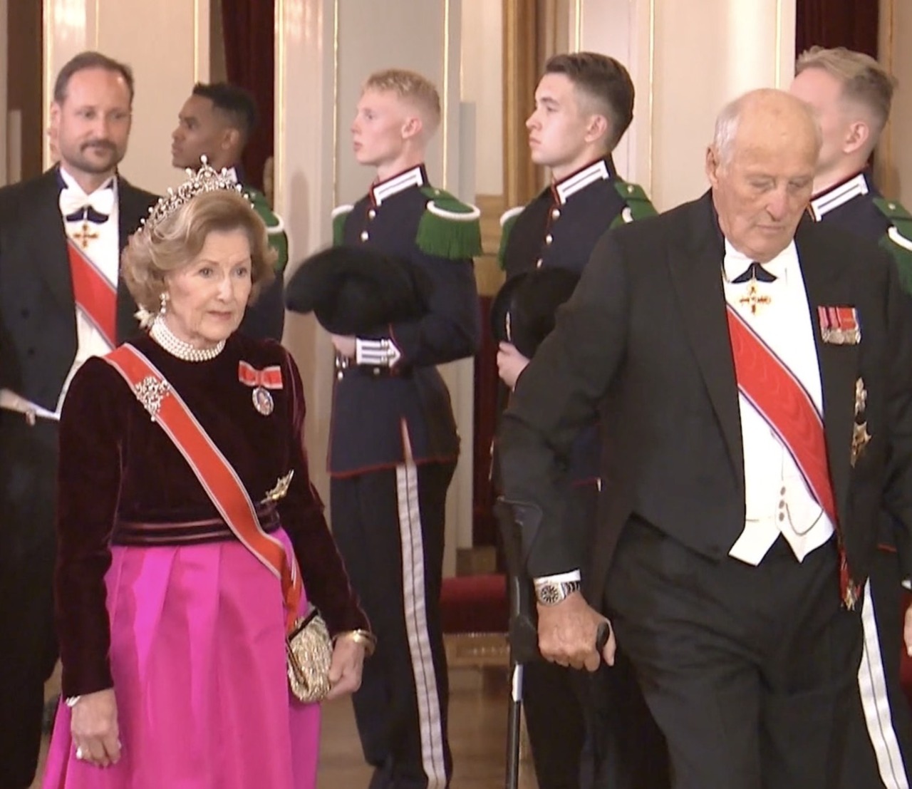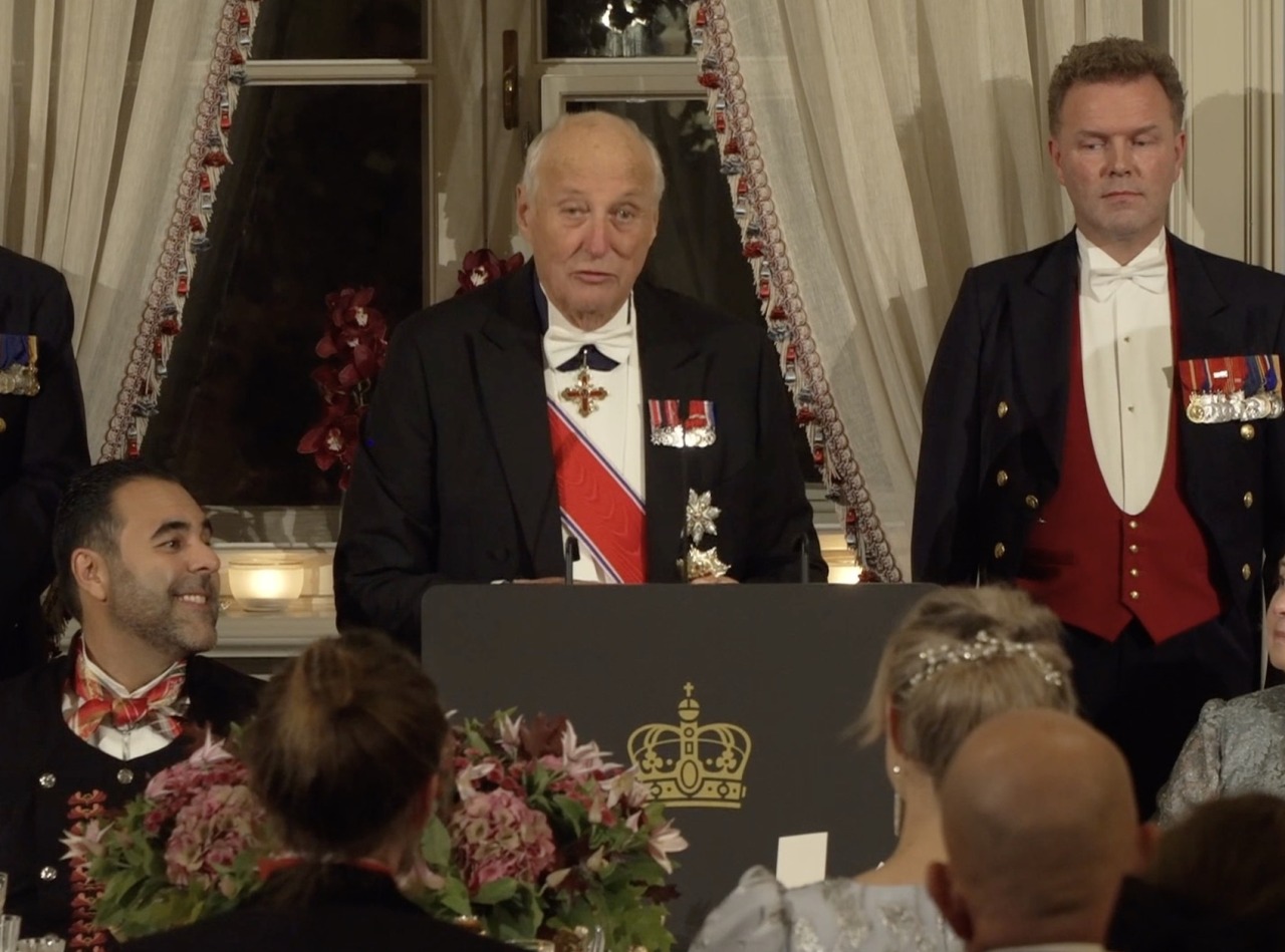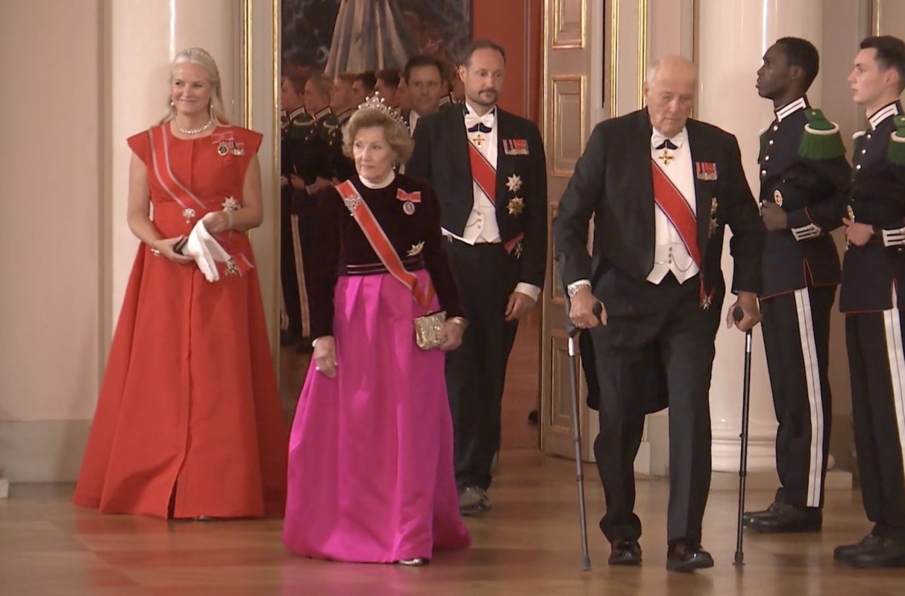 Queen Sonja wore a Queen Maud’s Pearl Tiara, Pearl Necklace and Earrings, Drapers’ Company Brooch and the Sash & Star of the Order of St. Olav with King Harald’s Family Order while King Harald wore White Tie with the Sash & Star of the Order of St. Olav and the Collar of the Royal Norwegian Order of Merit.