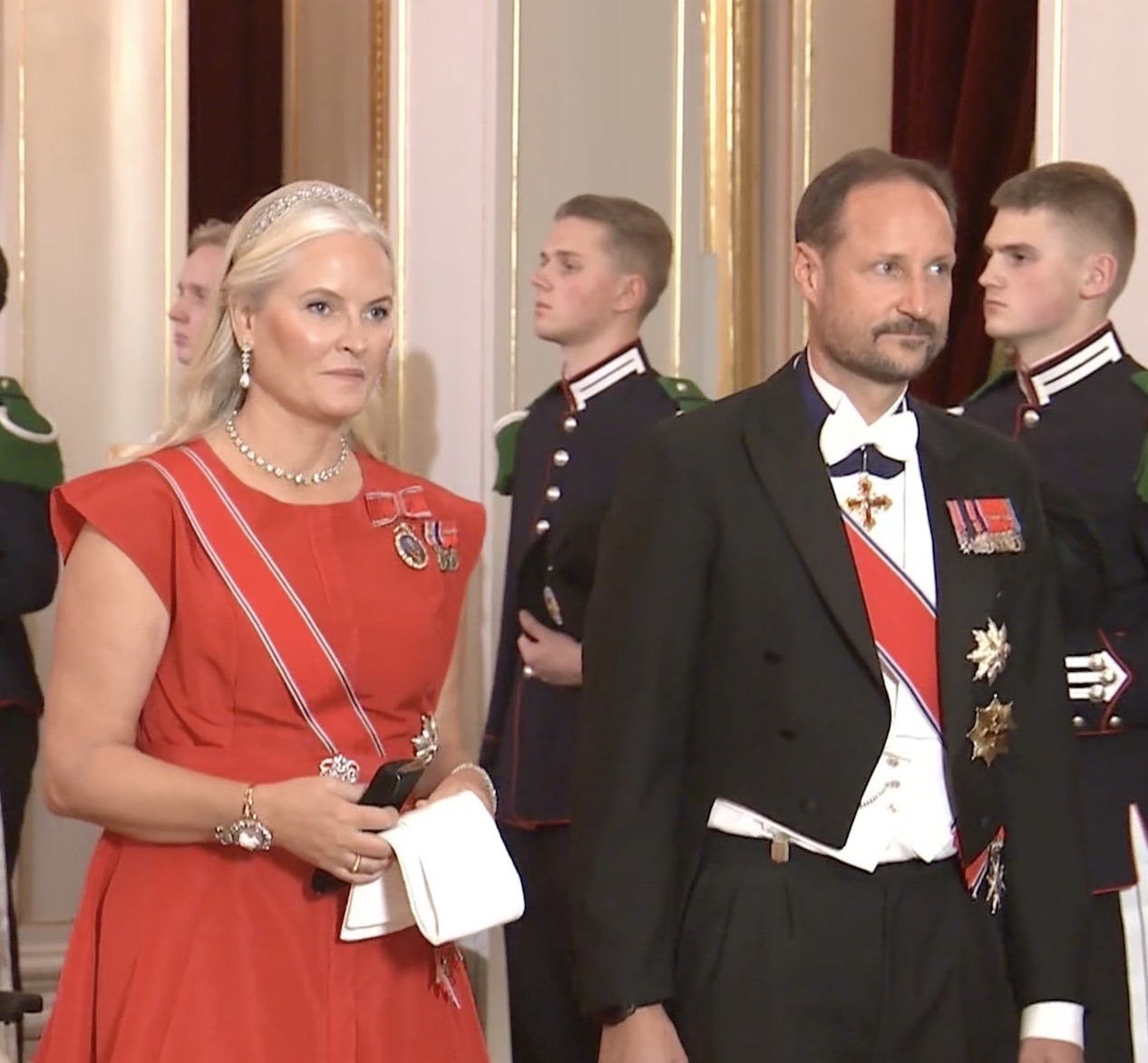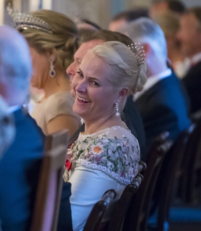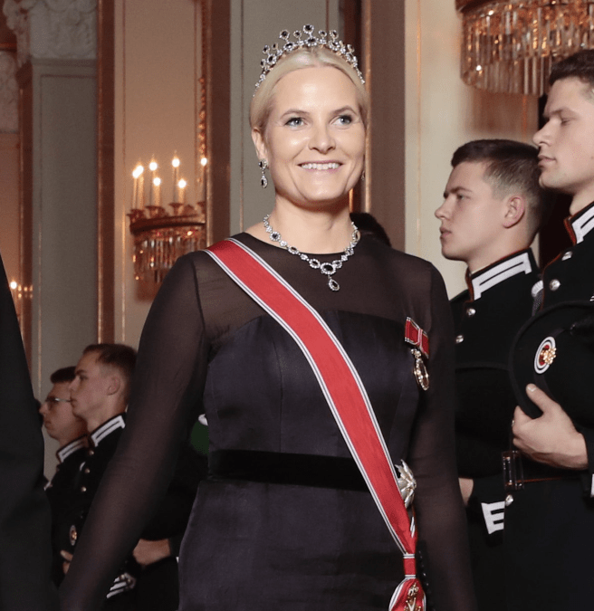 Crown Prince Haakon wore White Tie with the Sash & Star of the Order of St. Olav and the Collar of the Royal Norwegian Order of Merit while Crown Princess Mette-Marit wore Diamond Daisy Bandeau, her Pendant EarringsPrincess Ragnhild’s Pearl Brooch, a Diamond Rivière from Queen Maud, and Queen Maud’s Order of Victoria and Albert Bracelet with the Order of St. Olav and the Royal Family Order of King Harald V.