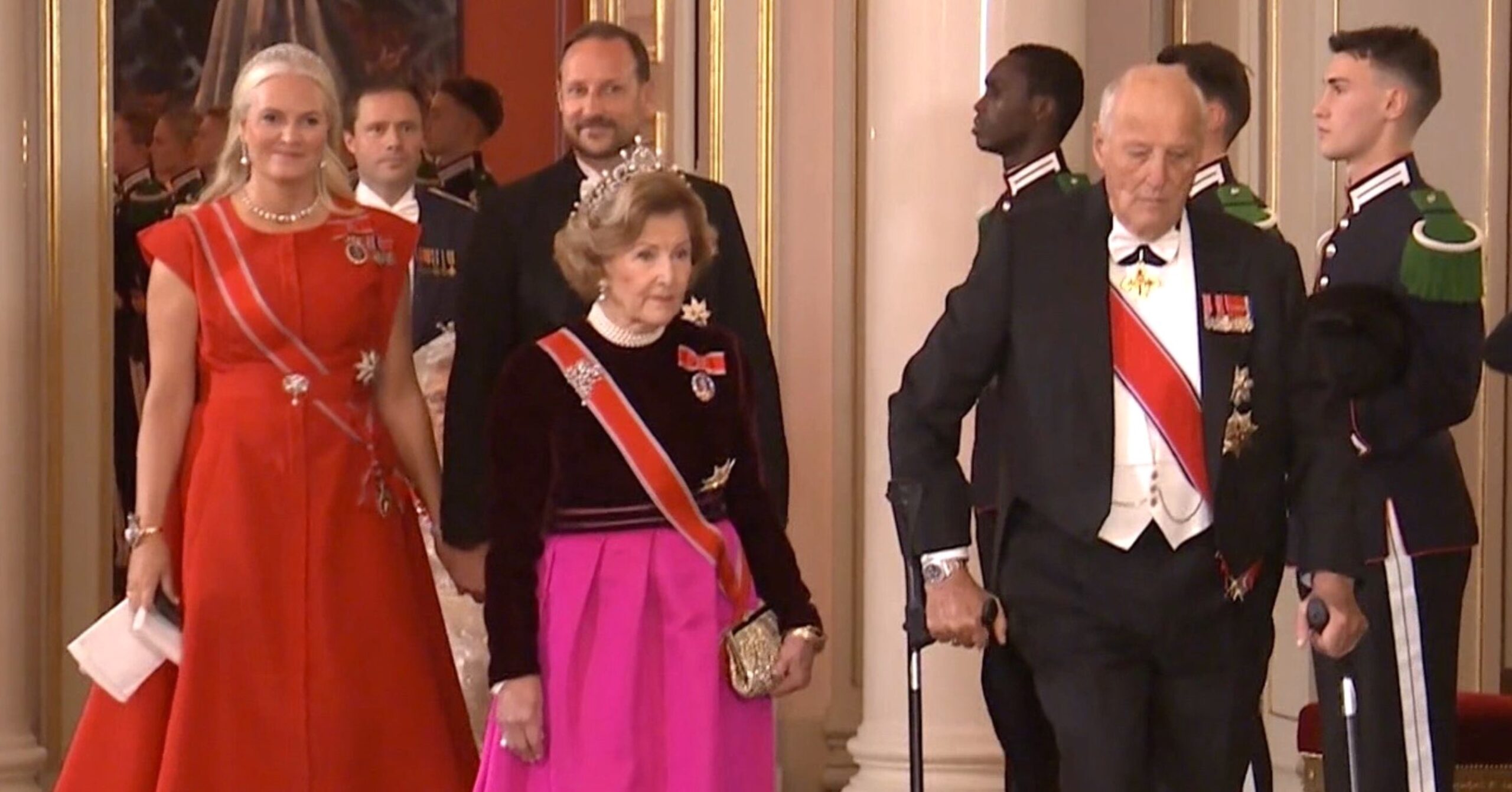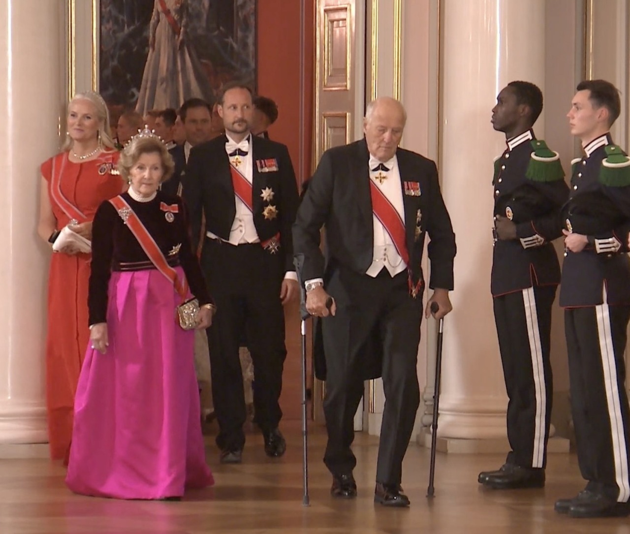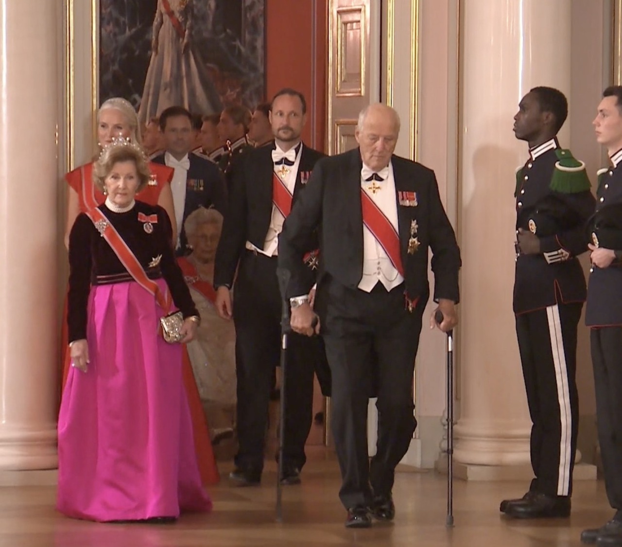 King Harald V and Queen Sonja were joined by Crown Prince Haakon, Crown Princess Mette-Marit and Princess Astrid as they the processed through the Speilsalen, Small Dining Room, Small Ballroom, and the Great Ballroom into the Banqueting Hall, for the Stortingsmiddag Banquet.