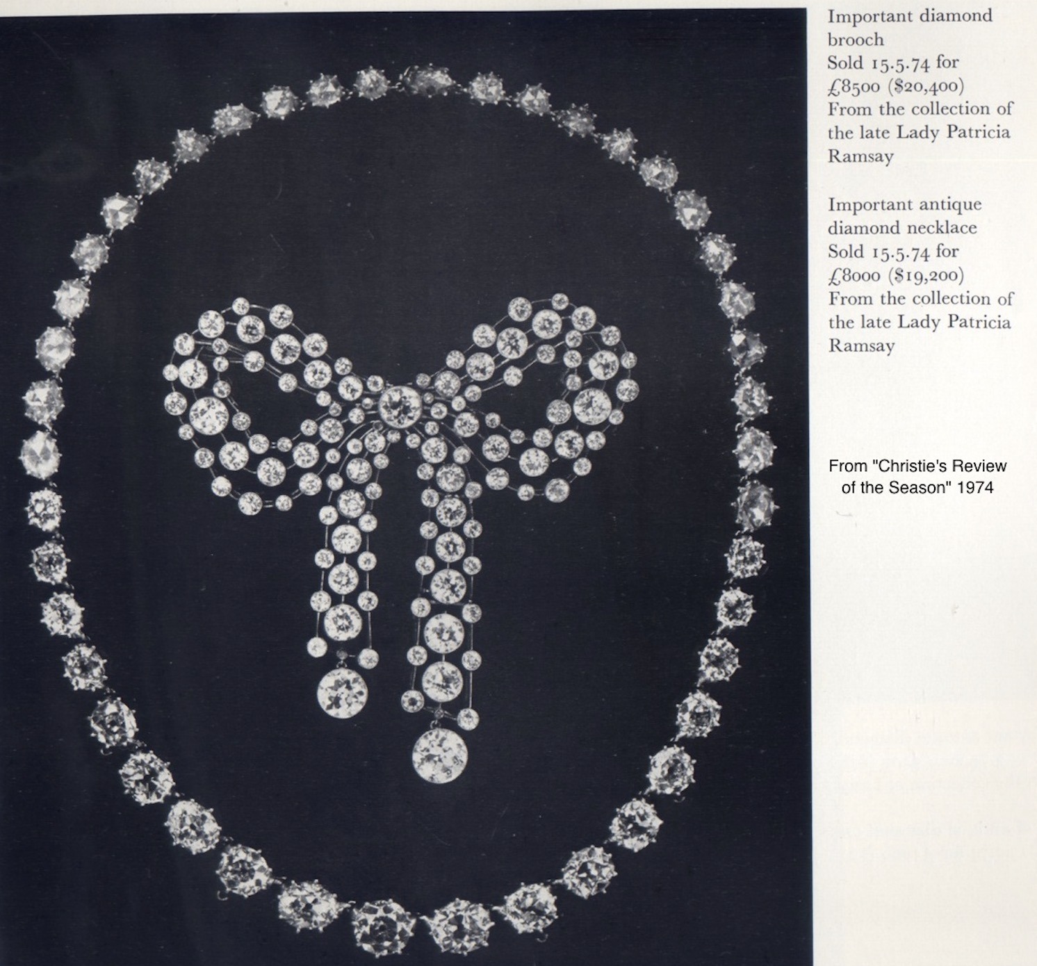 After Lady Patricia’s death in 1974, the Duchess of Connaught’s Diamond Bow Brooch was among in the 74 lots that were sold at the Christie’s 15 May 1974 Important Jewels Sale, alongside a Honeysuckle TiaraQueen Victoria’s Diamond Jubilee Chain, and the Duchess of Connaught’s Diamond Rivieres. The Brooch was sold for £ 8500 and its fate is unknown.