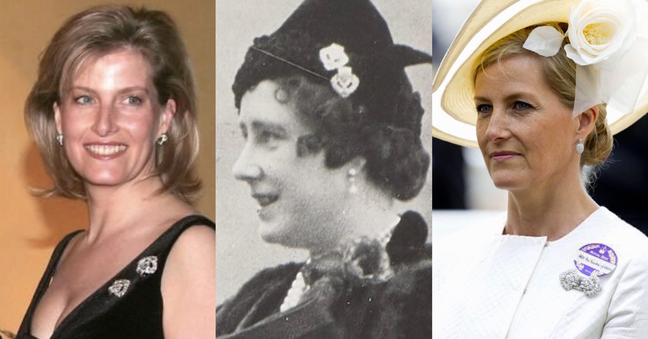 Decades later, in 1999, the Queen Mother gave her Art Deco Diamond Clip Brooches to Sophie Rhys-Jones when she married her youngest grandson, the Earl of Wessex, and the new Countess first wore the Diamond Clips at the Queen Mother’s 99th Birthday two months later.