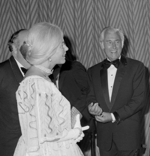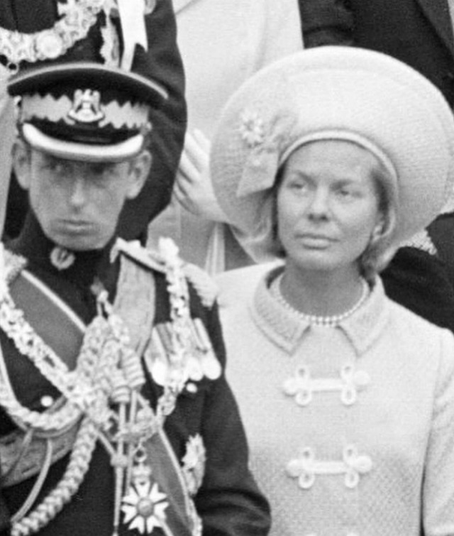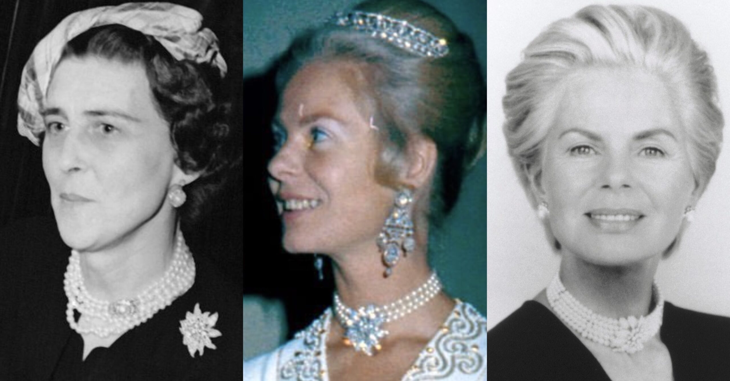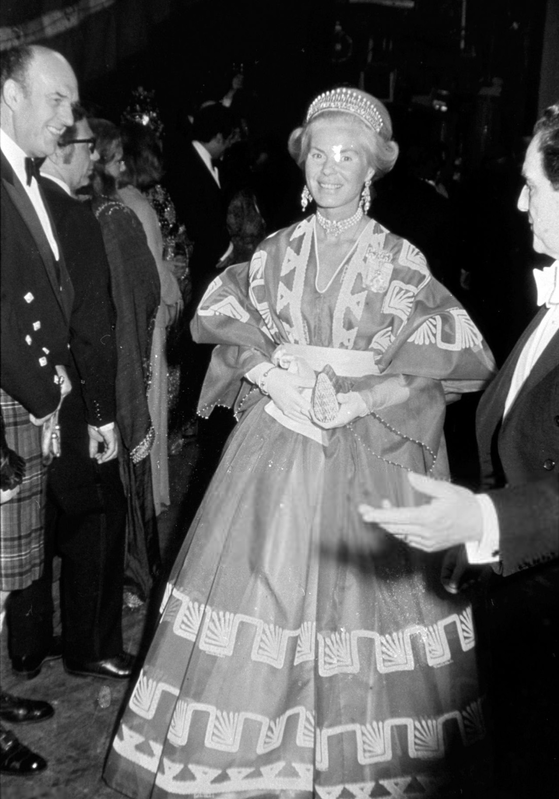 By 1972, the Duchess of Kent began wearing the modern Diamond Flower Brooch attached to a three-strand Pearl Choker, sometimes also worn with Princess Marina’s Black Pearl Brooch, which was paired with Queen Mary’s Diamond Crochet Bandeau and Princess Marina’s Diamond Girandole Earrings on a couple of occasions including a Premiere in New York City and a Gala at the Palace of Versailles in 1972.