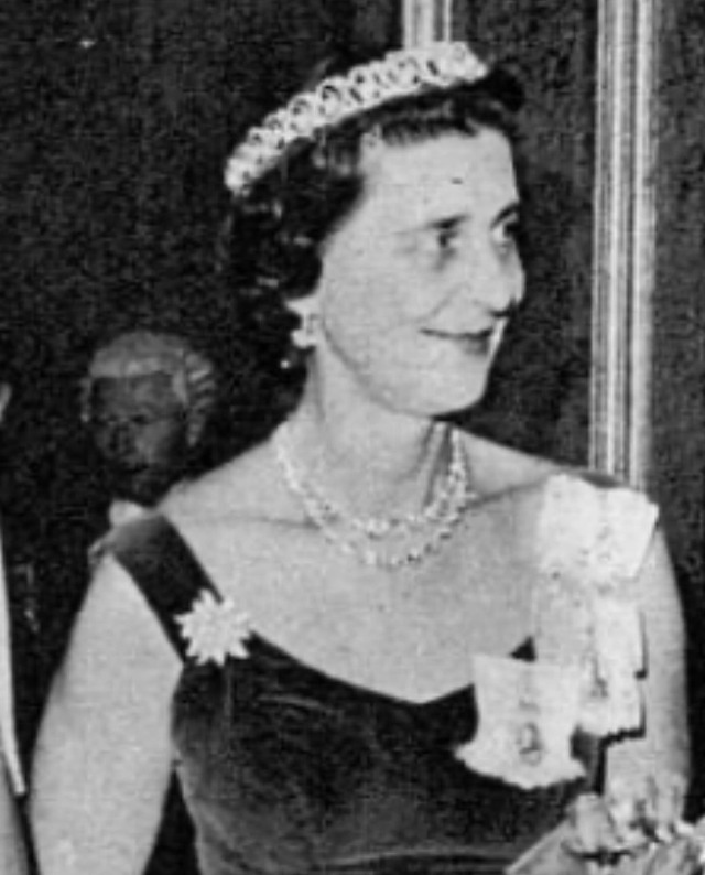 The striking Diamond Brooch is composed of a cluster of diamonds surrounded by diamond petals. It appears that Princess Marina received this Diamond Brooch when she launched a tanker called World Harmony in February 1954, thanking the shipping company for a ‘magnificent’ Brooch.