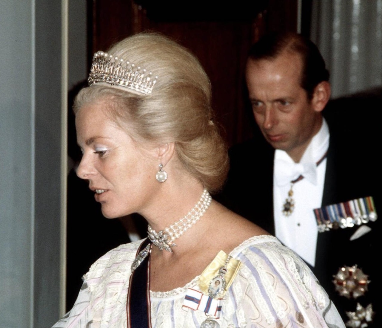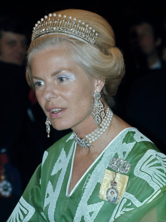 The Duchess also wore the Pearl Choker with the modern Diamond Flower Brooch paired with the Pearl and Diamond Fringe Tiara through the late 70s, including for the Queen’s Silver Jubilee Gala in 1977.