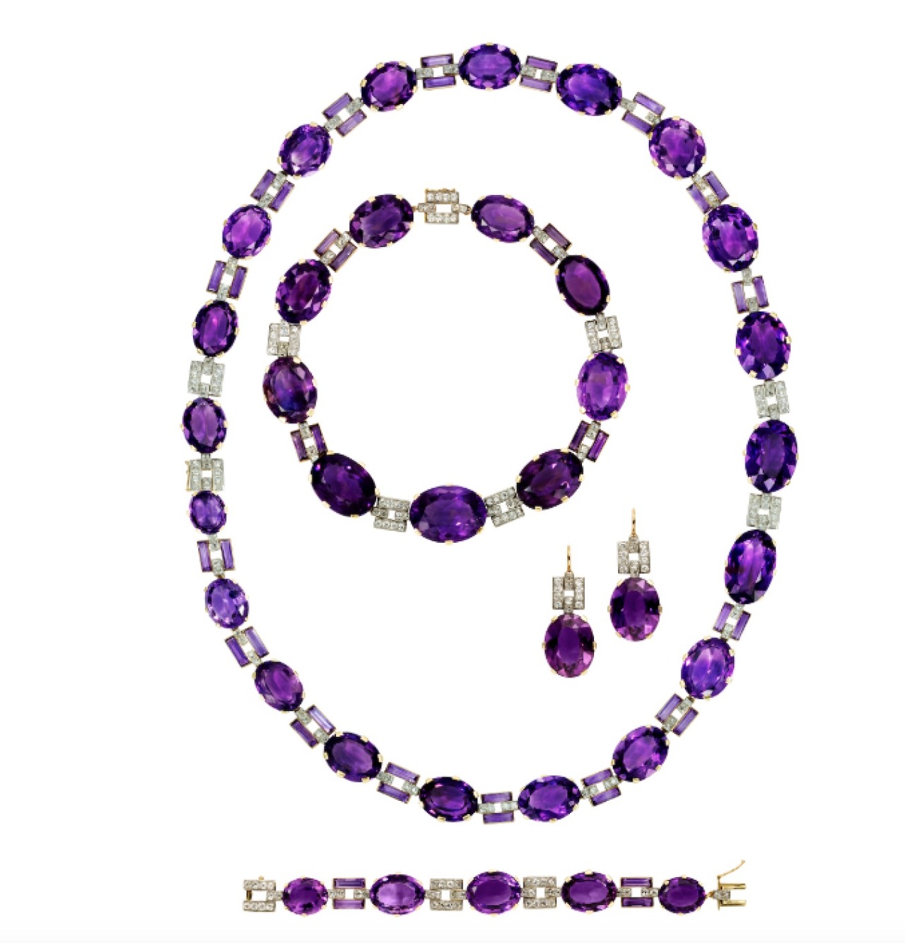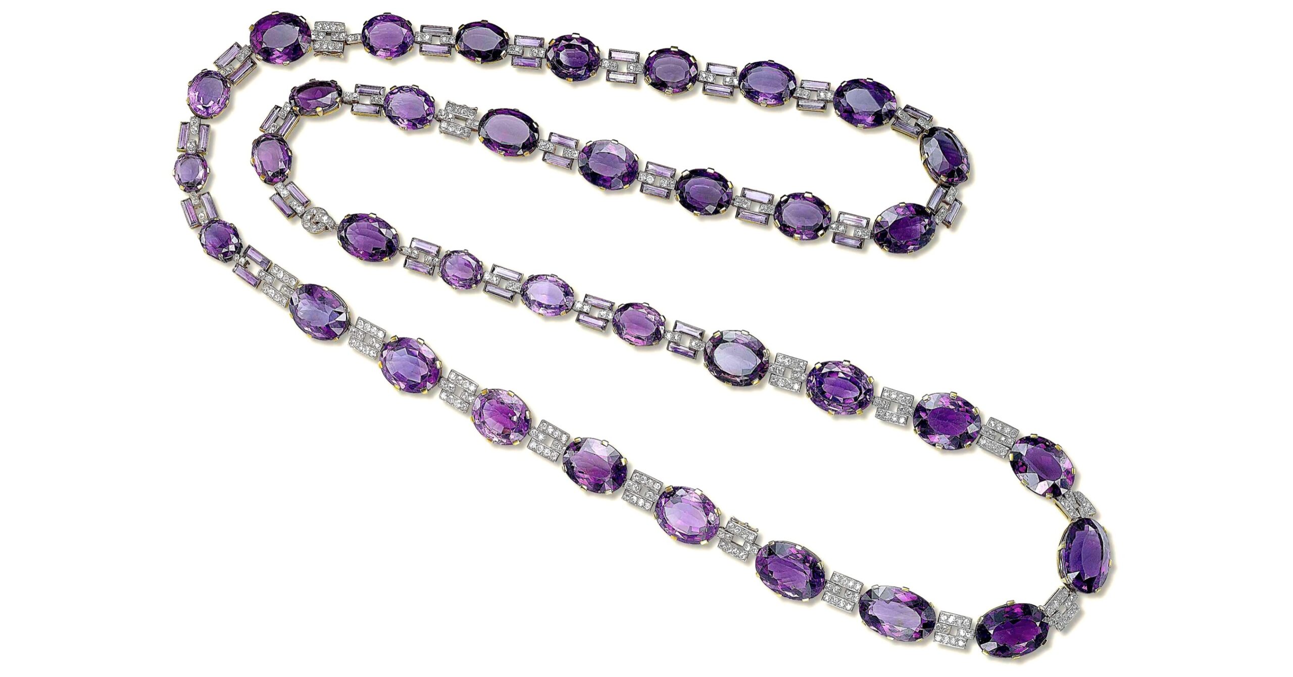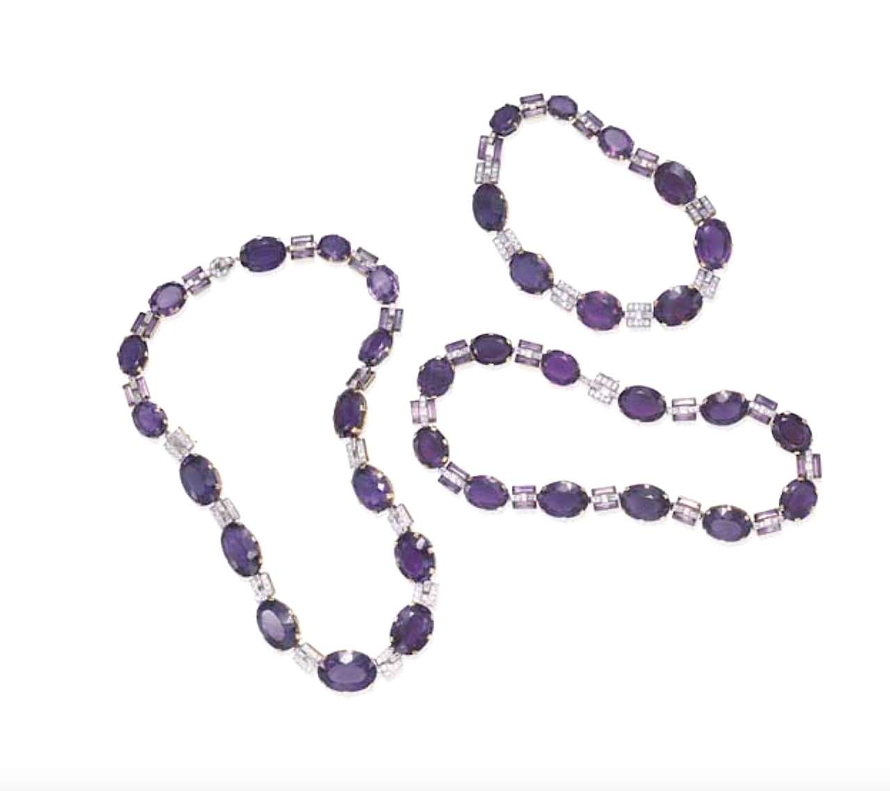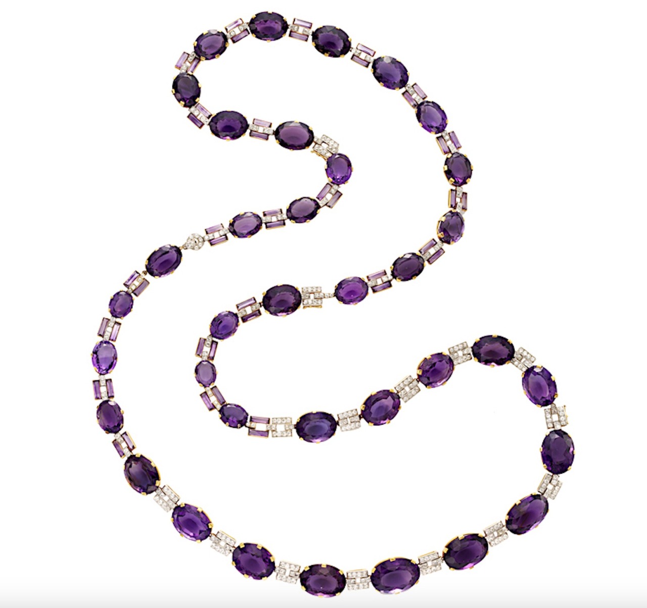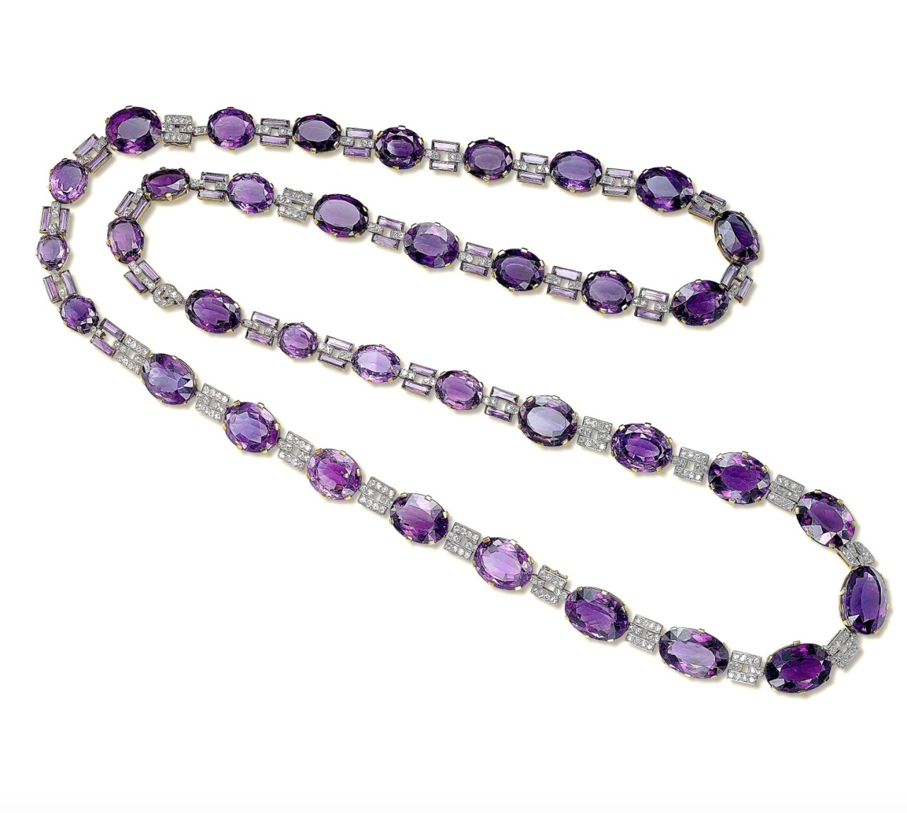 In 1926, the Duchess of Marlborough ordered this long Amethyst and Diamond Sautoir from Cartier in London composed of thirty-six graduated oval-shaped amethyst collets interspersed with twin rectangular-cut amethysts or twin diamond-set bar links, can be styled as a belt, or detached and worn as three necklaces of varying lengths.