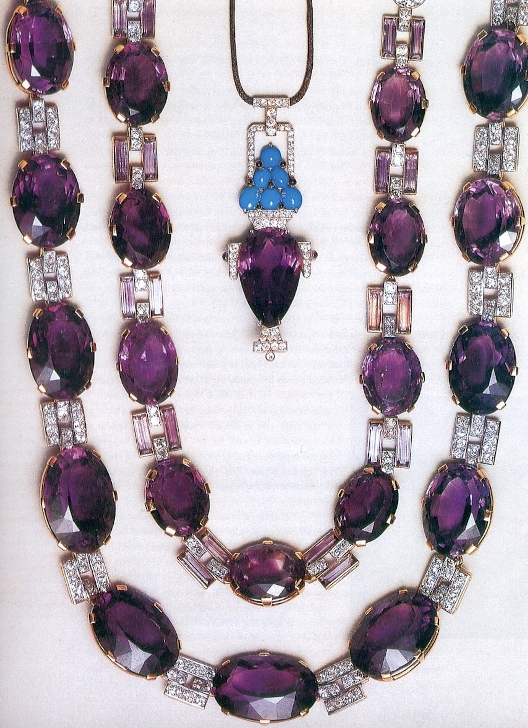 The 1926 version of the amethyst and diamond sautoir by Cartier London. win the turquoise and diamond clasp, and the 1928 version with the two panels from the diamond bracelet which had been created by Chaumet in 1925.
