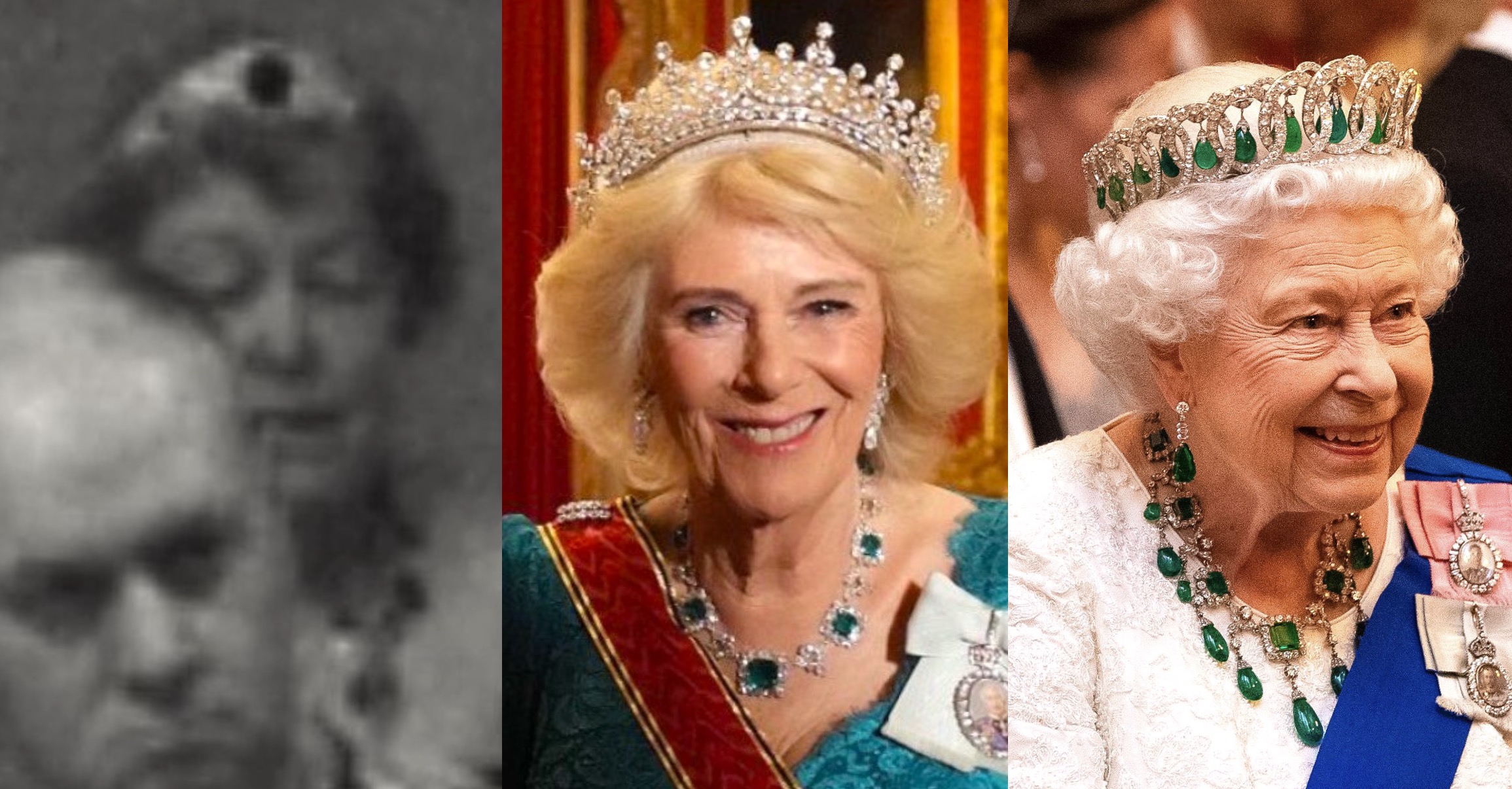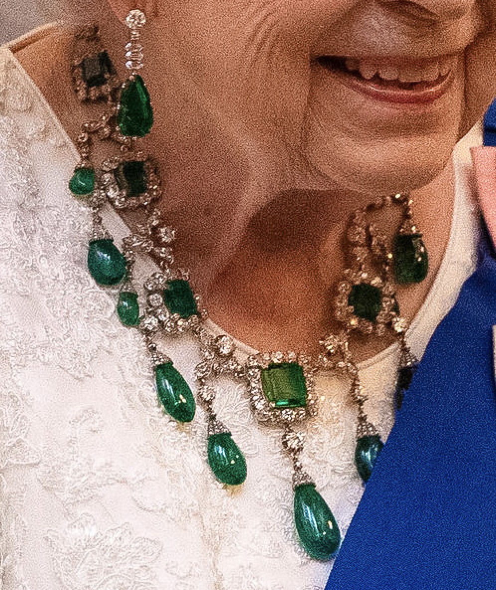 Now, Queen Camilla wore the mystery Greville Emerald Necklace without the large pear-shaped emerald pendants and with the Girls of Great Britain and Ireland Tiara for the German State Banquet at Windsor Castle in 2025.