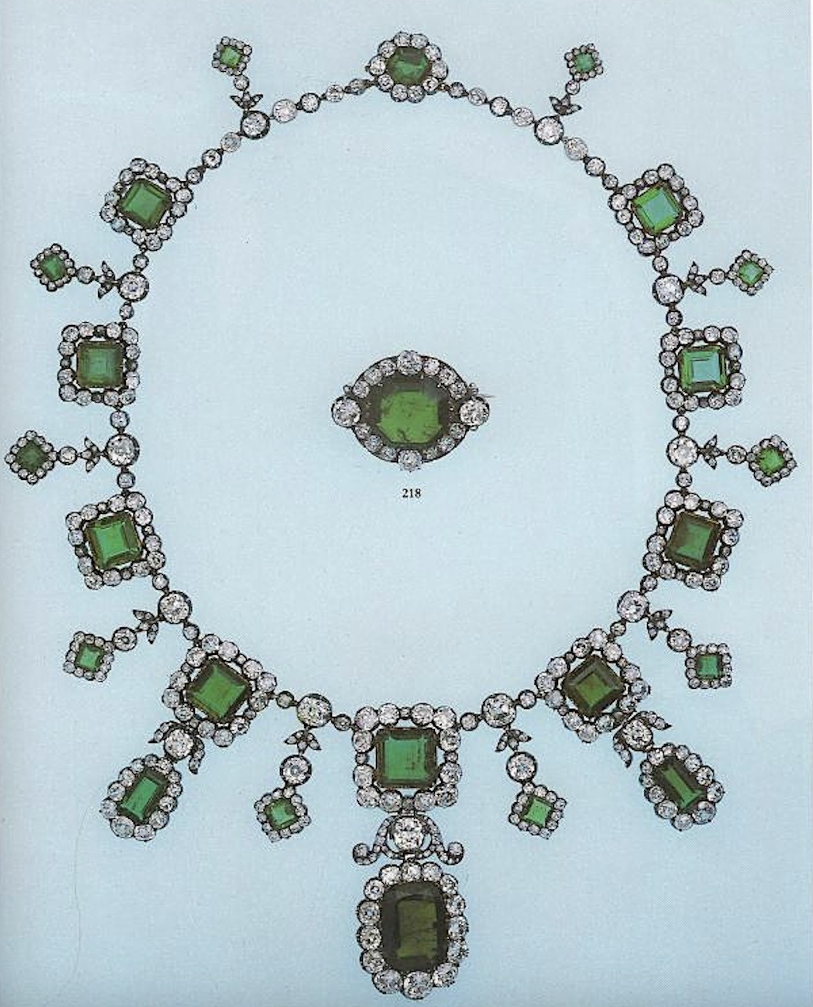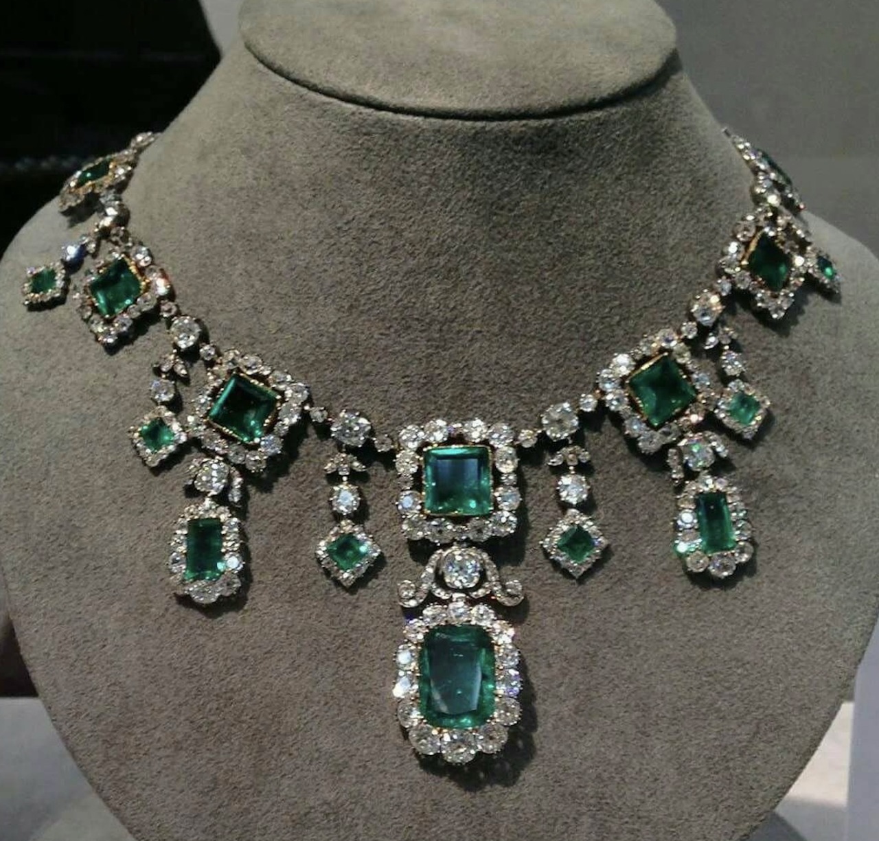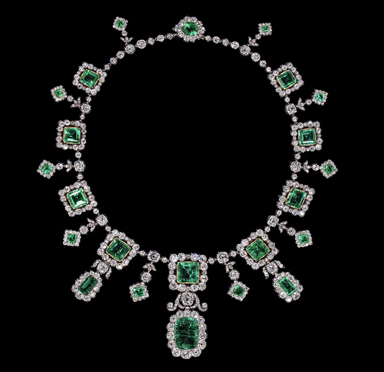 A historic early 19th century Emerald and Diamond Necklace, circa 1810, this piece is designed as a series of nine graduated emerald and diamond square-shaped clusters, the central cluster with a large cushion-shaped emerald drop suspended from a diamond-set scroll mount and flanked by two smaller drops, the diamond collet intersections with smaller emerald and diamond square-shaped cluster drops.