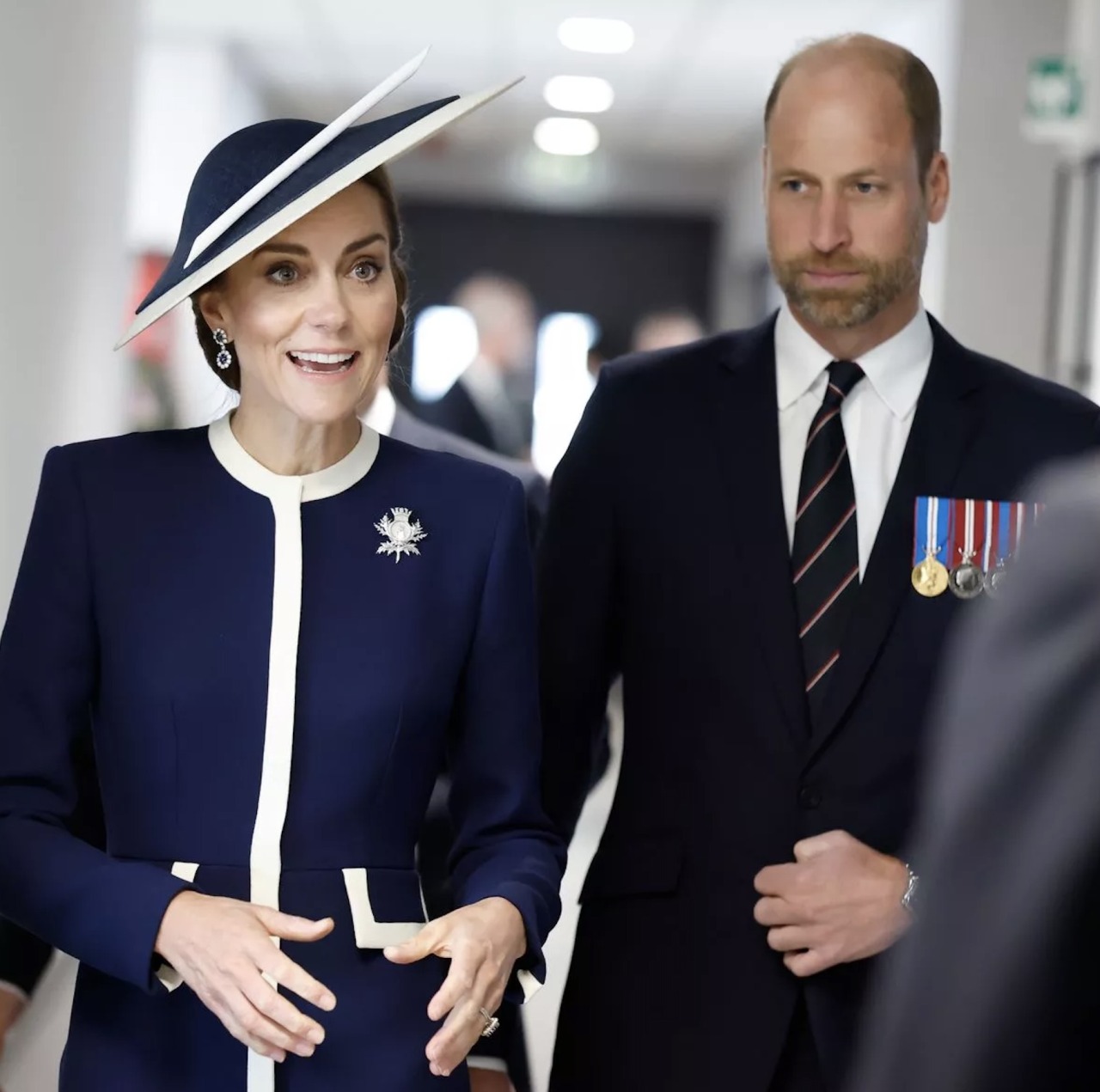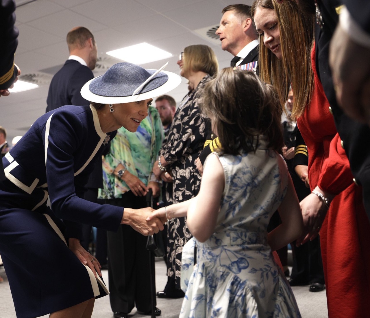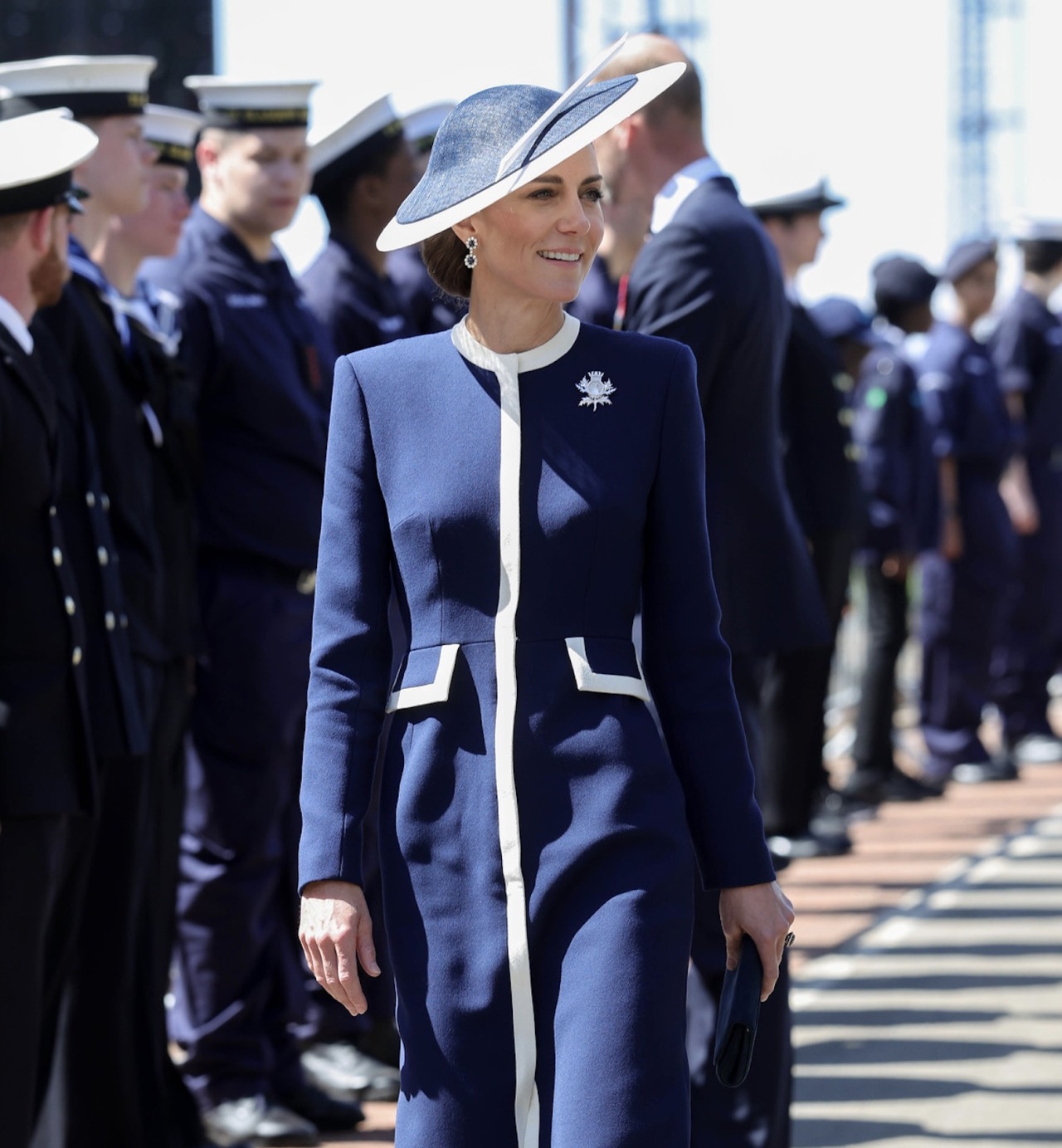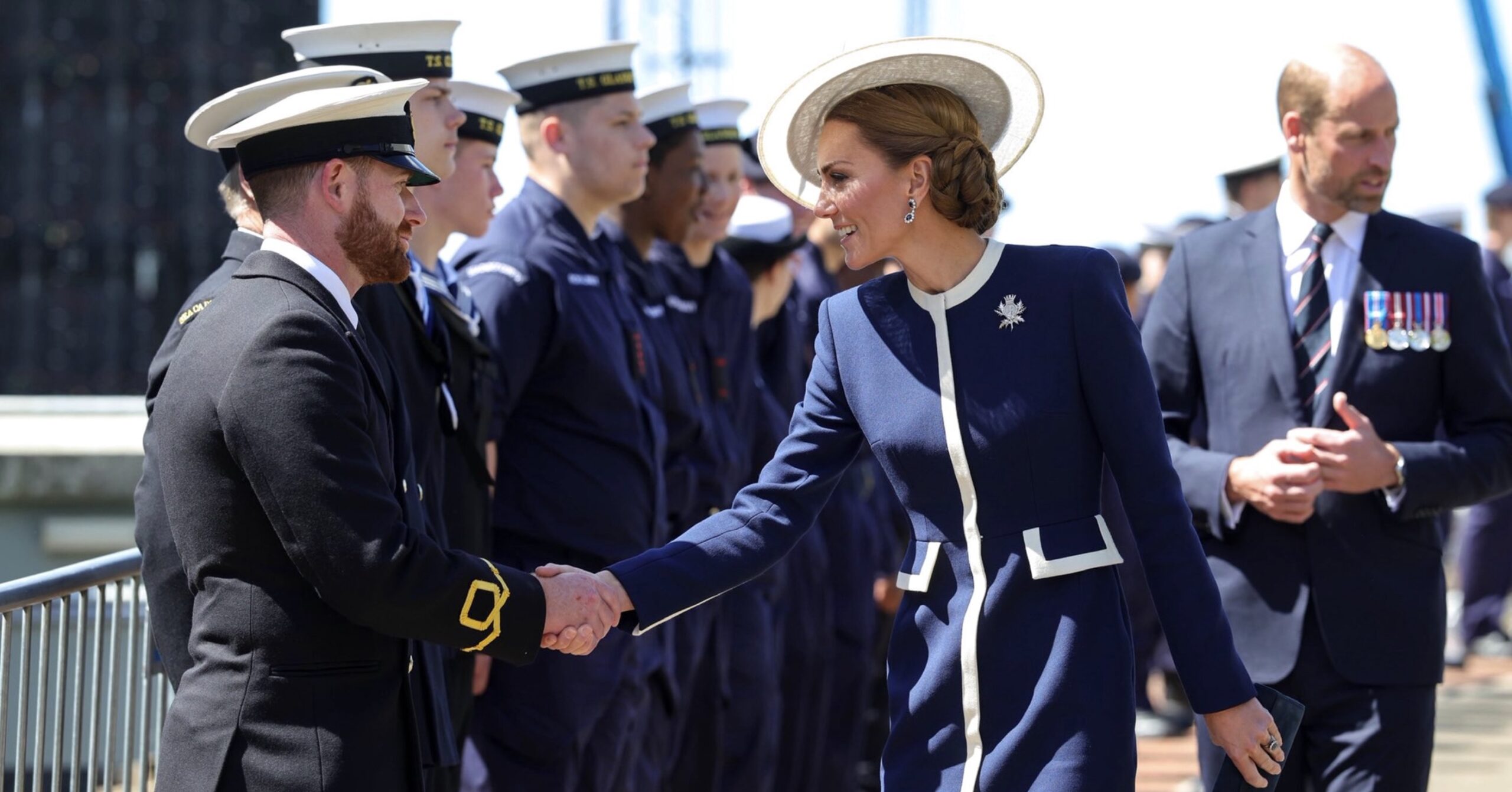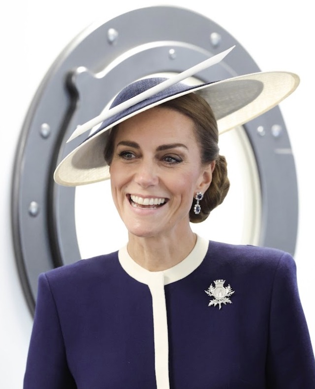 The Princess of Wales wore Princess Diana’s Sapphire Earrings and a a brooch designed by James Porter & Son, made of white gold of the insignia of HMS Glasgow.