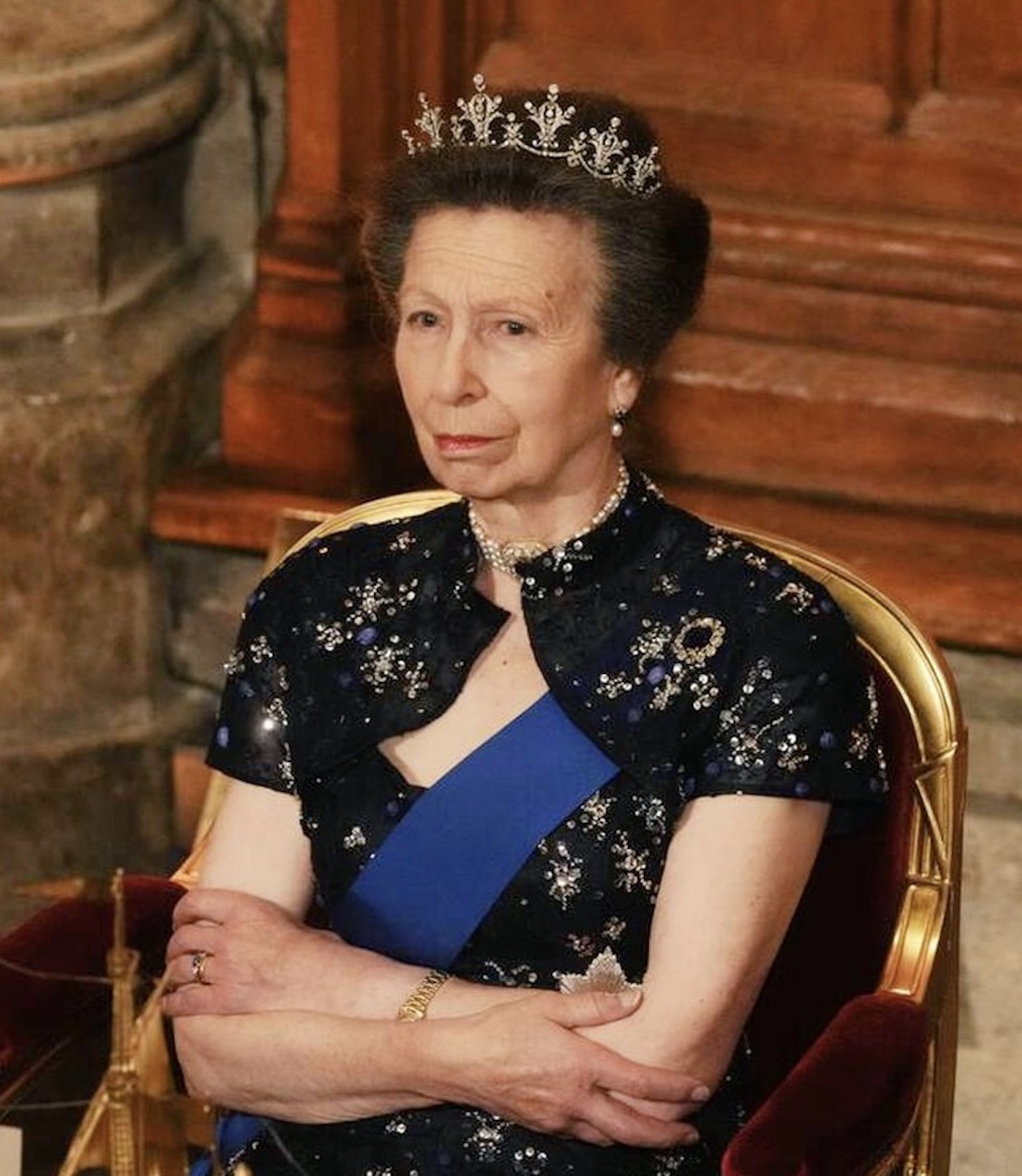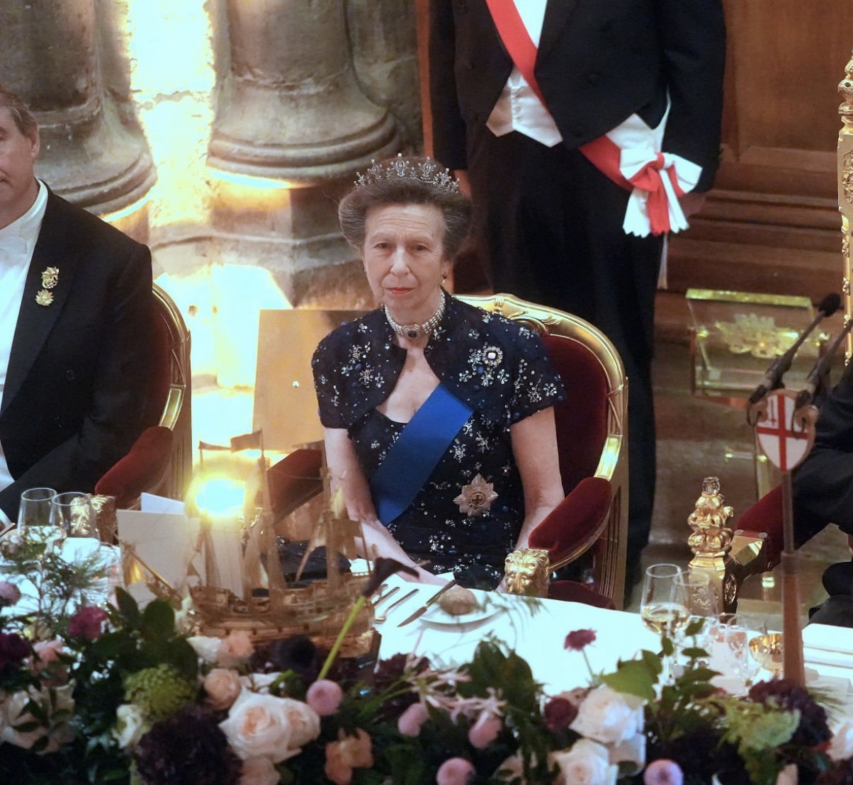 The Princess Royal wore her Diamond Festoon Tiara and Empress Maria Feodorovna’s Sapphire Choker with the Sash and Star of the Order of the Garter, the Royal Family Order of King Charles III, and the Royal Family Order of Queen Elizabeth II.