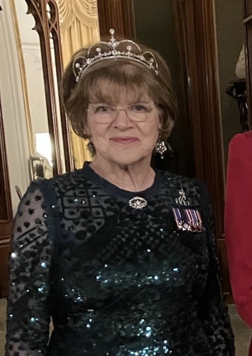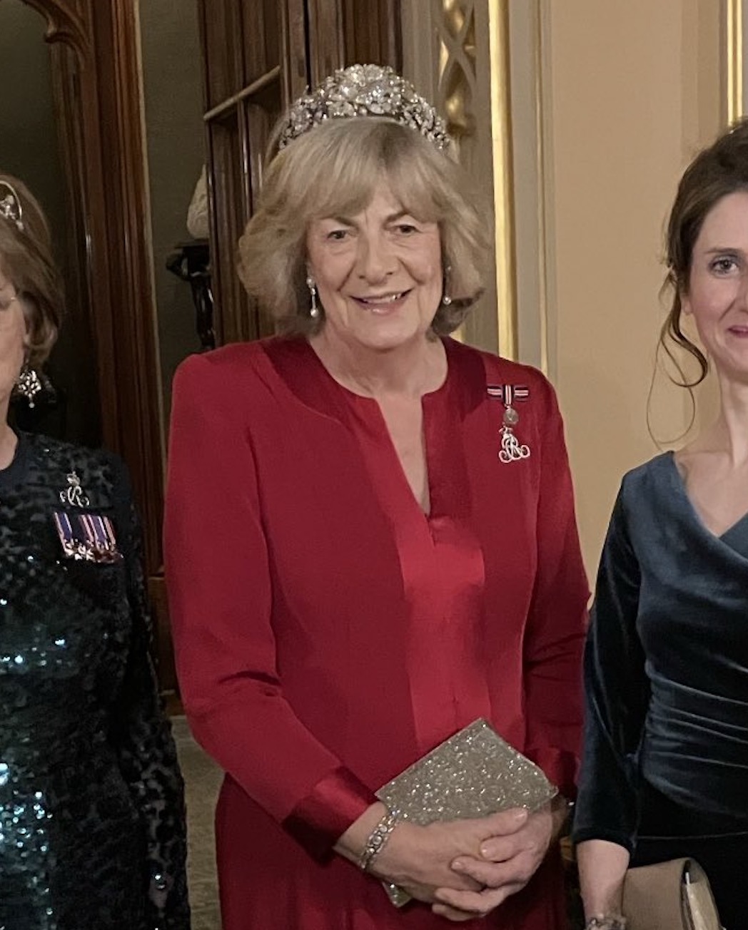 Dame Sarah Troughton, one of the Queen’s Companions and the Lord Lieutenant of Wiltshire wore a striking Diamond Tiara.