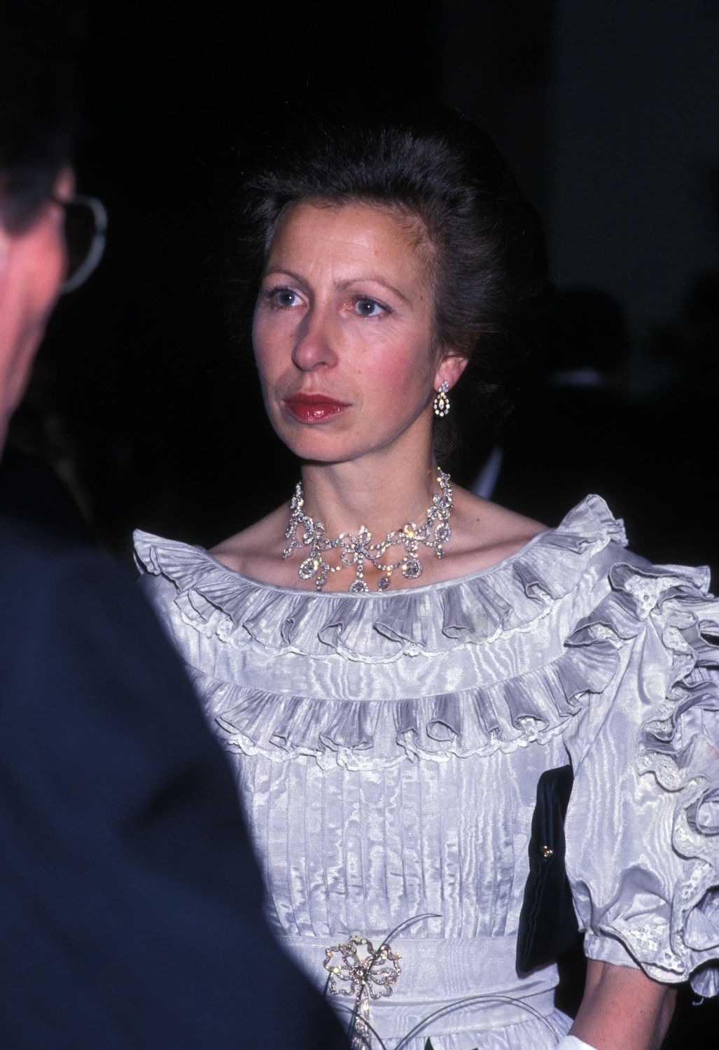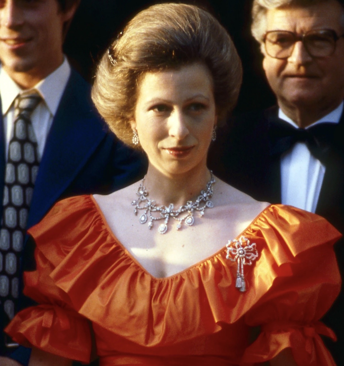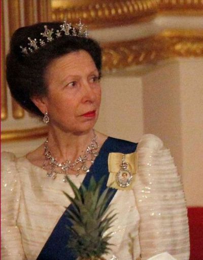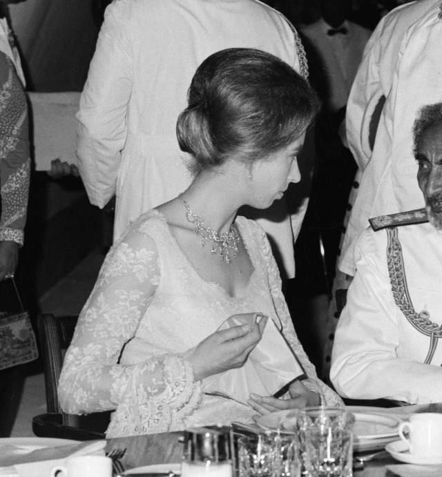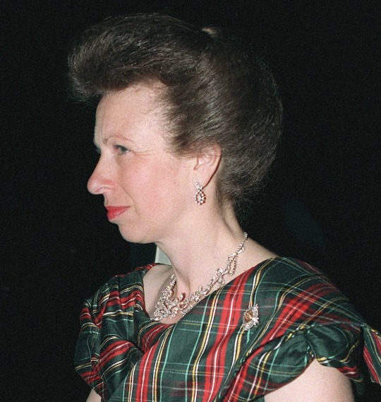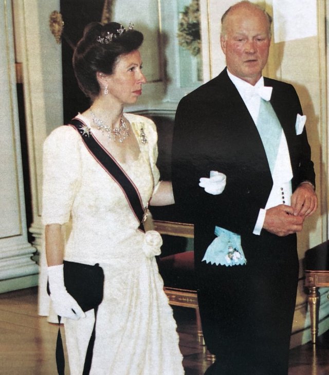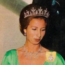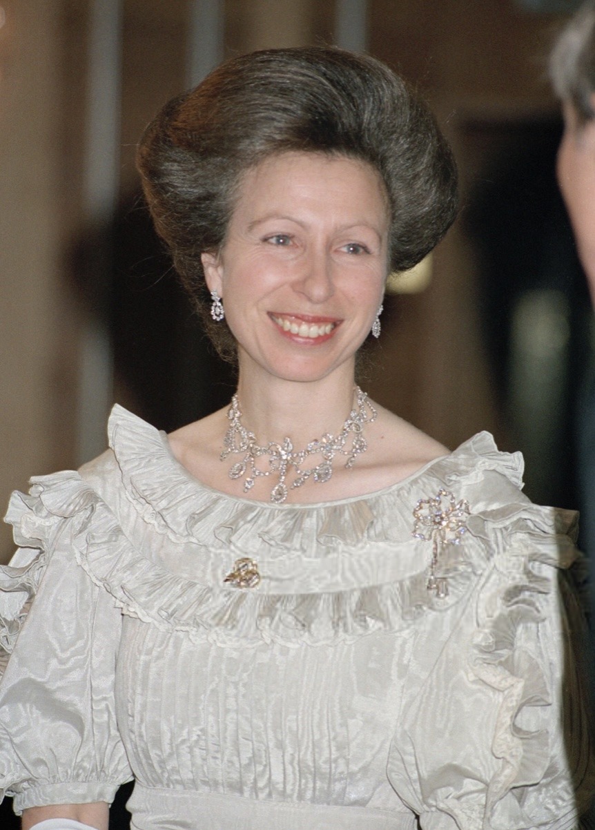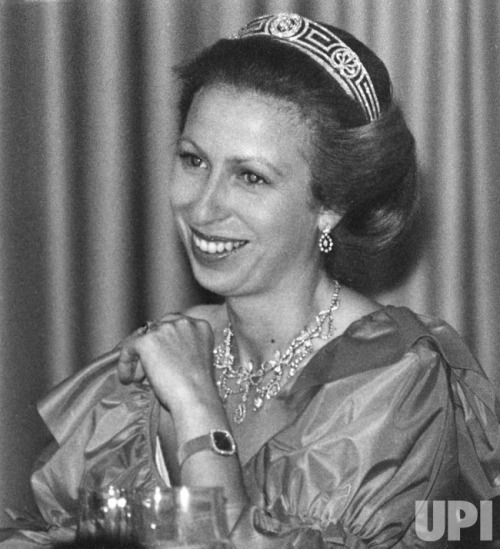 Princess Anne notably wore the Diamond Festoon Necklace with the Festoon Tiara and a Diamond Bow Brooch she received as a Wedding Gift from her brother, for a Banquet during the Swedish State Visit to Britain in 1975, and for the Queen’s Silver Jubilee Gala at Covent Garden in 1977 as well as the Oman State Visit to Britain, the Dutch State Visit to Britain in 1982 and during the Spanish State Visit to Britain in 1986.