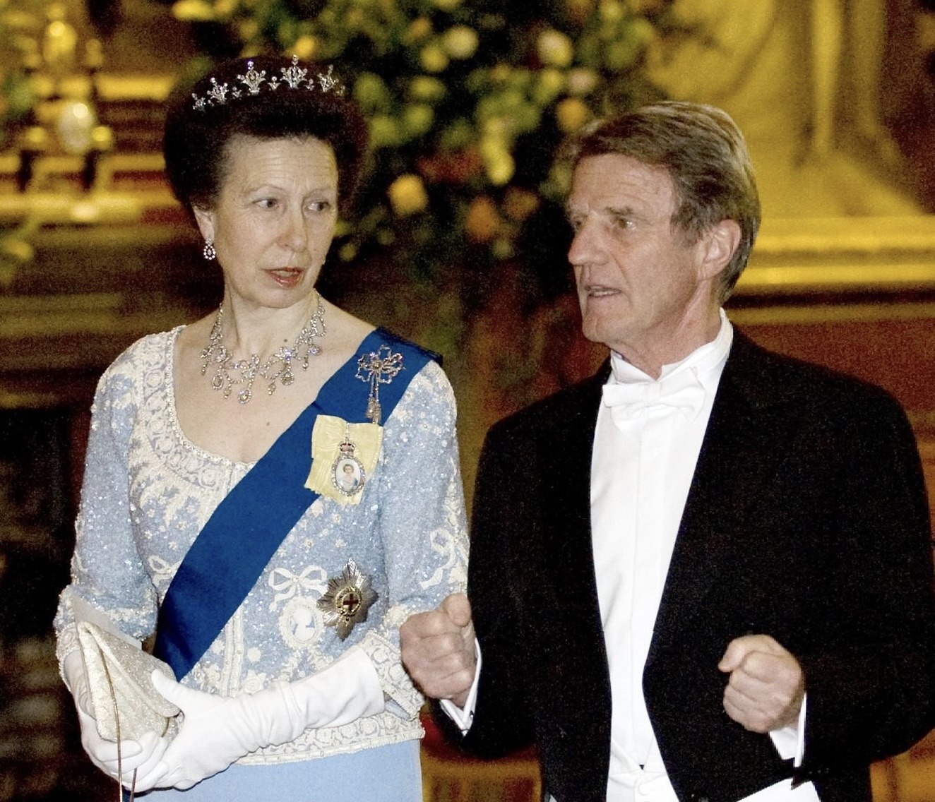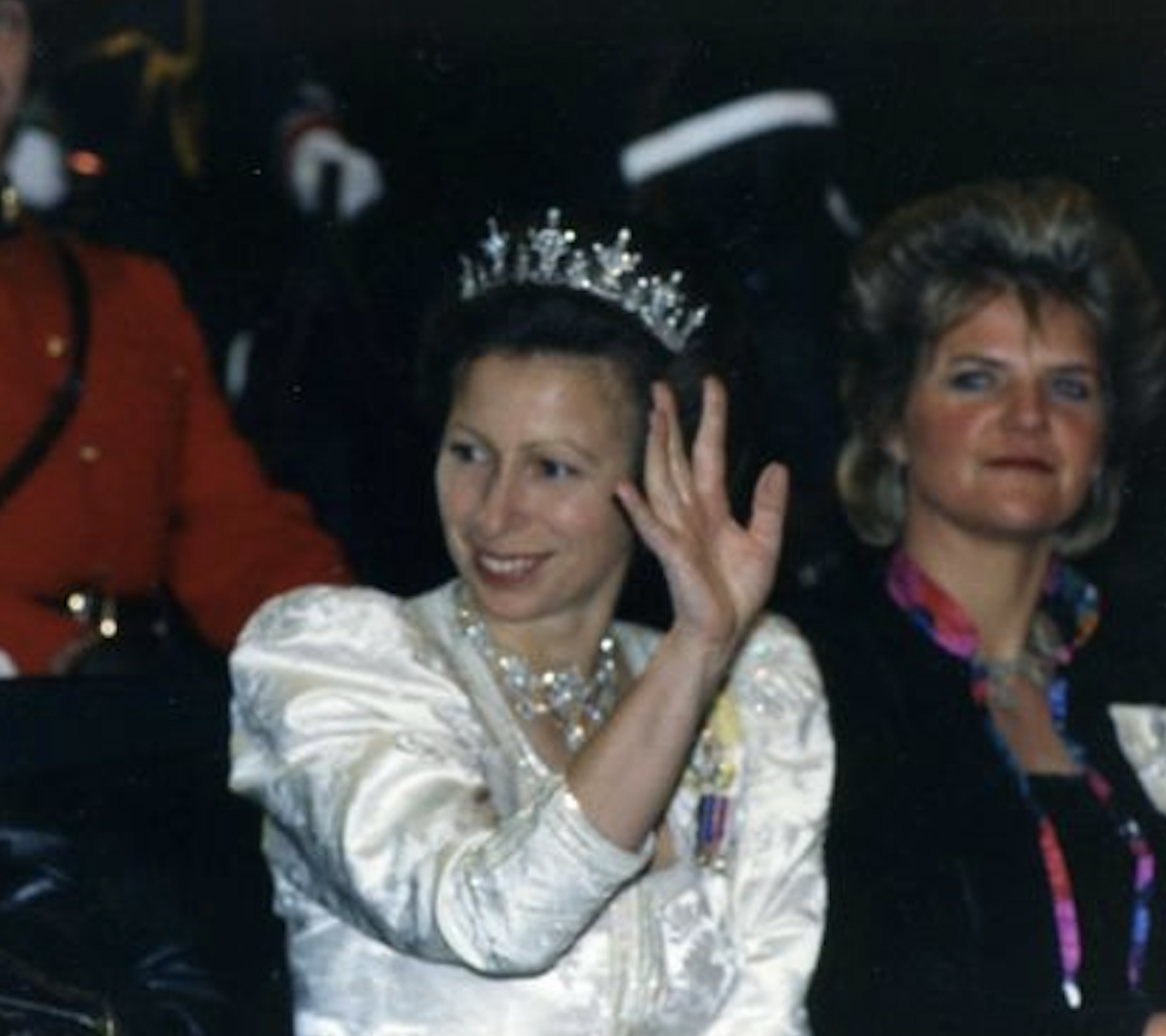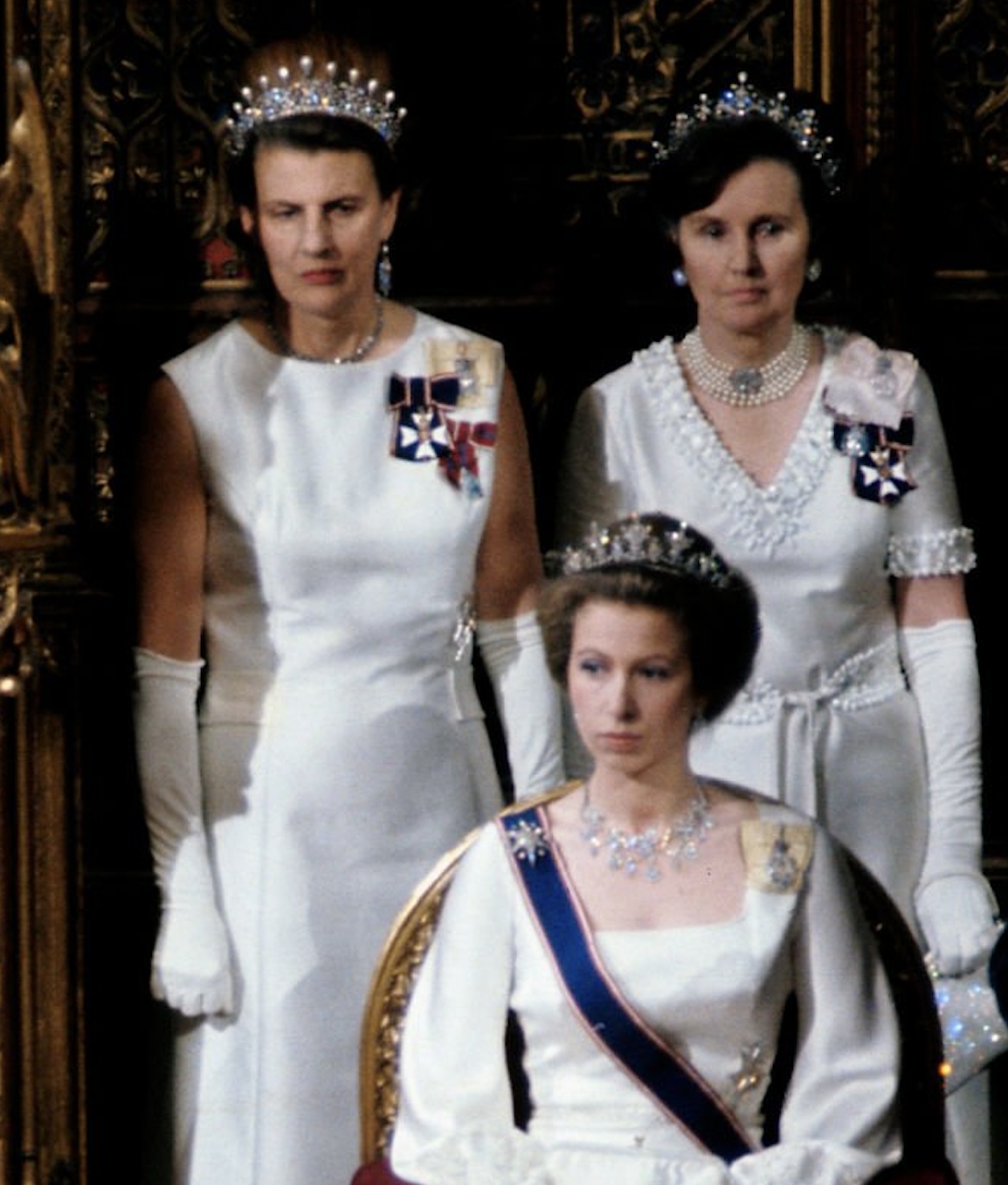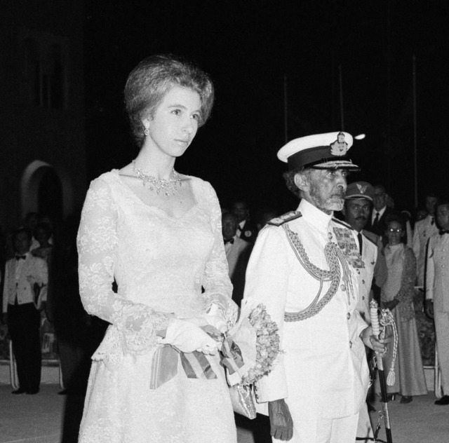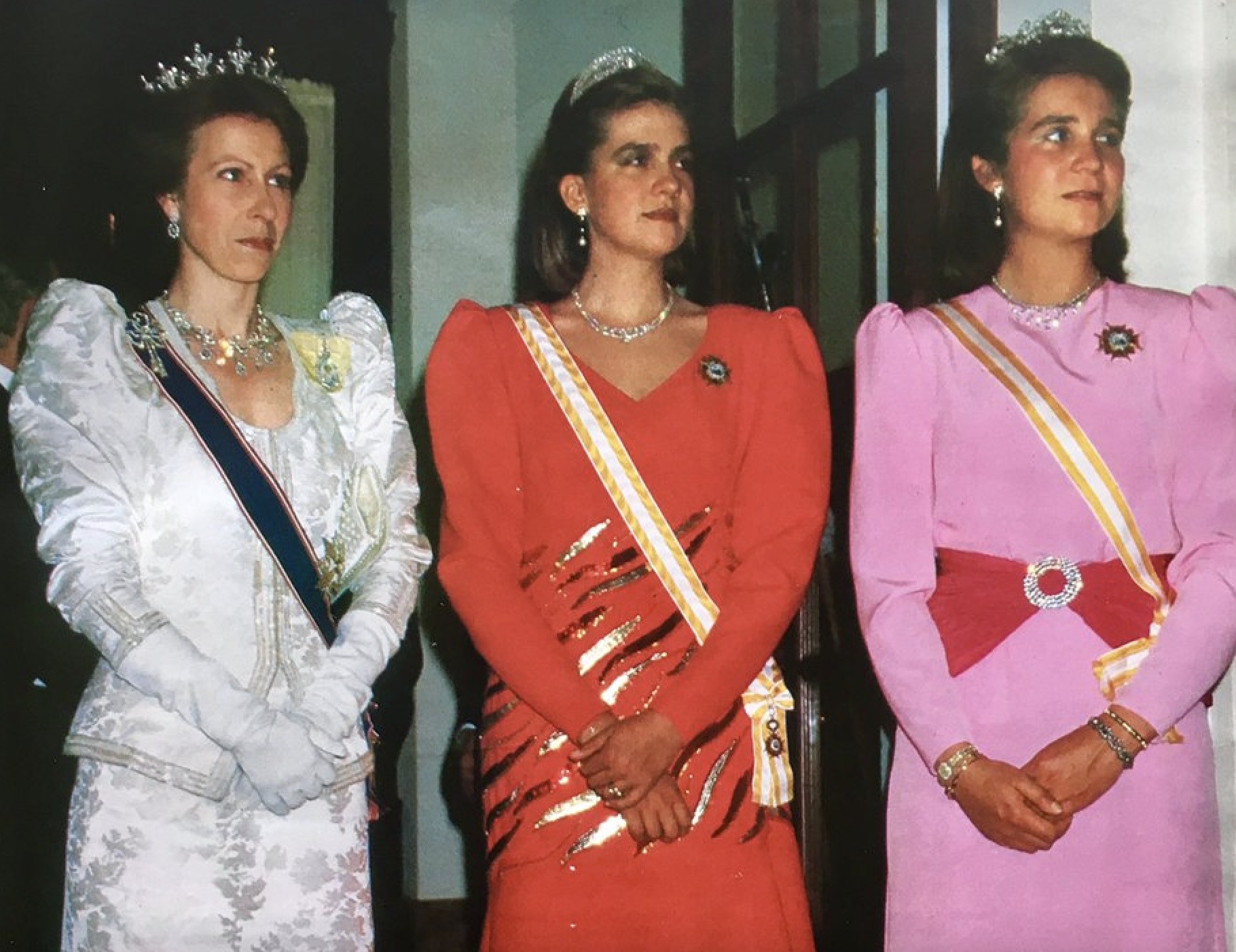 Princess Anne notably wore the Diamond Festoon Necklace with the Festoon Tiara and a Diamond Bow Brooch she received as a Wedding Gift from her brother, for a Banquet during the Swedish State Visit to Britain in 1975, and for the Queen’s Silver Jubilee Gala at Covent Garden in 1977 as well as the Oman State Visit to Britain, the Dutch State Visit to Britain in 1982 and during the Spanish State Visit to Britain in 1986.