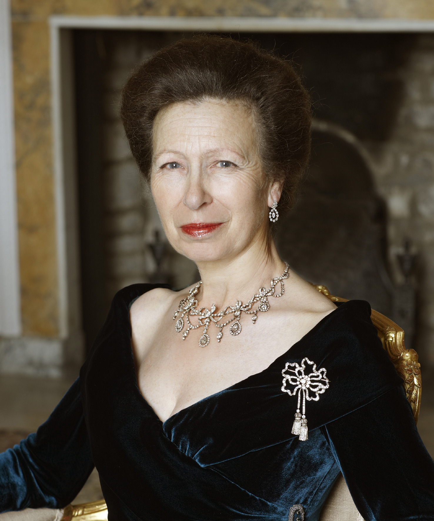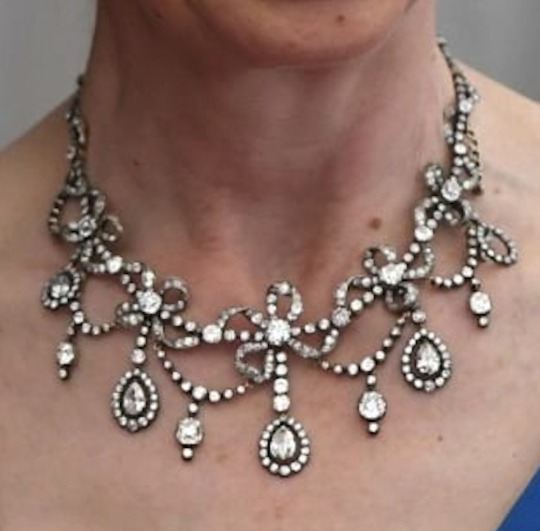 Princess Anne also often wore the Diamond Festoon Necklace with the Diamond Bow Brooch for numerous Black Tie Gala Dinners, notably on a visit to Paris in 1980, the Queen’s Golden Jubilee Dinner at Windsor Castle in 2002, Grand Duke Henri and Grand Duchess Maria Theresa’s Silver Anniversary in 2006, and a series of Official Portraits.