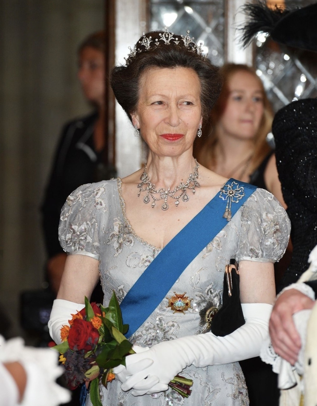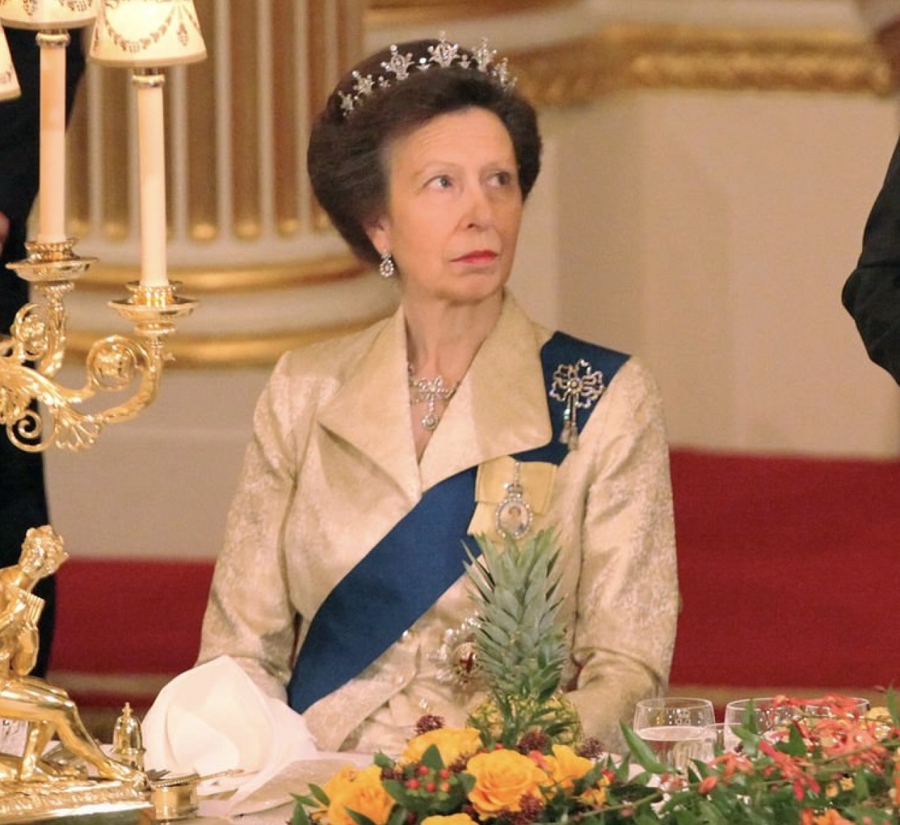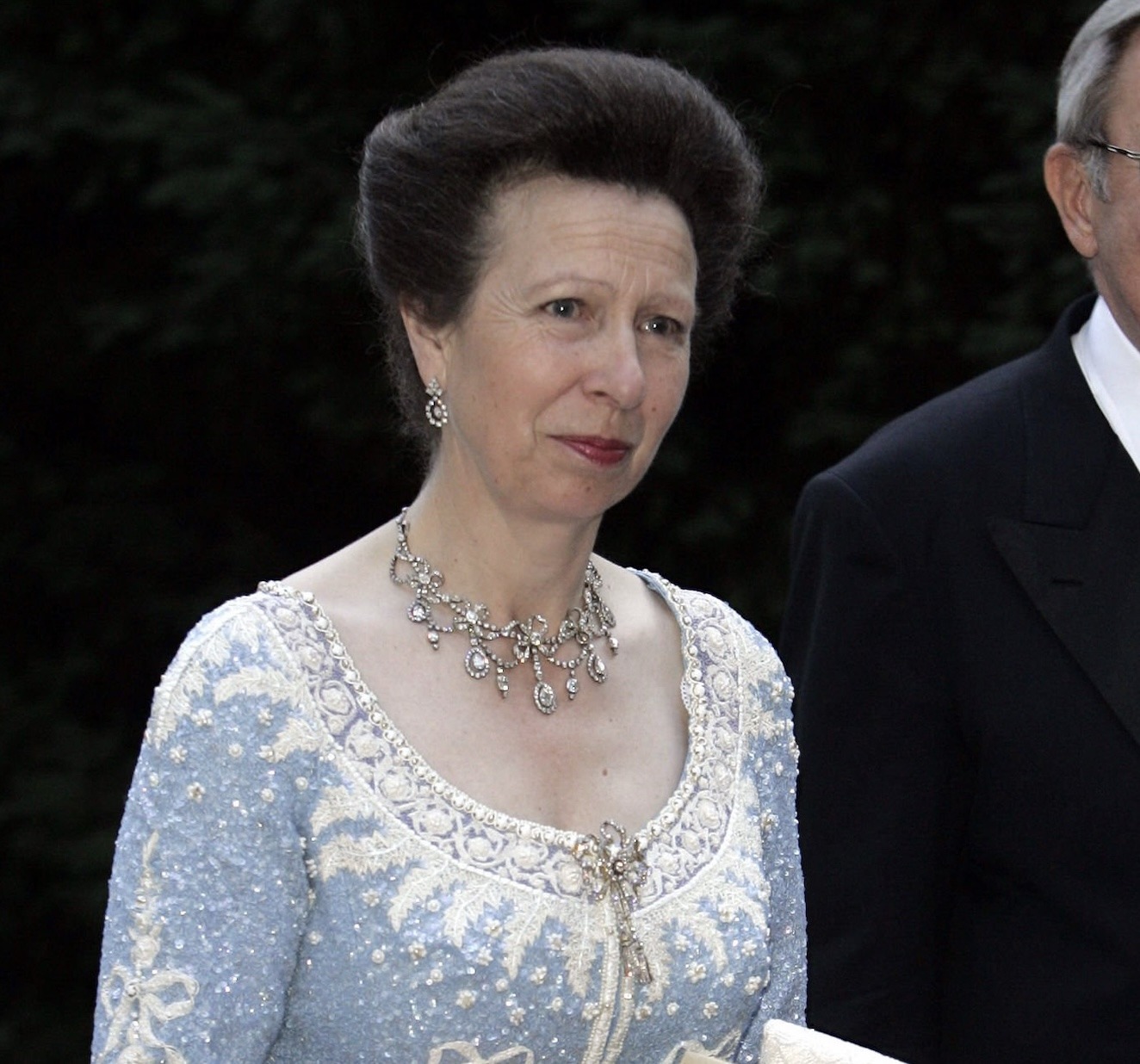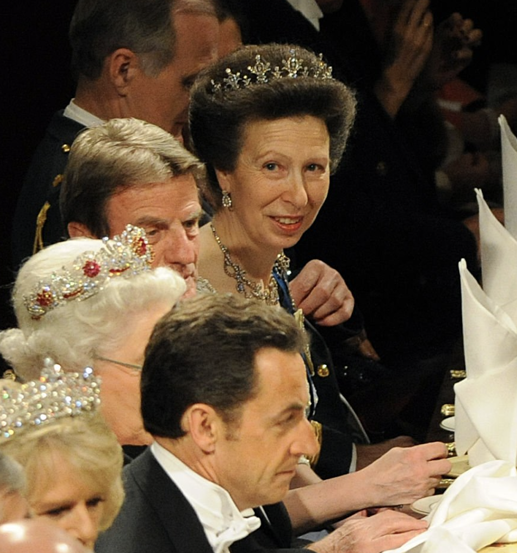 Princess Anne also wore the Diamond Festoon Necklace with the Festoon Tiara for the Jordanian State Visit to Britain in 2001 and during the French State Visit to Britain in 2008, as well as for the Guildhall Banquet held during the Spanish State Visit to Britain in 2017 and the Queen’s Commonwealth Dinner at Buckingham Palace held the following year.