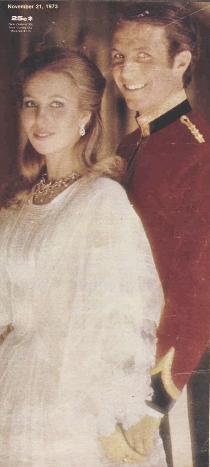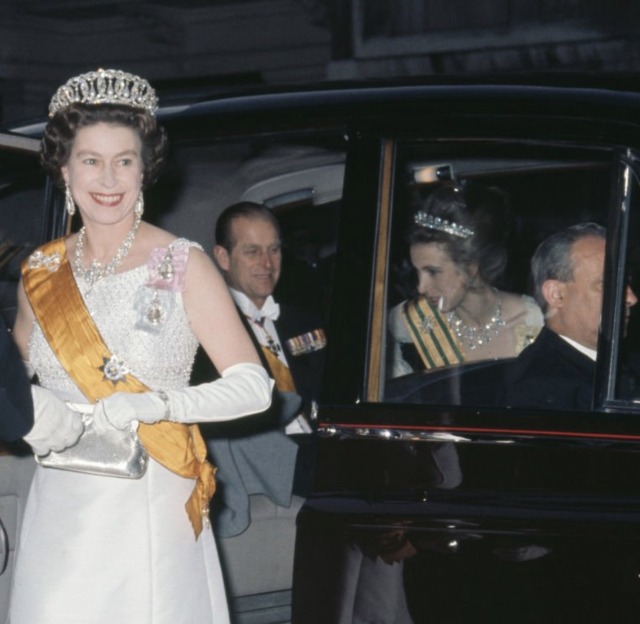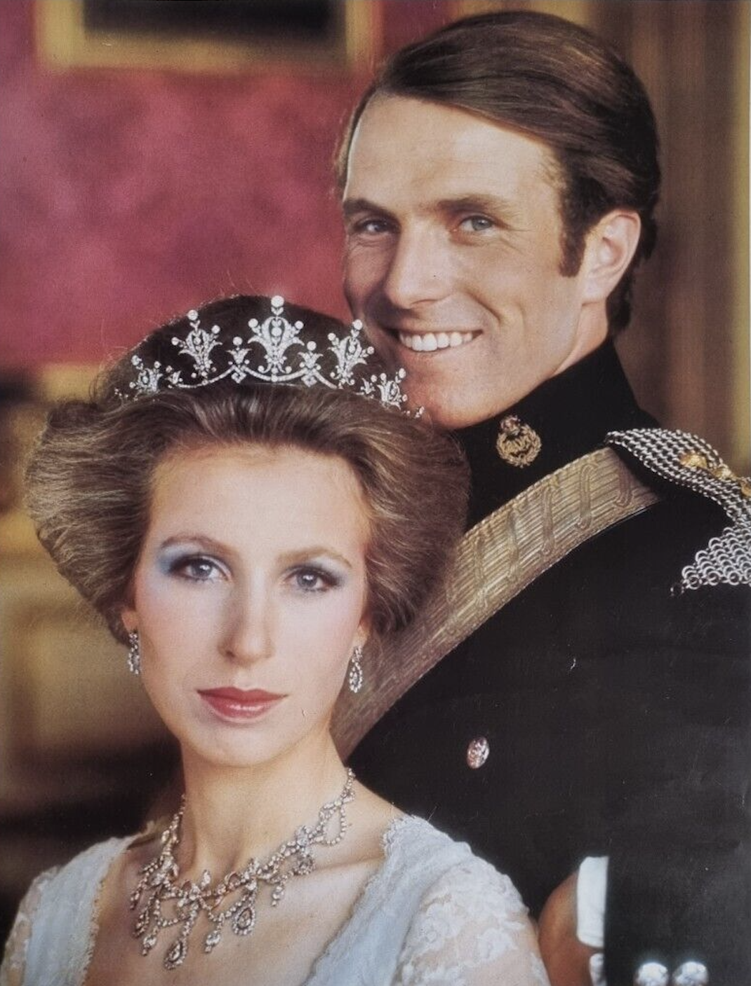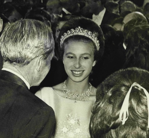In 1973, Princess Anne received her Diamond Festoon Tiara from the World Wide Shipping Group when she christened one of their ships, and it became a lovely ‘married’ parure with the Festoon Necklace, first worn for a series of spectacular portraits taken by Norman Parkinson of her and Mark Phillips at Windsor Castle, released in the weeks leading up to their Wedding in November 1973, and also on the cover of their Wedding Service.