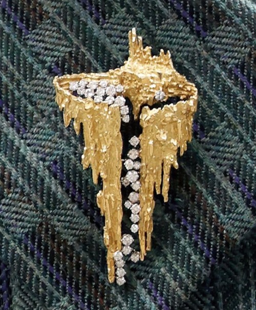 When Princess Anne was marrying Captain Mark Phillips in 1973, she received several spectacular Wedding Gifts, including Cartier Aquamarine Pineflower Tiara from the Queen Mother, a Diamond Bow Brooch from the then Prince of Wales, and a series of jewels from her mother, the Queen, which included Empress Maria Feodorovna’s Sapphire Choker, a pair of Diamond Cluster Earrings, and this striking Gold and Diamond Stalactite Brooch which was described as a “modern 18 carat gold clip brooch in stalactite style set with diamonds,” and was long erroneously believed to have been made by Andrew Grima.
