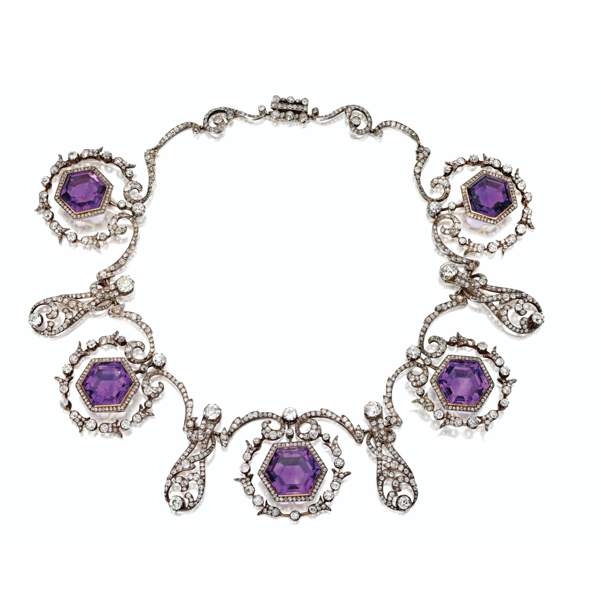 The foliate garlands decorated with 5 hexagonal amethysts set as swing centers within circular wreaths, alternating with pear-shaped scrolls, set with 13 old European-cut diamonds weighing approximately 8.50 carats, 69 old European-cut diamonds weighing approximately 10.00 carats and numerous smaller old-mine and rose-cut diamonds weighing approximately 5.00 carats, mounted in silver and gold. Together with a wood box of octagonal shape stamped on the lid: The Property of Her Majesty The Late Queen Alexandra.