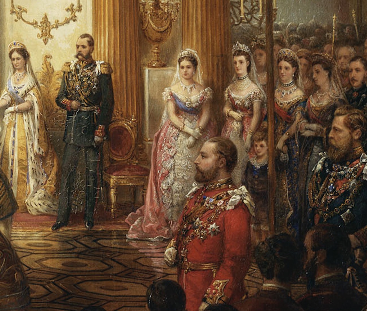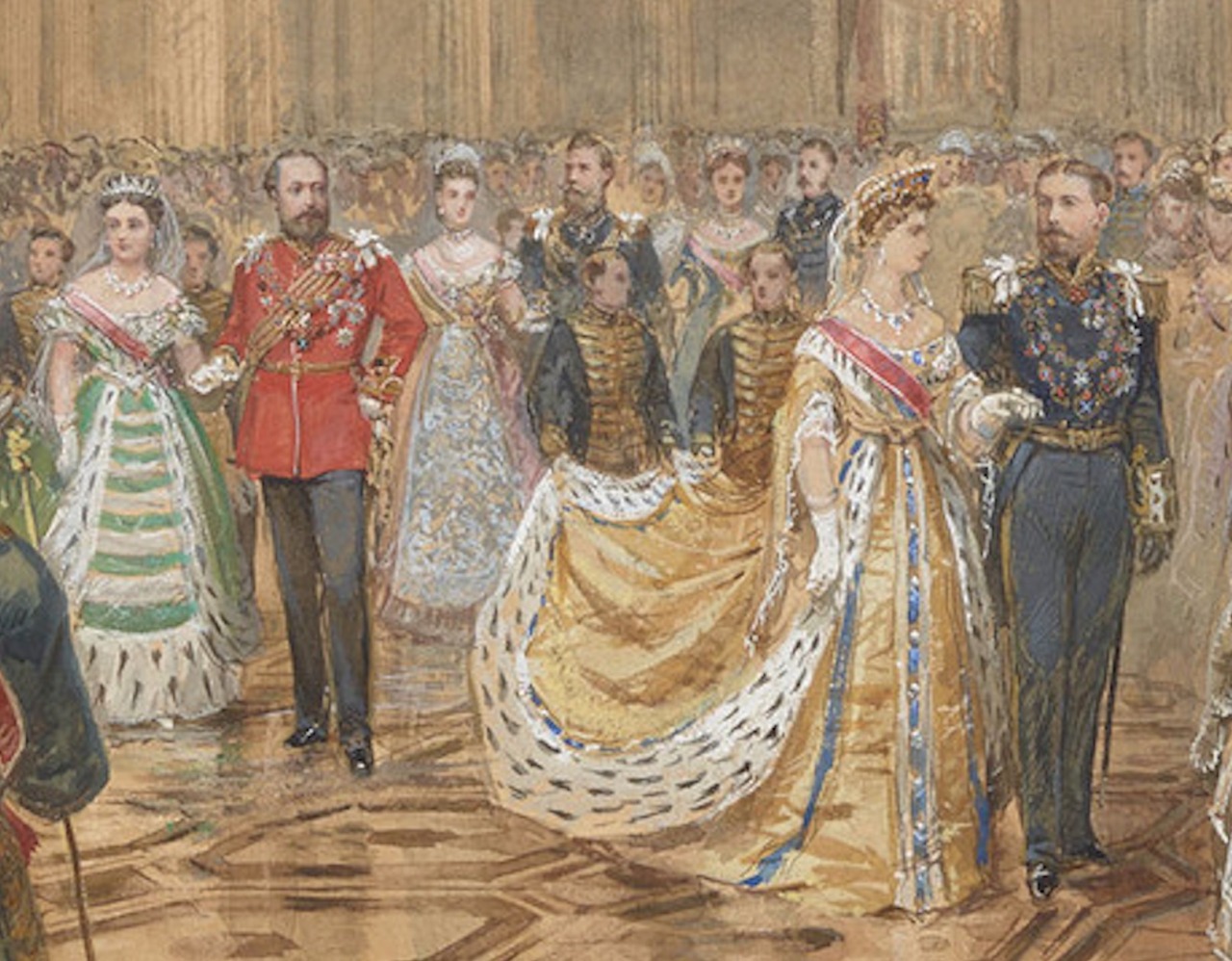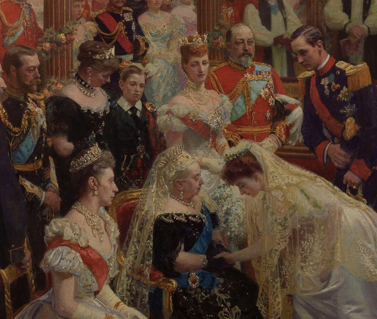 In this evocative study, the sumptuous white brocaded silk of Princess Alexandra’s court dress and the rich crimson velvet of her overskirt, woven with gold embroidery, are minutely described by Chevalier. In the finished work for which this is one of several studies, the Princess of Wales stands next to her sister, Maria Feodorovna, but the accurate details of dress and jewels seen in this study and its two companions were not translated by the artist into the painting of the marriage of Prince Alfred and Grand Duchess Maria Alexandrovna.