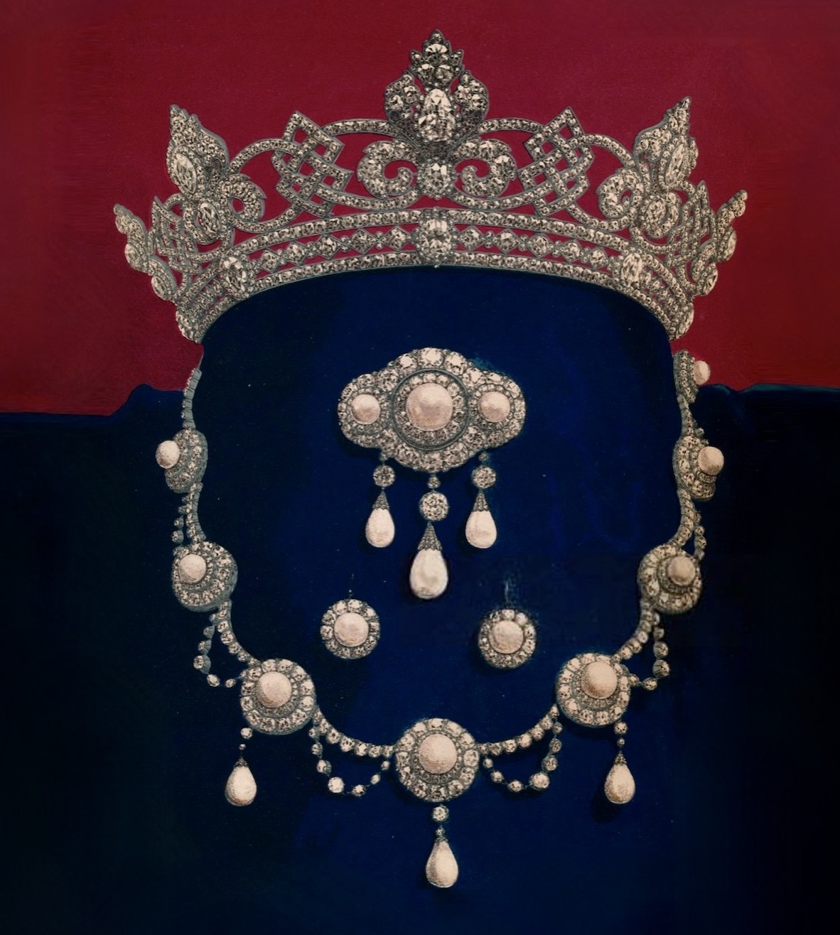 When Princess Alexandra of Denmark married the Prince of Wales, the eldest son of Queen Victoria, in 1863, she received this magnificent Parure as a Wedding Gift from the groom, which consisted of a versatile Diamond Tiara, a grand Pearl and Diamond Necklace, Pearl and Diamond Cluster Earrings, and a Triple Pearl Drop Brooch.