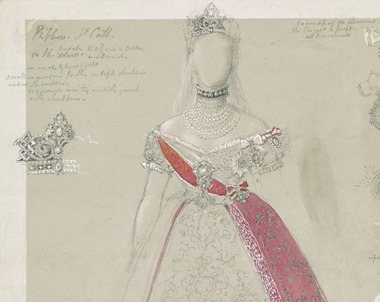Chevalier has taken delight in painting and noting the jewels worn by Princess Alexandra, which include a diamond tiara, a diamond collet necklace on a velvet band, several further diamond collet necklaces, a pearl and diamond necklace, a pearl and diamond brooch, the broad riband, star and badge of the Order of St Catherine, and family orders. The tiara, brooch and pearl and diamond necklace are from the parure of wedding jewellery made by R. & S. Garrard & Co., and given by Albert Edward, Prince of Wales to his bride on their marriage in 1863. While Queen Alexandra’s jewels have largely remained in the ownership of the royal family, and many of them are worn by Her Majesty The Queen today, a large proportion of her wardrobe was dispersed and sold after the death of her unmarried daughter, Princess Victoria. This sketch, together with a large number of photographs in the Royal Collection, provides a valuable record of her uniquely fashionable taste.
