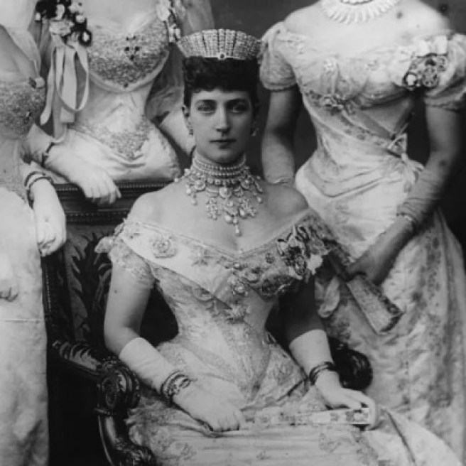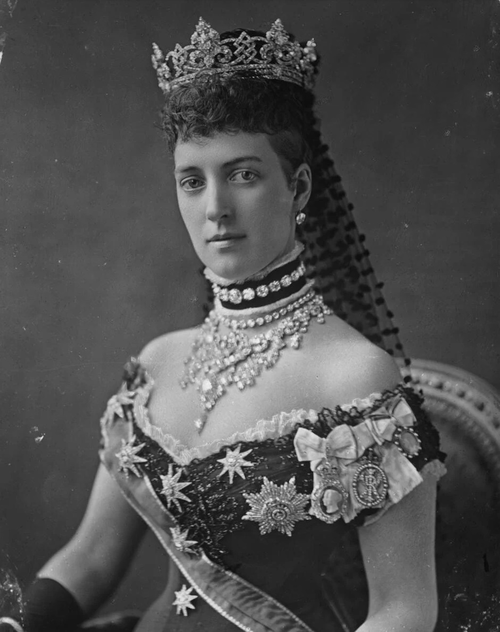 Among the more notable portraits of the Diamond Tiara were a series of portraits of the Princess of Wales taken by Alexander Bassano at 25 Old Bond Street in 1881, paired with a grand Diamond Necklace, from which various Diamond Pendants were suspended.