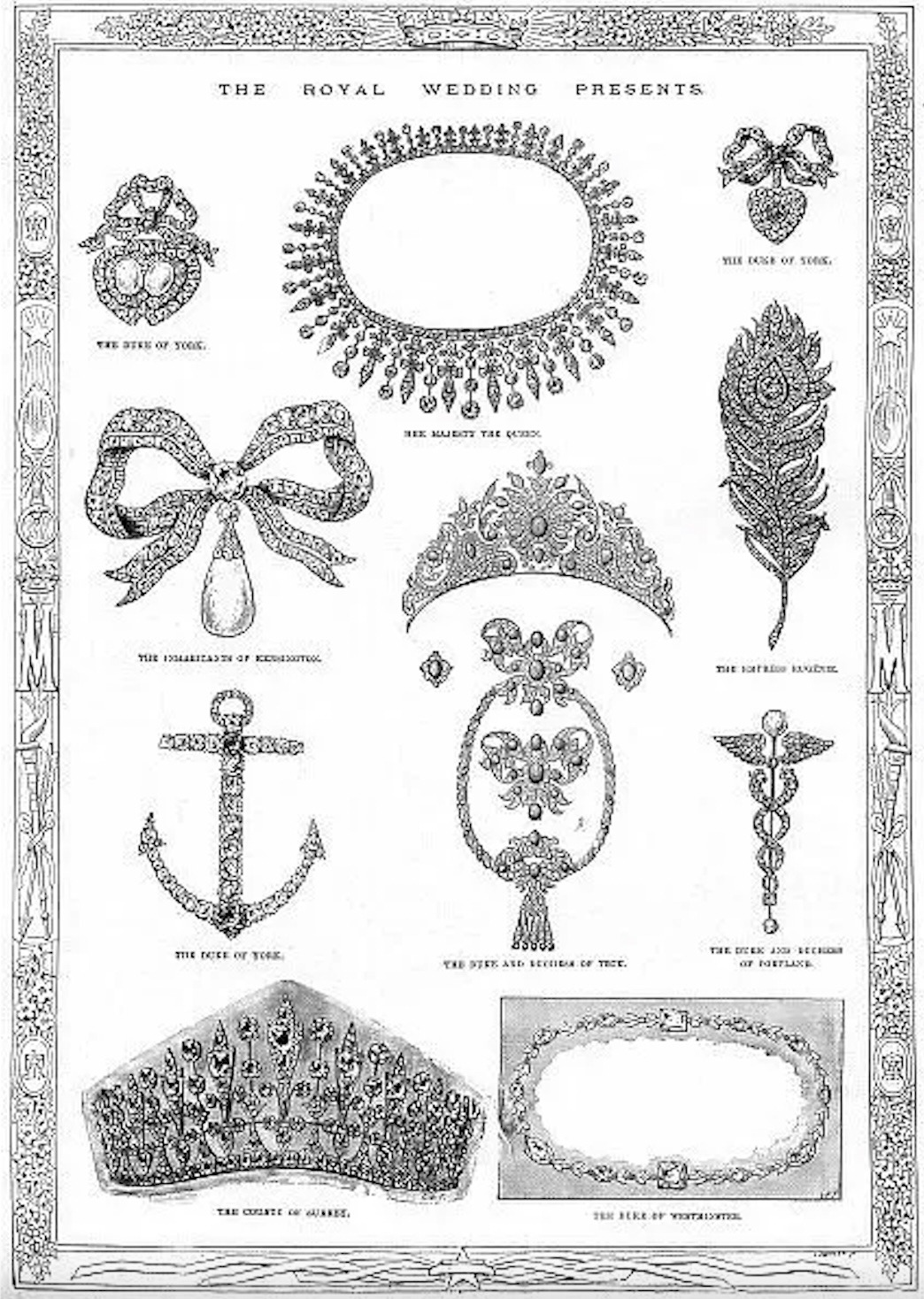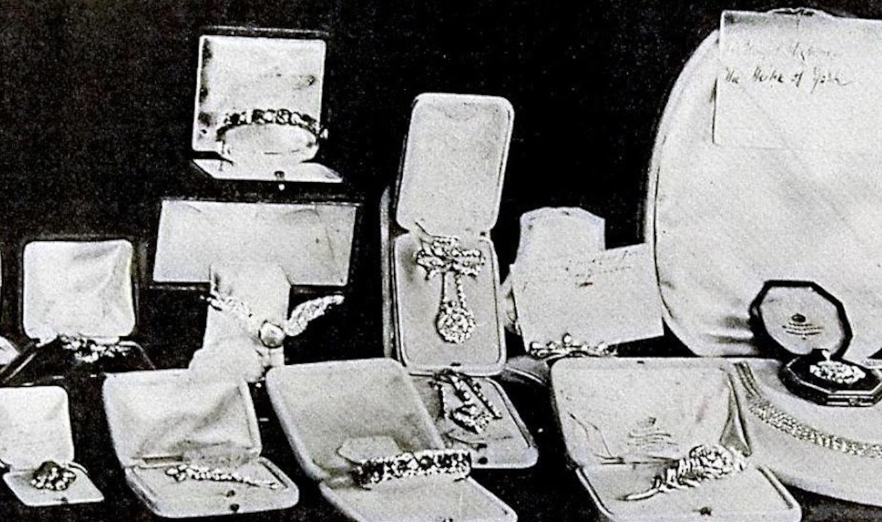 Princess May of Teck received Seven Tiaras, Fifteen Necklaces, Twenty-Six Bracelets, and Forty-Four Brooches among the 130 spectacular pieces of Jewellery given by Family, Friends, Cities, Institutions and Counties from various parts of the United Kingdom and the British Empire when she married her late fiancé’s brother, the future King George V, in the Chapel Royal of St. James’s Palace in 1893.